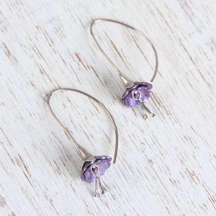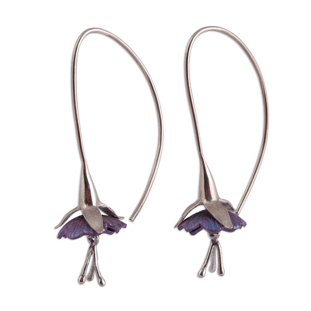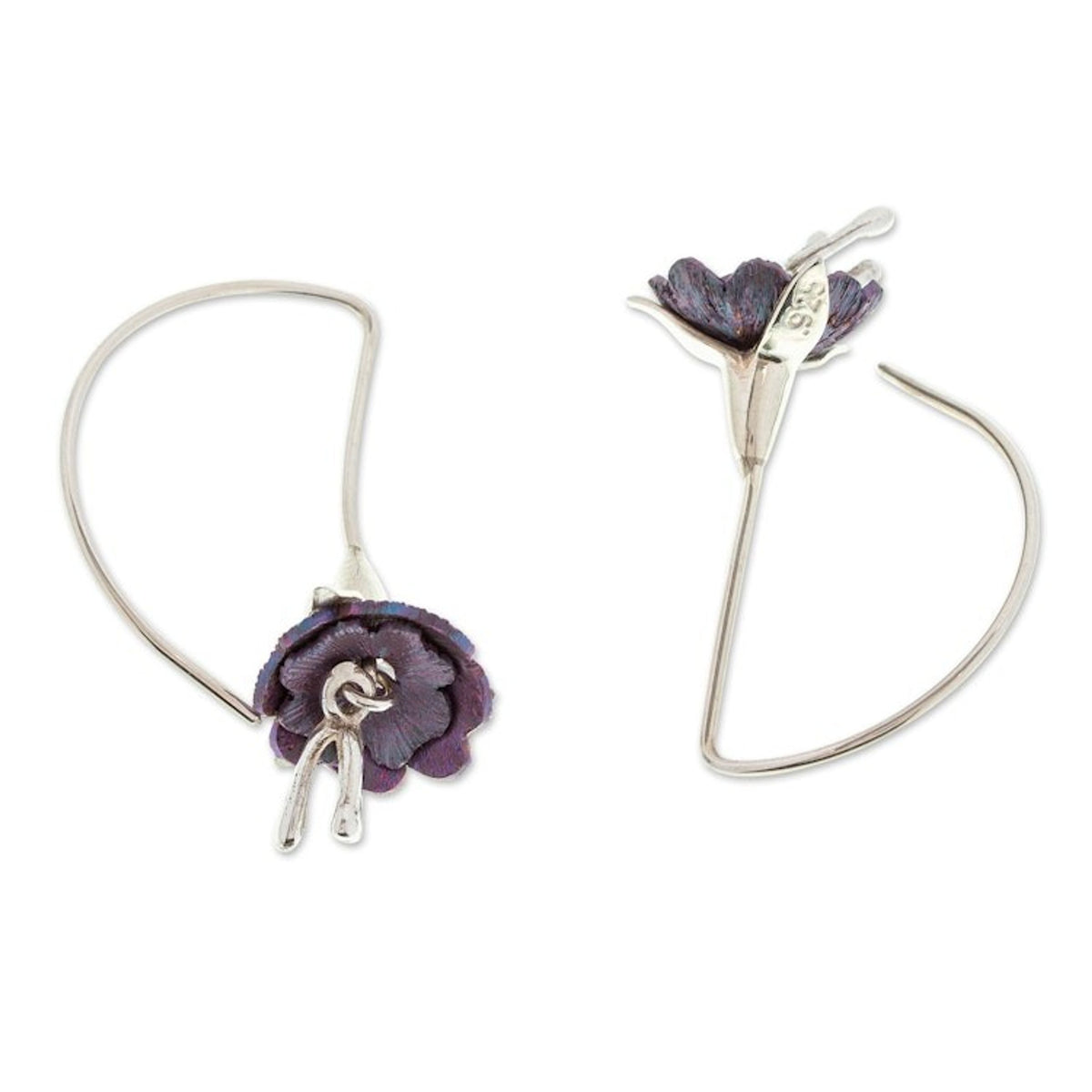 These Floral Titanium Plated Sterling Silver Drop Earrings 'Sleepy Flowers' by Diana Solis are a beautiful and contemporary creation. Handcrafted from sterling silver, two "sleepy flowers" are bathed in a stunning titanium plating, which gives the pieces a lustrous finish and unique coloration. The combination finish adds a sense of depth and dimension, while the design reflects the artisan's passion and exacting craftsmanship. These earrings are an elegant and modern piece, rooted in cultural identity and infused with the spirit of tradition.