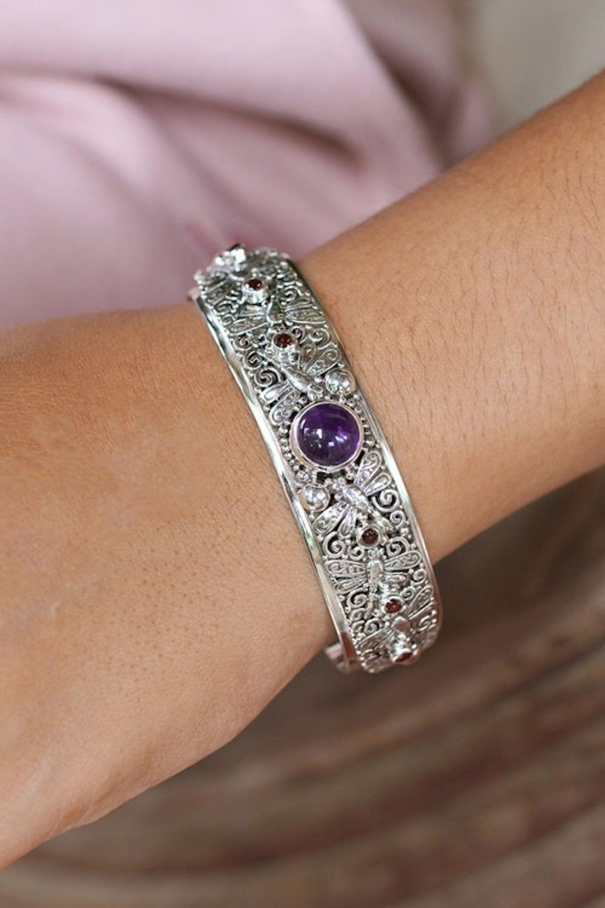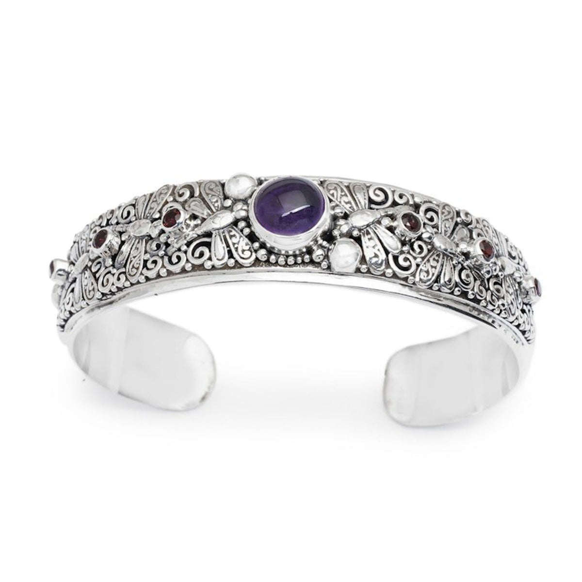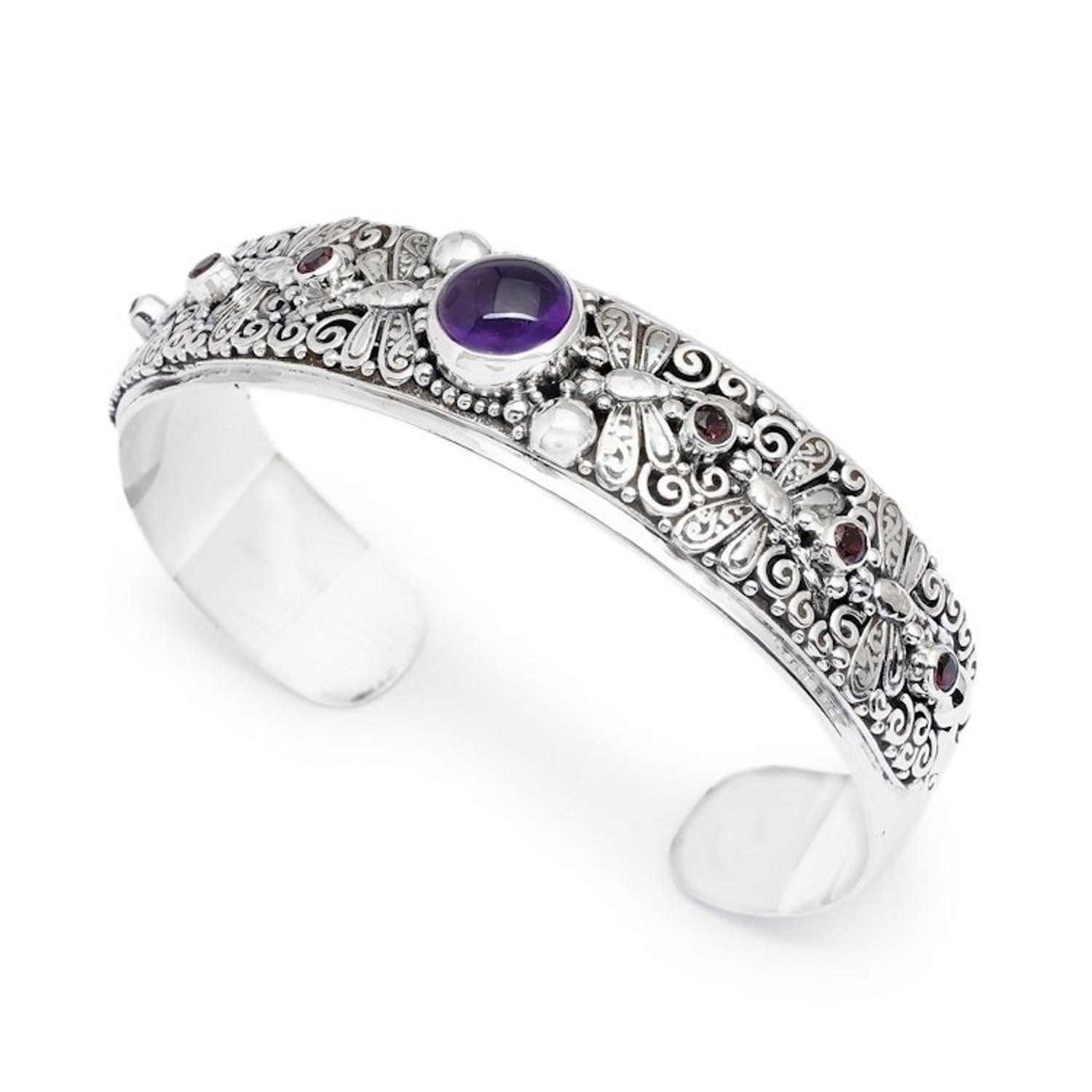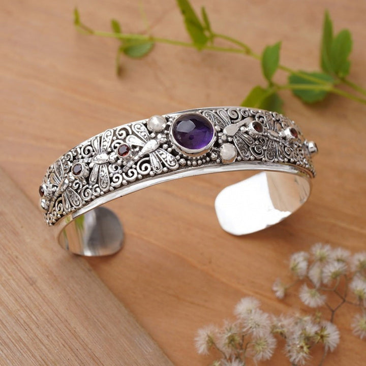 This Folk Art-Themed Amethyst and Garnet Dragonfly Cuff Bracelet 'Dragonfly Arcadia' by I Wayan Buana invites you into a realm of fantasy. Embossed dragonflies flutter around a traditional band, which is adorned with vine motifs and faceted garnet jewels. At the front, an amethyst cabochon enriches the design with purple sparkles of wisdom. The combination of polished and oxidized finishes highlights the intricate details, making this sterling silver cuff bracelet a masterful blend of Balinese culture and the island's natural beauty.