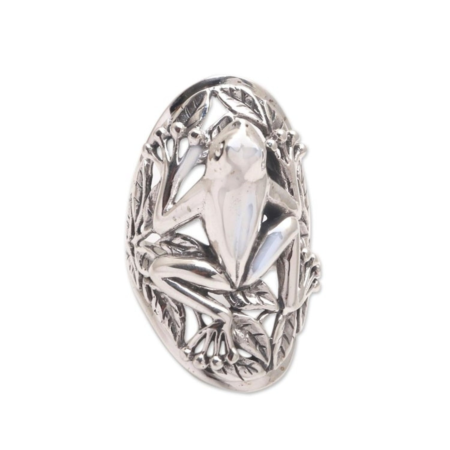 This Frog Sterling Silver Cocktail Ring from Bali 'Ubud Frog' by Nyoman Rena is a whimsical and elegant statement piece. A lovely frog, crafted from sterling silver with a gleaming high-polish finish, appears to be hanging out in a leafy canopy. The large oval panel at the front features a beautiful combination finish that adds texture and depth to the design. This ring is a testament to the artisan's unique style, which blends his carving skills with metalwork to create a piece that captures both Balinese heritage and contemporary design.