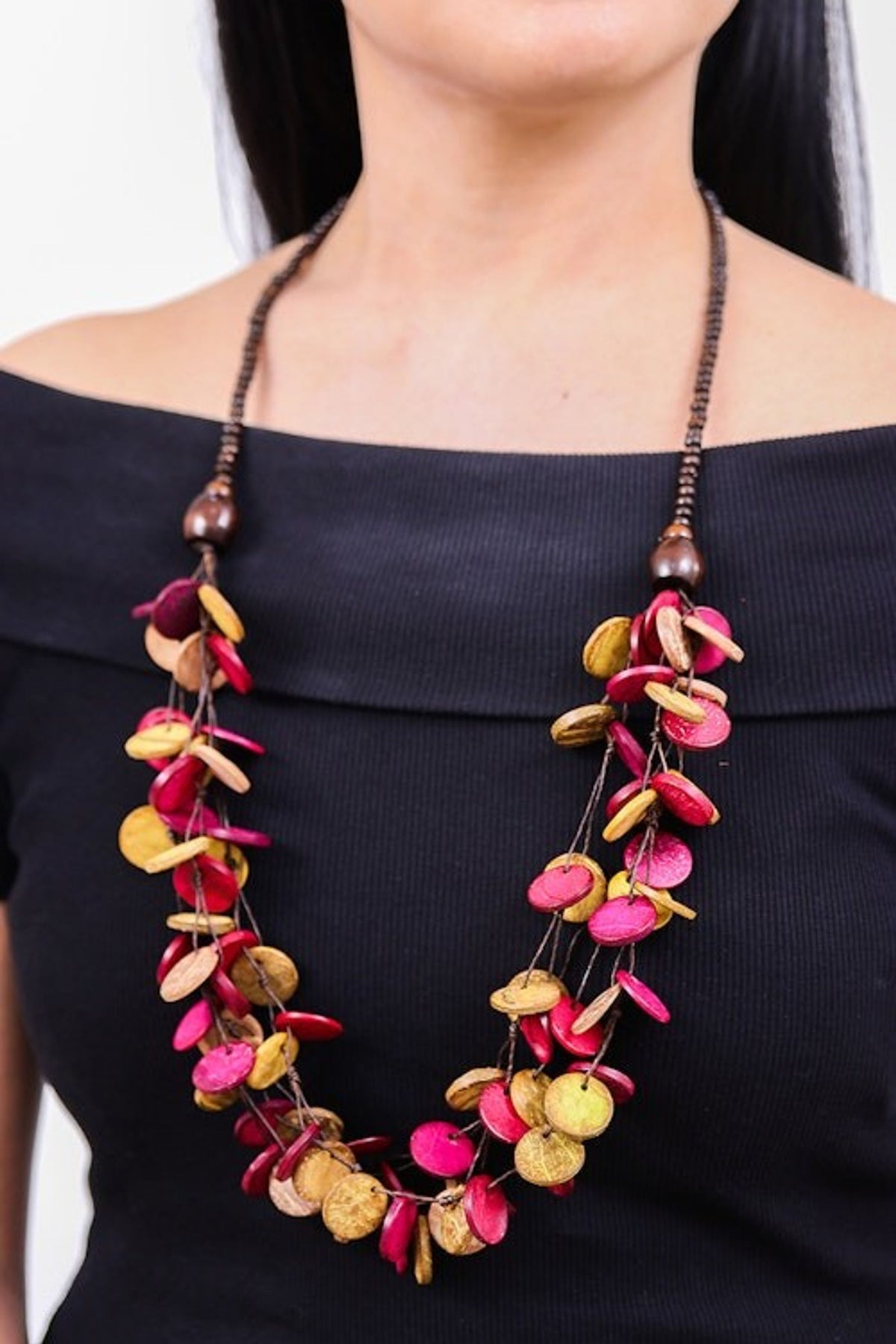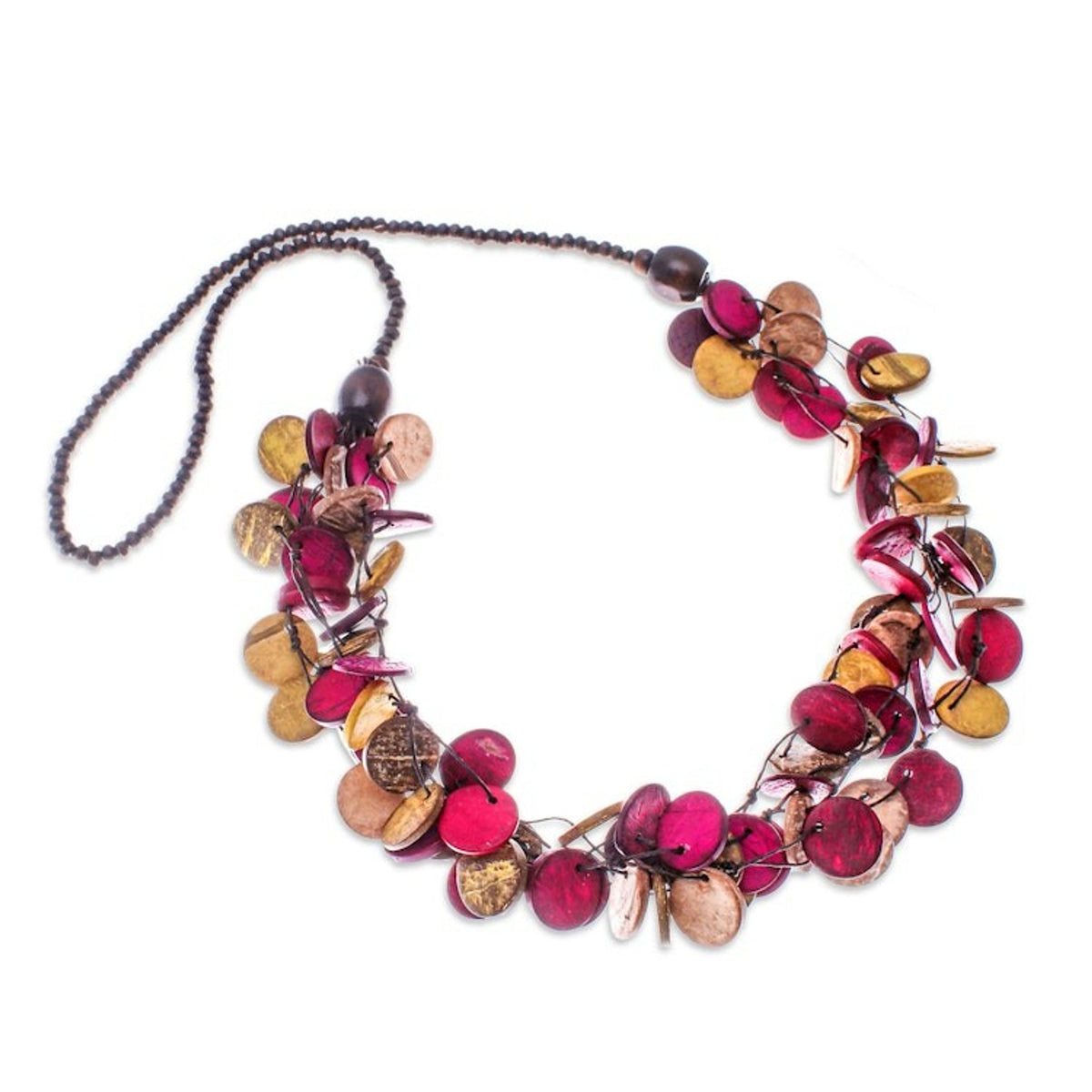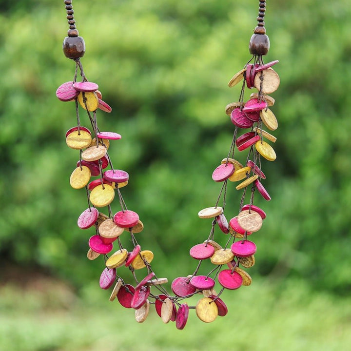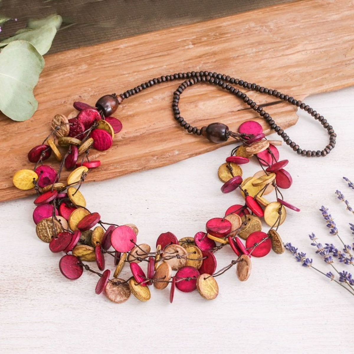This Fuchsia and Golden Round Wood Beaded Three-Strand Necklace 'Cycles of Tenderness' by Sumalee evokes sweet and tender vibes. This three-strand necklace combines little leaf wood beads and coconut shell pieces, all painted in vibrant fuchsia and golden hues. The design reflects the artisan's ability to transform humble materials into vibrant jewelry, while also providing purpose and income for older community members. This piece is a beautiful celebration of Thai craftsmanship and community.