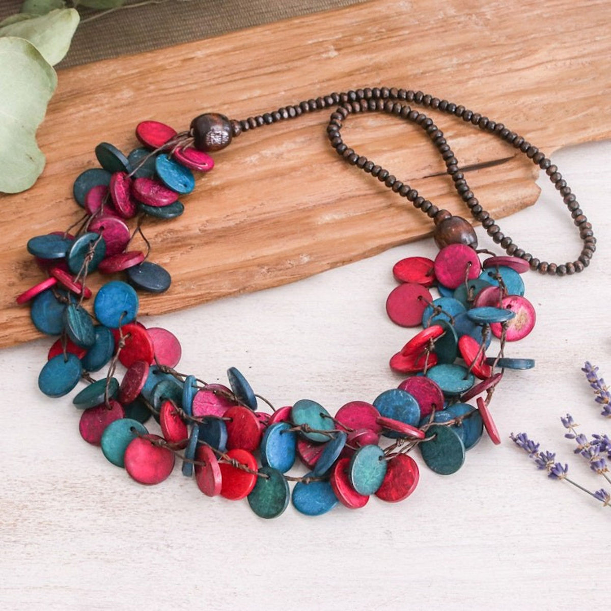 This Fuchsia and Turquoise Round Wood Beaded Strand Necklace 'Cycles of Fantasy' by Sumalee is a charming and whimsical accessory. This three-strand necklace, which combines little leaf boxwood beads and coconut shell pieces, is painted in vibrant fuchsia and turquoise hues. The design is meant to take you to a "charming dream," reflecting the artisan's ability to transform humble beads into vibrant jewelry that uplifts others.