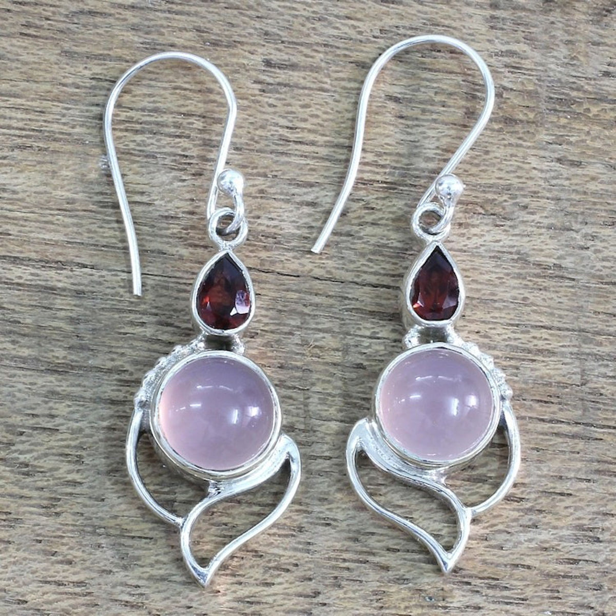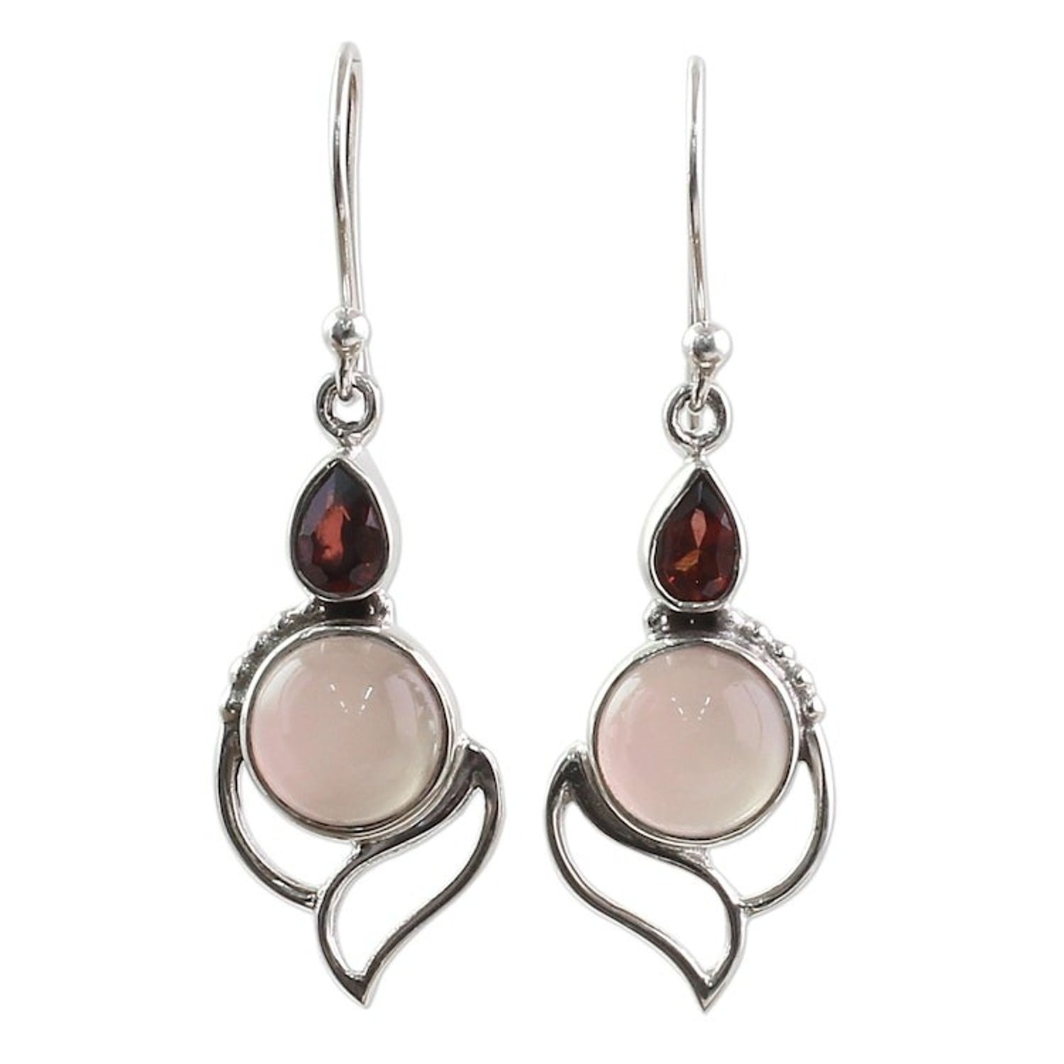 These Garnet and Chalcedony Dangle Earrings 'Pink Crest' by Shanker possess the elegant beauty of nature. Two round stones of dyed chalcedony with a misty pink glow are set below teardrop-shaped garnet stones totaling one carat. The stones are framed by handcrafted sterling silver openwork, creating a delicate and refined piece.