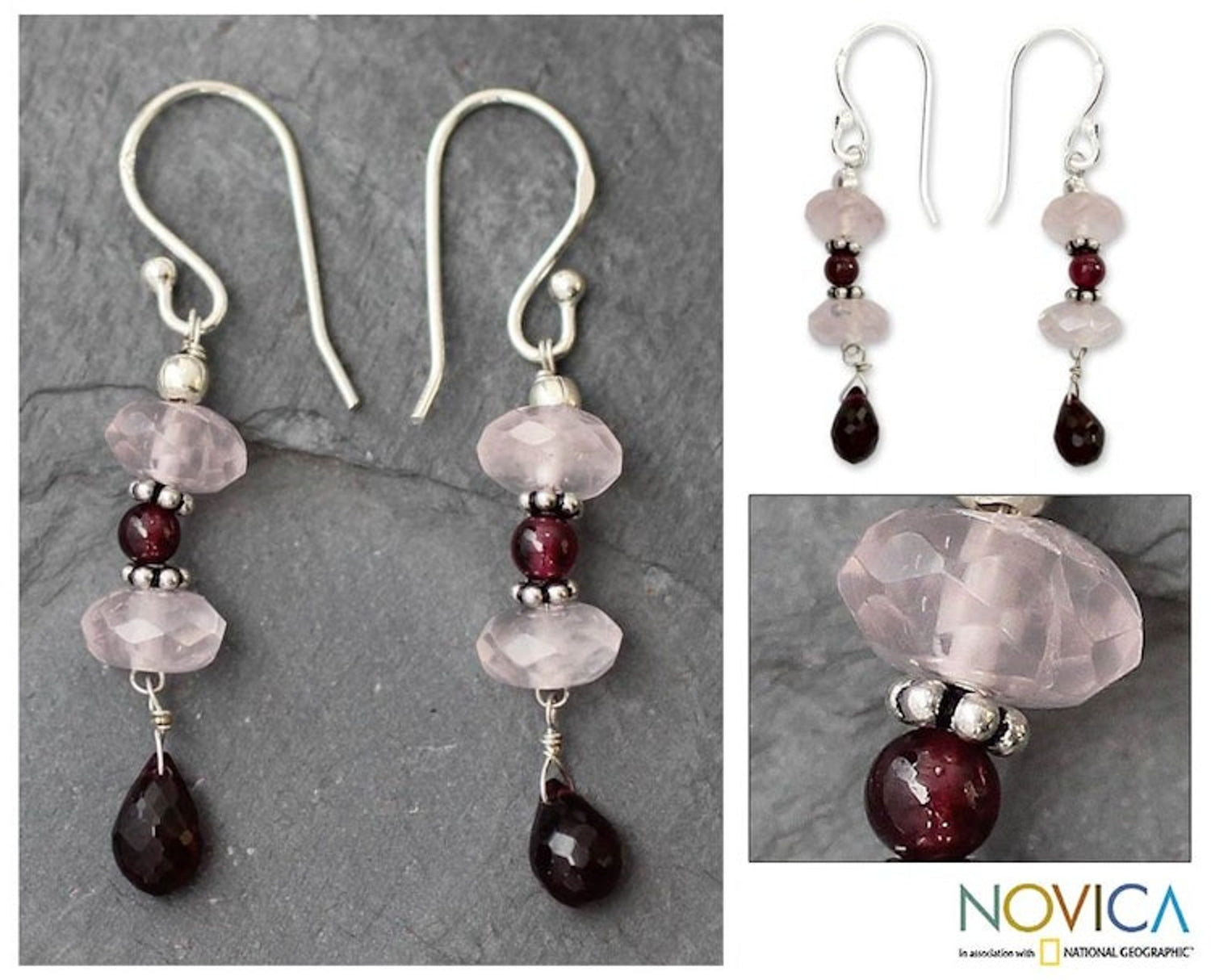 Handcrafted from garnet, rose quartz, and sterling silver with a combination finish. The earrings measure 1.6 inches L x 0.3 inches W x 0.4 inches D with hook earrings. Variations in color and/or pattern are to be expected.