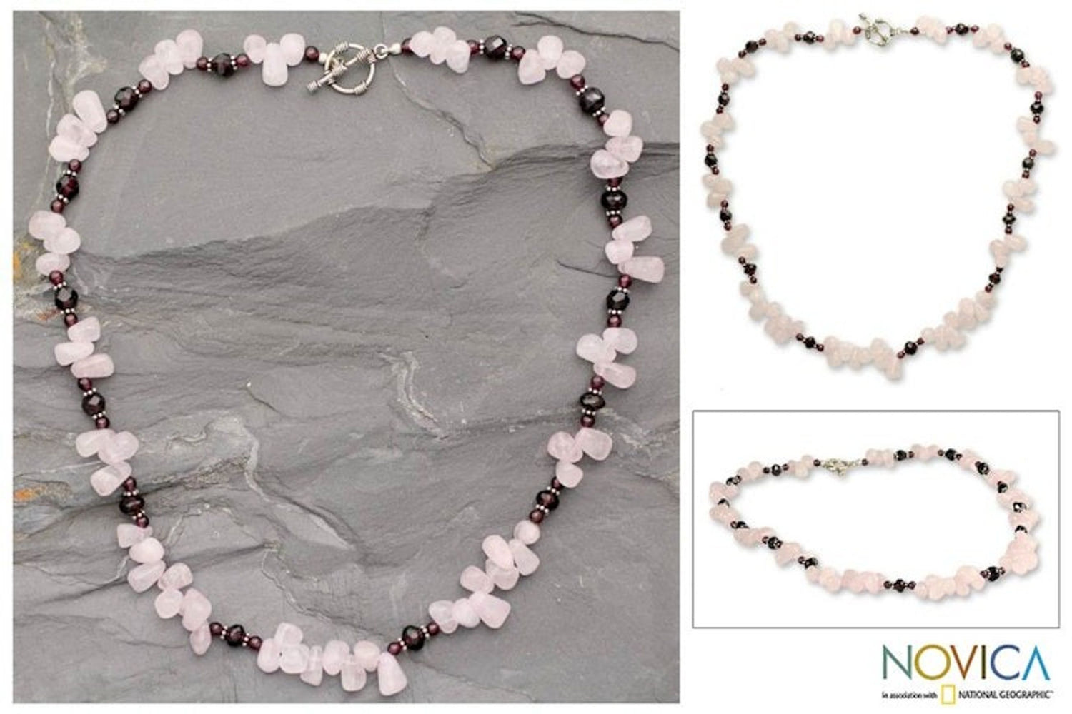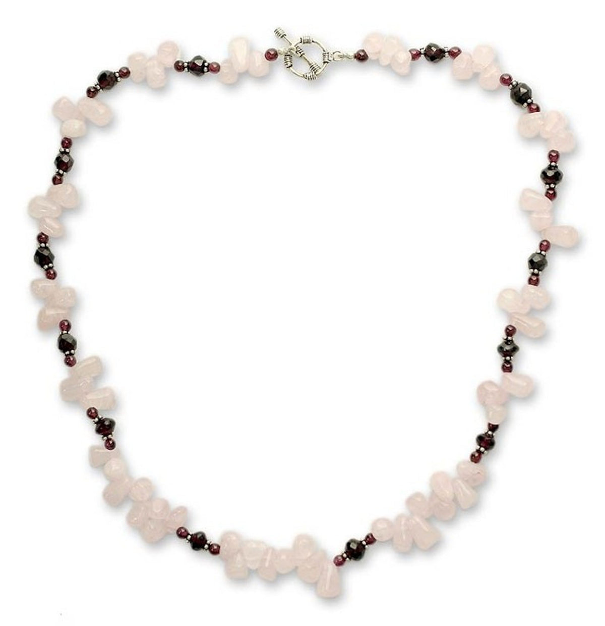 Handcrafted from garnet, rose quartz, and sterling silver with a combination finish. The necklace measures 17.8 inches L x 0.4 inches W. Variations in color and/or pattern are to be expected.