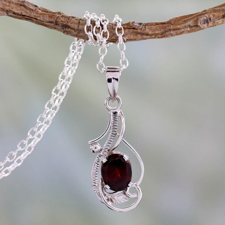 This Garnet and Sterling Silver Fair Trade Necklace 'Sweet Sonnet' by Parul is a beautiful necklace with sterling arabesques that evoke a sweet sonnet. A delightful pendant, set with a faceted 2-carat garnet, hangs from a sterling silver cable chain. The piece blends traditional Indian styles with modern touches, celebrating cultural heritage.