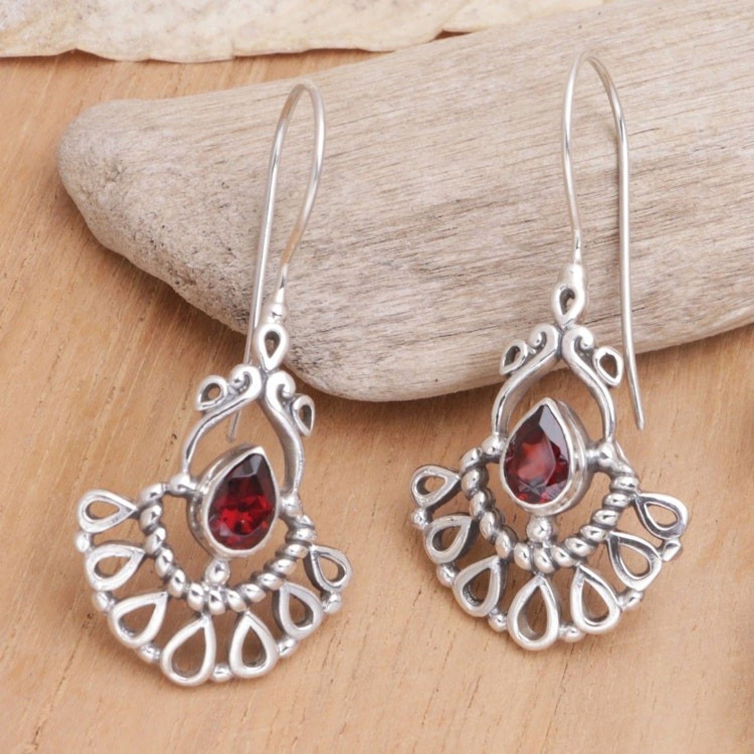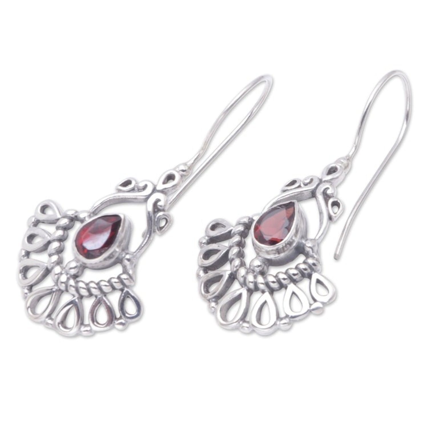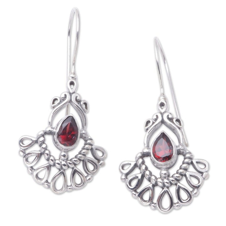 These Garnet dangle earrings 'Frozen Flame' by Yuniati are an elegant and fascinating design. Flames that are frozen in sterling silver feature garnet embers. The piece is a testament to the artisan's ability to blend nature's beauty with cultural artistry.