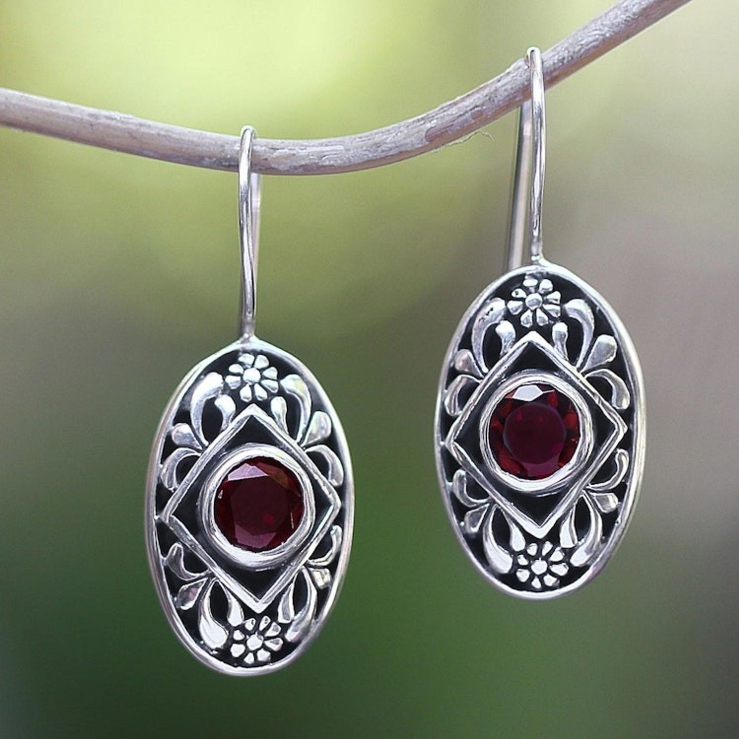 Handcrafted from sterling silver and garnet with a combination finish. The earrings measure 1.2 inches L x 0.4 inches W with hook earrings.
