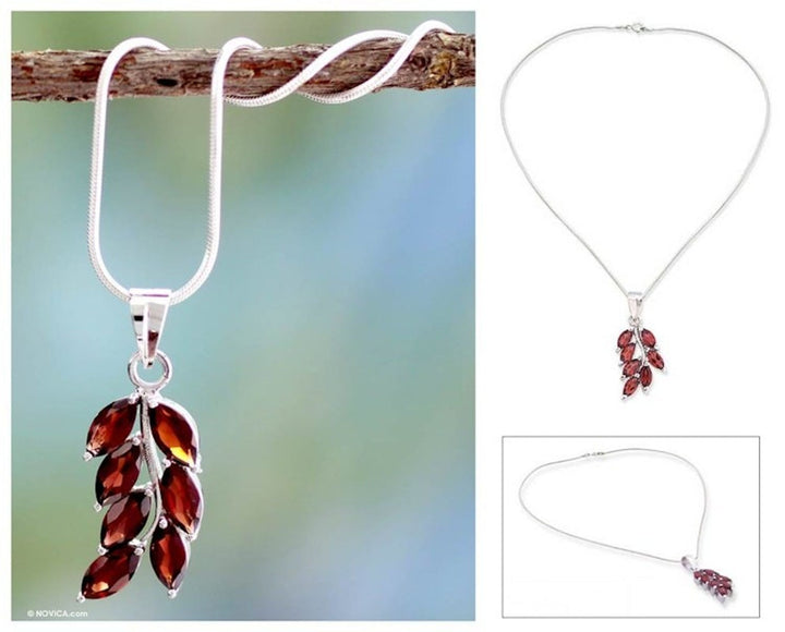 This Garnet flower necklace 'Scarlet Blaze' by Parul is a fabulous pendant where garnet embers are ablaze. The design matches the garnet's bright intensity with the glistening elegance of the rhodium-plated sterling silver setting and snake chain. The piece blends traditional Indian styles with modern touches.
