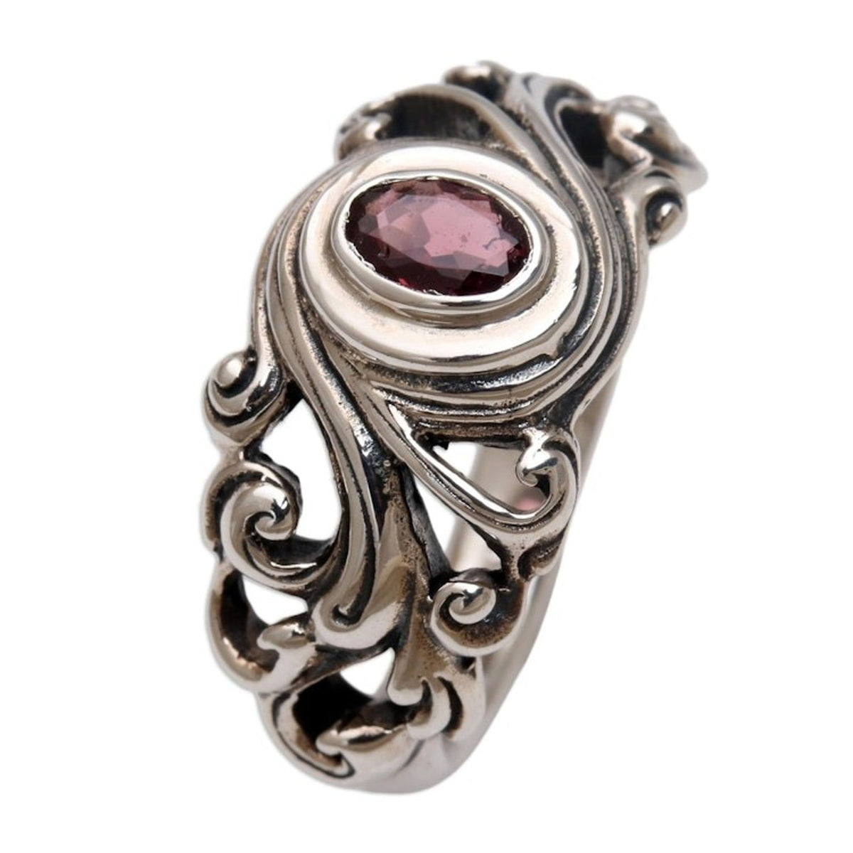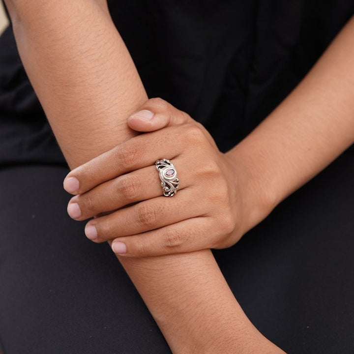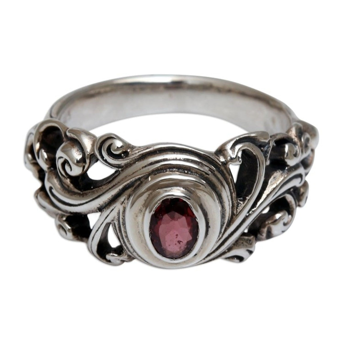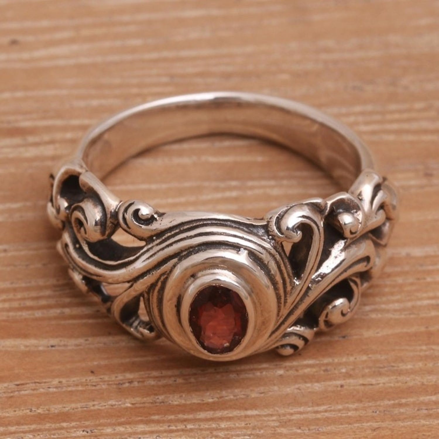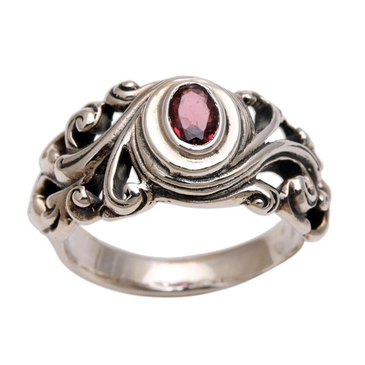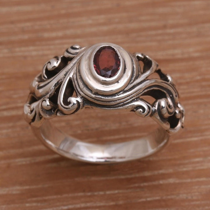 This Garnet Solitaire Ring 'Good Morning' by Independent Artisans evokes the radiant beauty of a Balinese sunrise. Handcrafted by third-generation artisan Rena, this ring captures the essence of his distinctive style, blending traditional Balinese heritage with a contemporary design. The detailed sterling silver band is expertly shaped to create a unique and captivating backdrop for the central garnet gem, which radiates with sophisticated, captivating color. Its design, inspired by the sun breaking through the clouds, makes it a powerful symbol of new beginnings and the promise of a fresh start. Each ring is a testament to Rena's lifelong dedication to his craft, passed down from his grandfather, and makes for a perfect everyday statement piece that carries a deeper, more personal meaning.