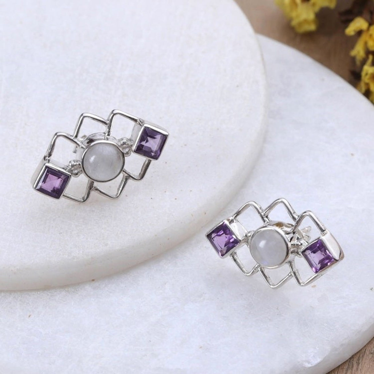 These Geometric Amethyst and Rainbow Moonstone Button Earrings 'Charismatic Harmony' by Independent Artisans are a beautiful tribute to ancient Indian artistry and modern design. Designed by Narayani, these sterling silver button earrings feature a trendy geometric theme that echoes the intricate mosaics of ancient Indian palaces. The polished silver provides a radiant setting for the amethyst and rainbow moonstone gems, which symbolize charisma and create a harmonious, enchanting look. This pair is a testament to the idea that it’s never too late to pursue a passion, reflecting the artisan’s own creative journey and love for gemstones.