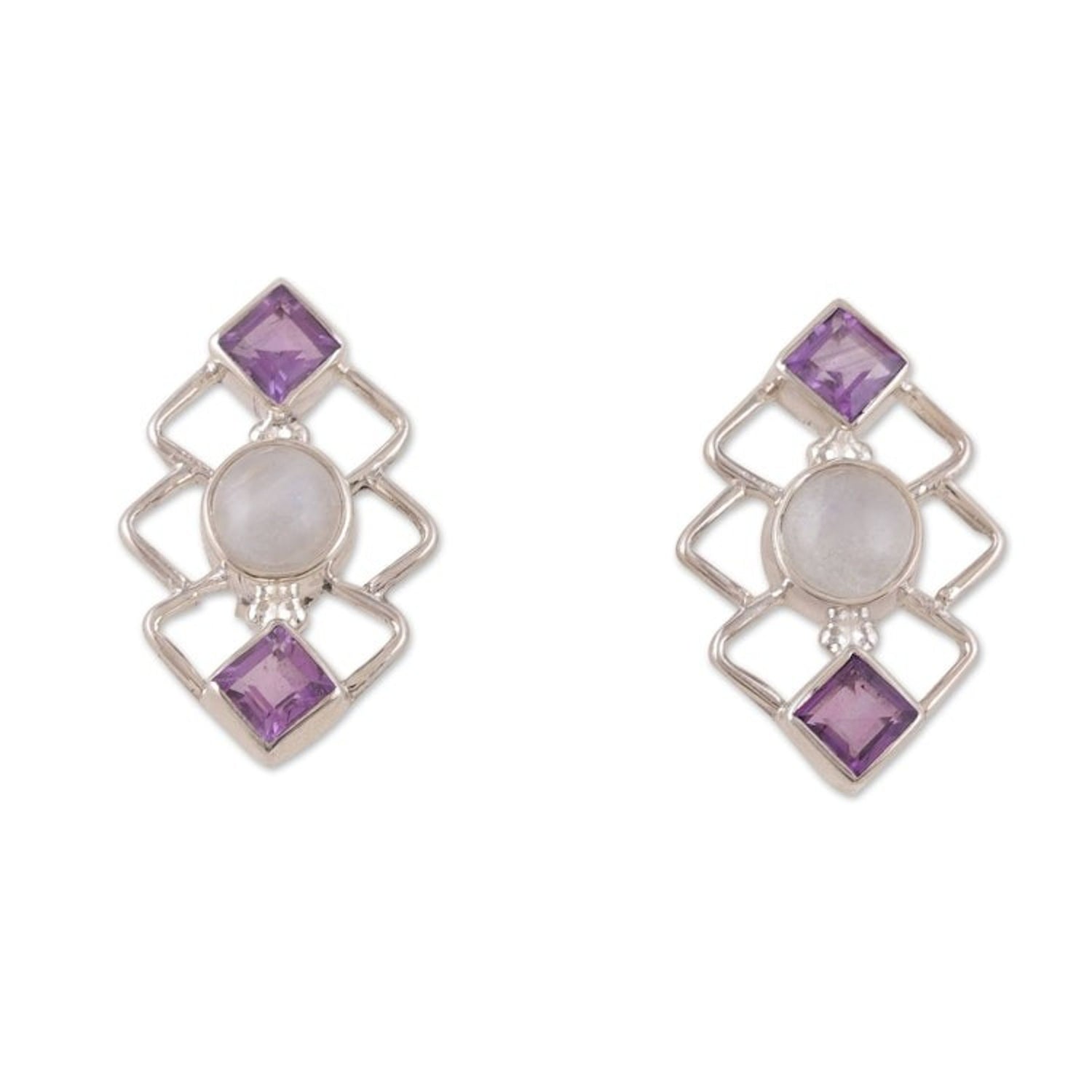 Crafted in India, these post earrings are made from .925 sterling silver with amethyst and rainbow moonstone gemstones that total two carats. They measure 0.9 inches long by 0.6 inches wide by 0.3 inches deep and have a high polish finish. The stones' colors may vary slightly.