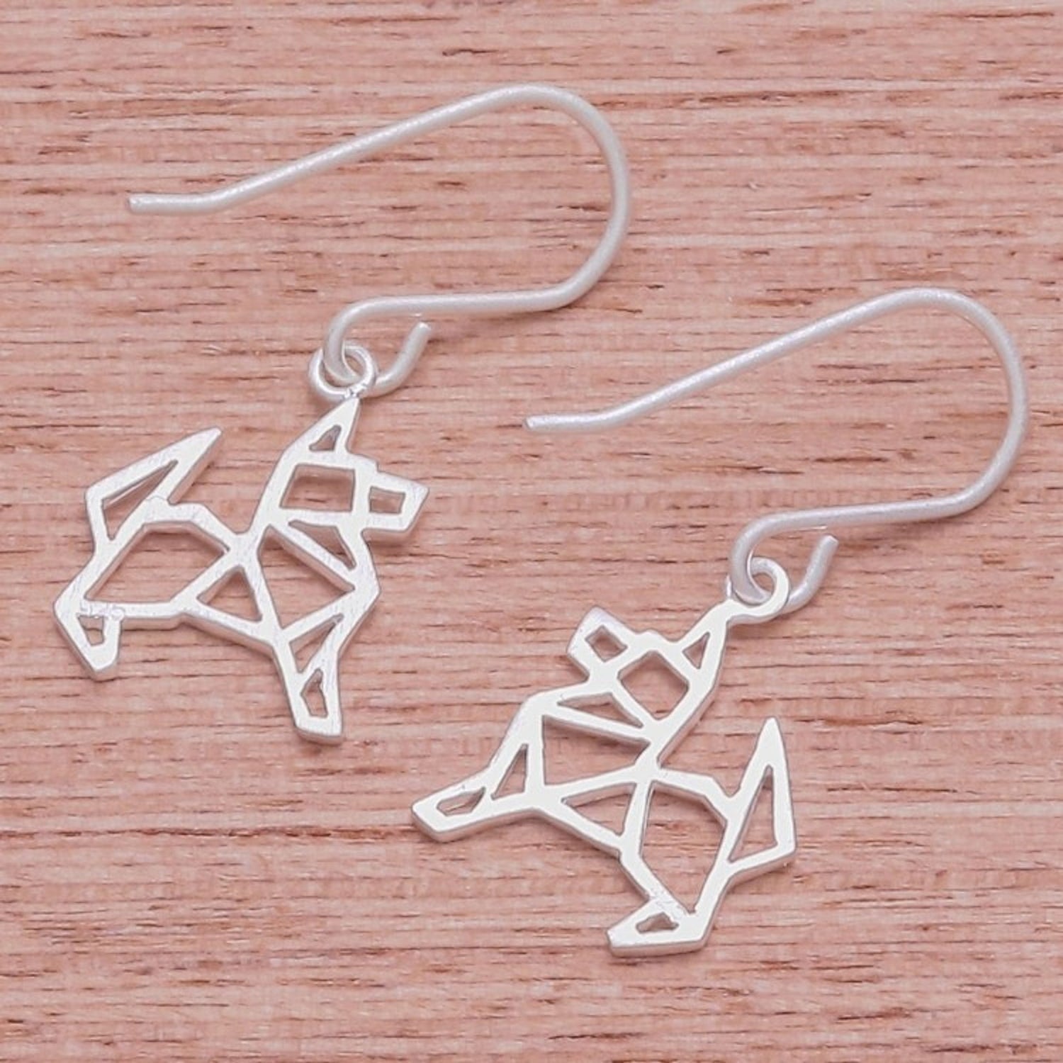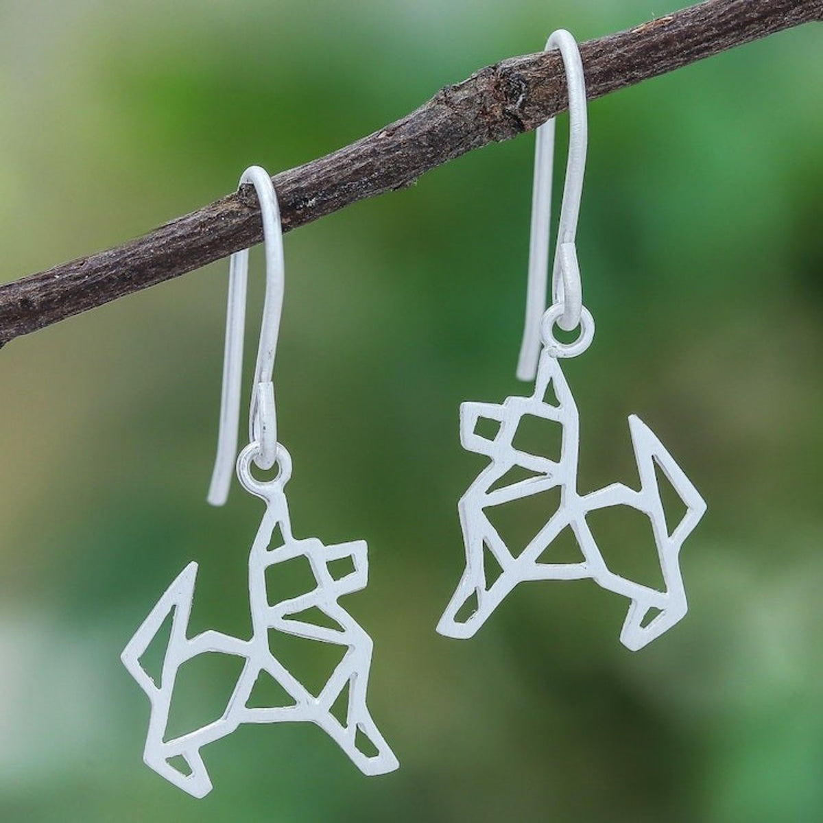 These Geometric German Shepherd Sterling Silver Dangle Earrings 'Geometric German Shepherd' by Independent Artisans are a delightful and unique tribute to a beloved dog breed. Designed by Thai artisan Jantana, these dangle earrings feature two charming German shepherds crafted from geometric forms. The sterling silver is treated with a brushed-satin finish, giving the piece a modern, matte look that highlights the clean lines of the design. These earrings are a perfect accessory for any animal lover, offering a touch of whimsy and personal style while supporting a tradition of handcraftsmanship and community.