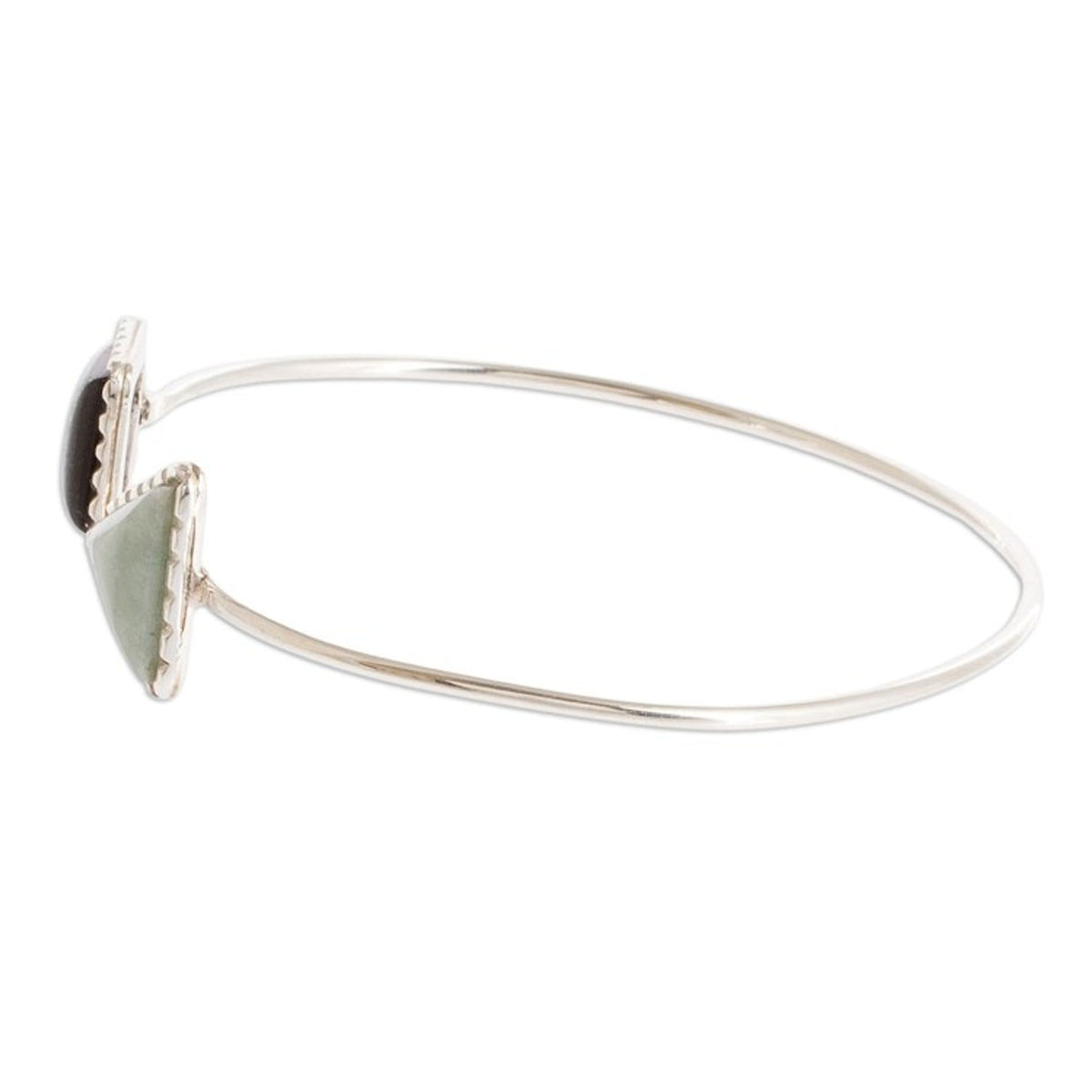 Handcrafted in Guatemala from .925 sterling silver and jade, this cuff bracelet has an inner circumference of 6 inches and is 0.1 inches wide. The crown/bezel measures 0.5 inches long by 0.6 inches wide by 0.1 inches high and 0.5 inches long by 0.5 inches wide by 0.1 inches high. The natural stone's color and pattern may vary.