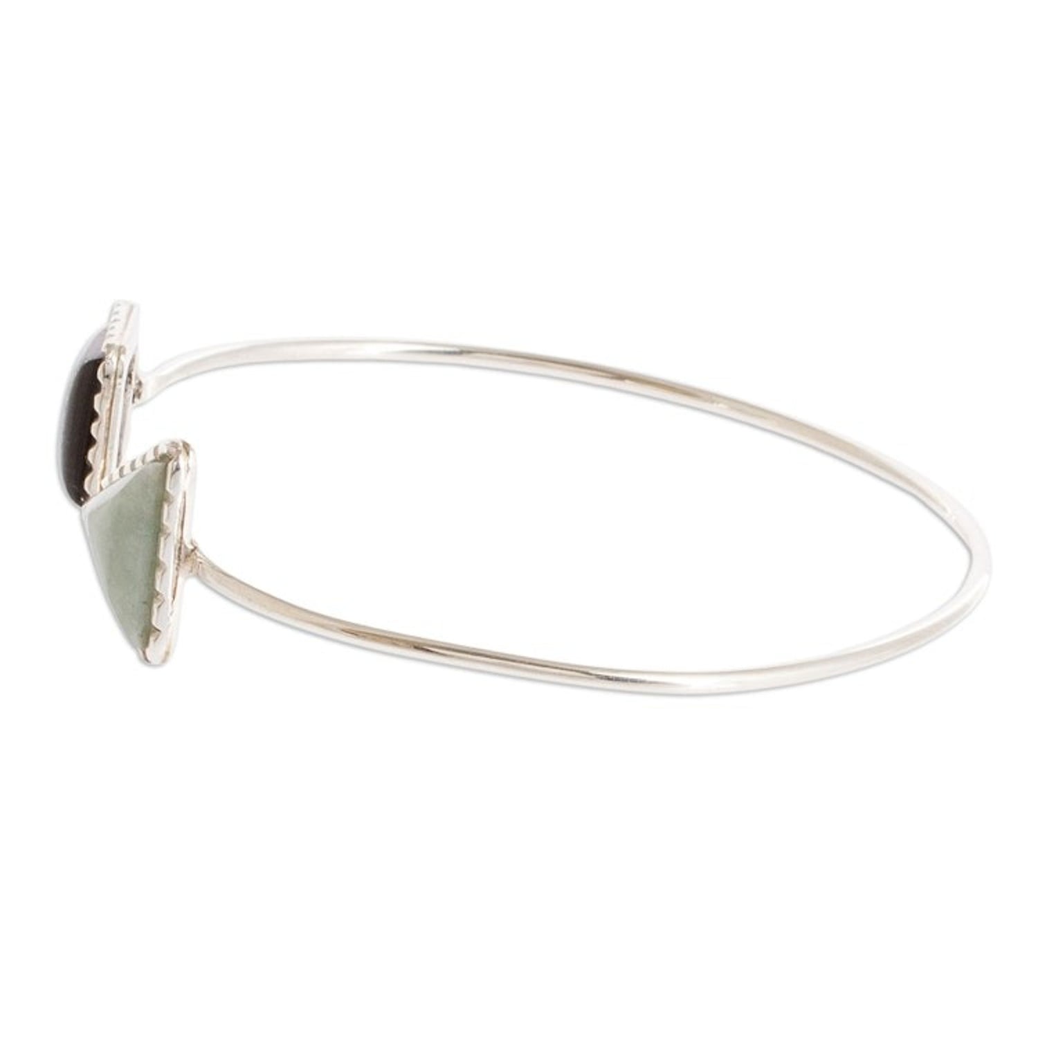 This Geometric Themed Jade Cuff Bracelet with Sterling Silver 'Geometric Shapes II' by Independent Artisans is a unique and modern accessory that goes everywhere in style. Designed by Carolina Quiroa, this sterling silver cuff bracelet is highlighted with apple green and black jade details. The geometric inspiration gives the piece a contemporary look while celebrating the heritage of both the Dominican Republic and Guatemala, blending the vibrant Caribbean with the heritage of Central America. This bracelet is a beautiful symbol of unity and happiness, proving that dreams can be brought to life through artistry.