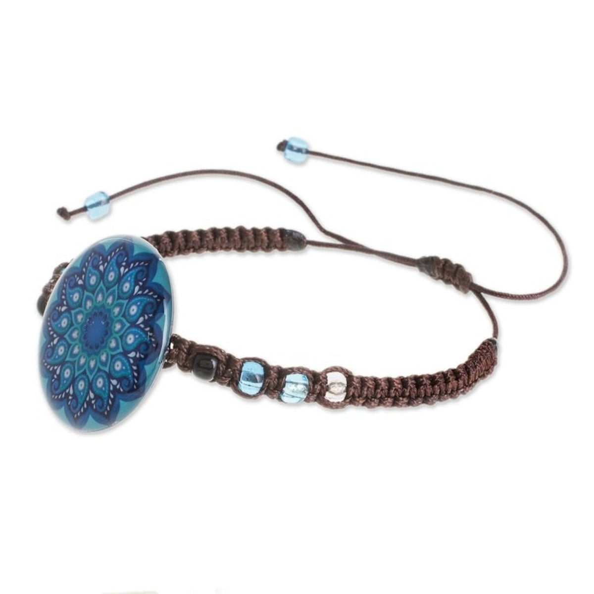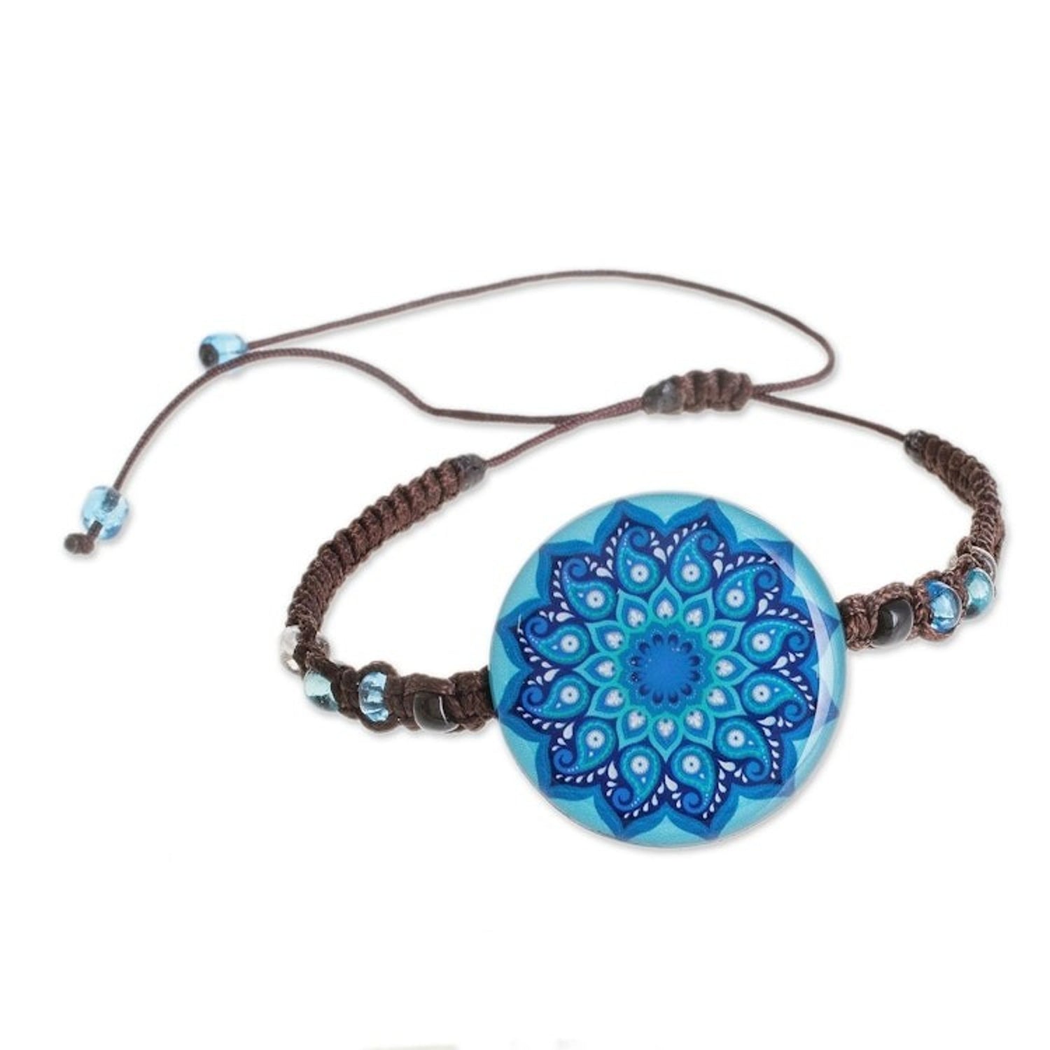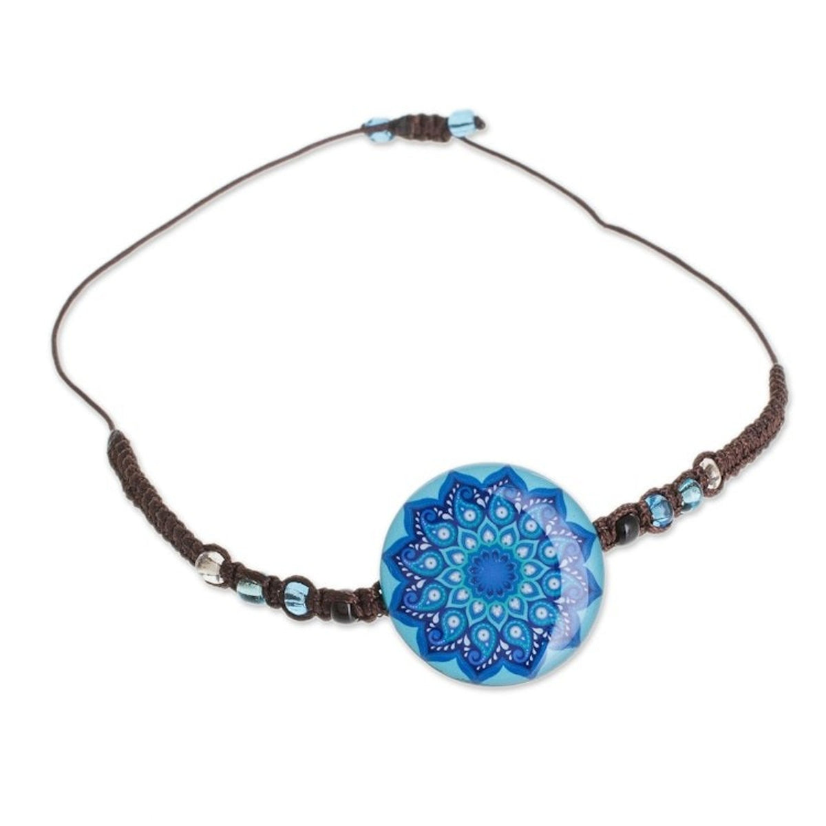 Handcrafted in Costa Rica, this adjustable macrame bracelet is made from epoxy resin, paper, glass beads, and nylon cord. It measures 5 to 12 inches long and 0.2 inches wide, with a pendant of 0.2 inches high by 1 inch in diameter. The color, size, and motif may vary slightly. It has a sliding knot closure.