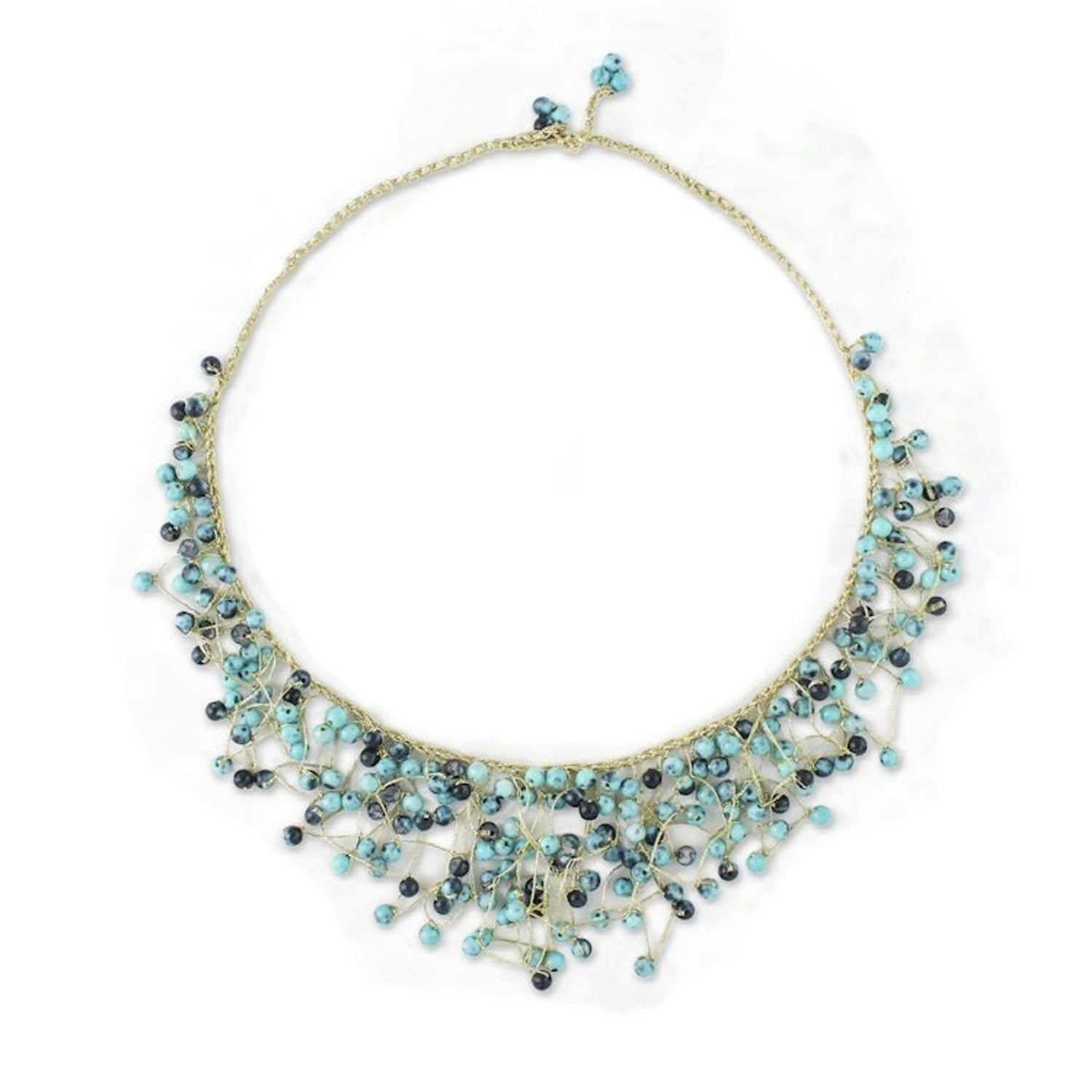 This Glass Beaded Waterfall Necklace in Blue 'Fantasy Rain in Blue' by Independent Artisans is a fantastical accessory that cascades with elegance. Designed by Thai artisan Nareerat, this waterfall necklace is handcrafted from glass beads in lovely tones of dark and light blue, strung on metallic thread over brass. The unique design closes with two glass beaded button clasps, allowing for an adjustable length. This piece is a celebration of Nareerat's commitment to her craft and her desire to preserve delicate manual techniques in the digital age.