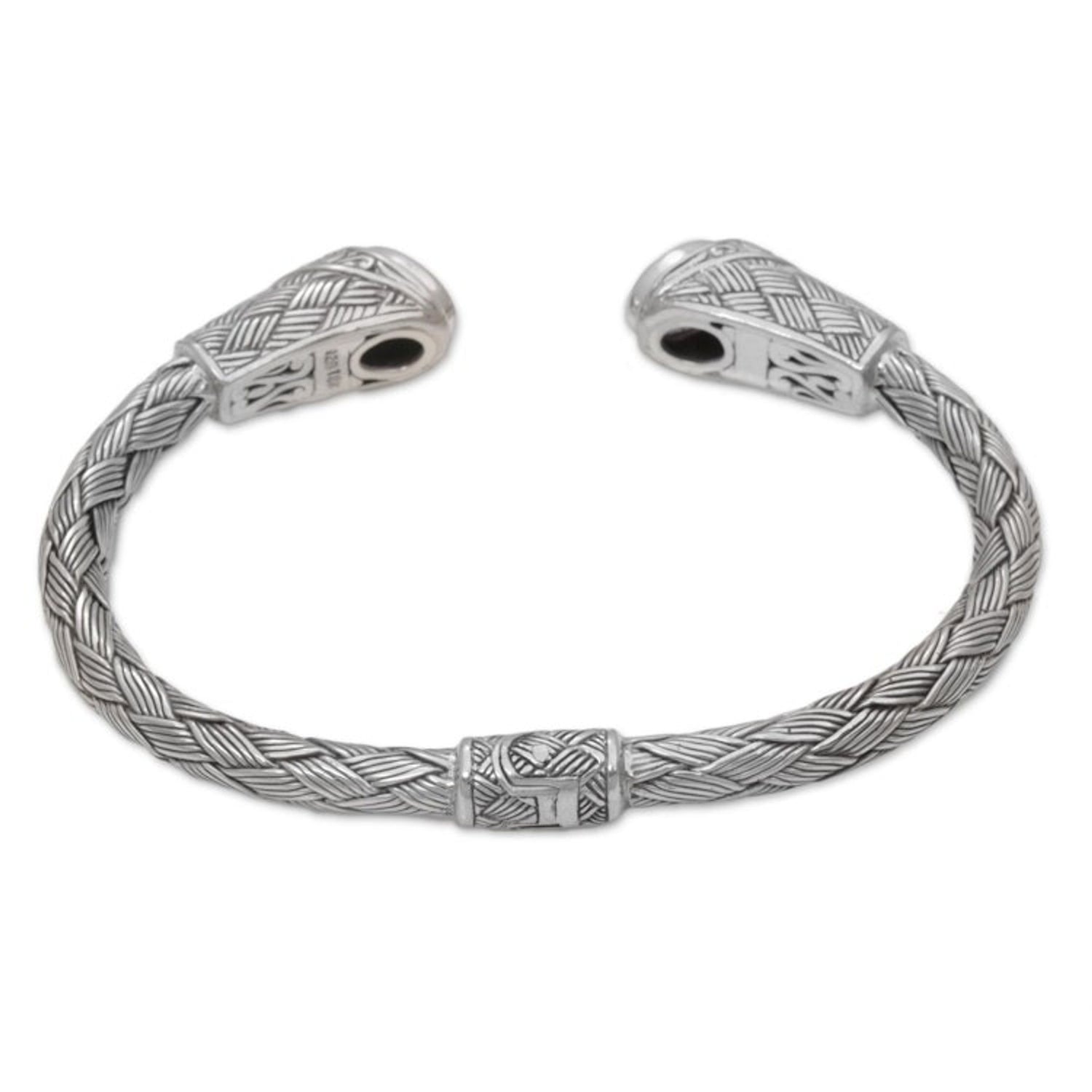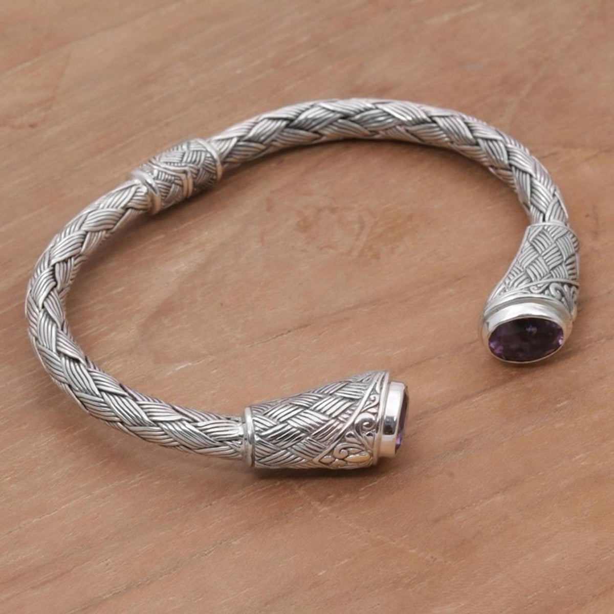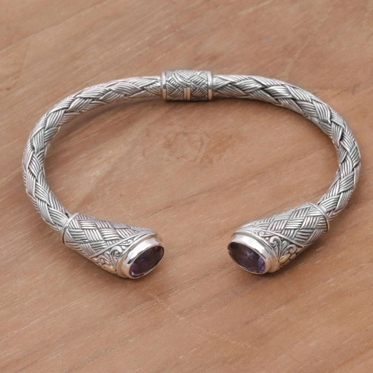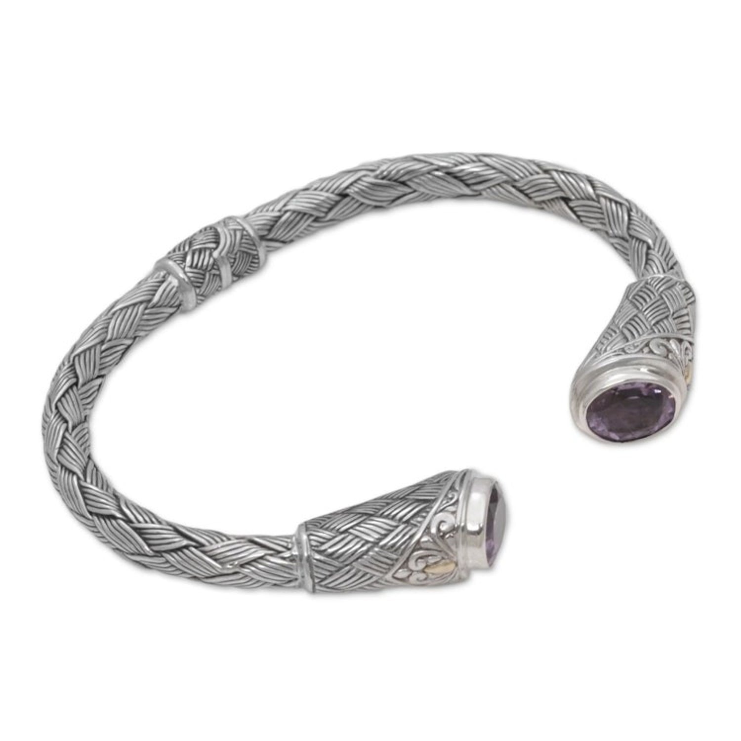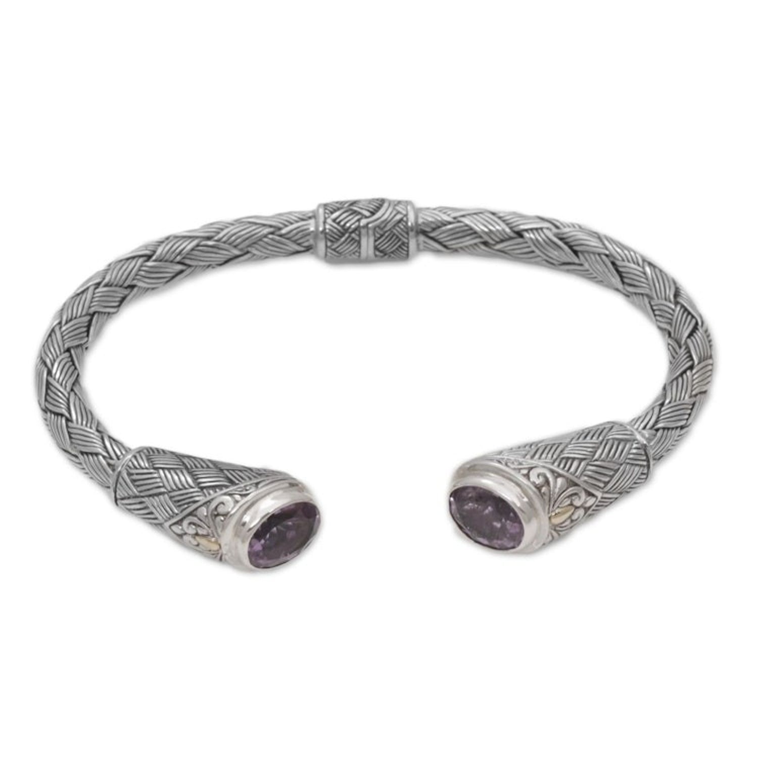 This Gold Accent Amethyst and Silver Cuff Bracelet 'Bamboo Wicker' by Independent Artisans is a unique and elegant accessory that blends traditional Balinese motifs with a modern aesthetic. Crafted by Wayan Neri, this sterling silver cuff bracelet features weaves of silver that create the image of woven bamboo fabric. The ends of the bracelet are adorned with over two carats of purple amethyst stones, accented with petite 18k gold details. The concealed hinge allows for easy wear. This piece is a beautiful representation of Balinese artistry and a commitment to transforming designs into tangible works of art.