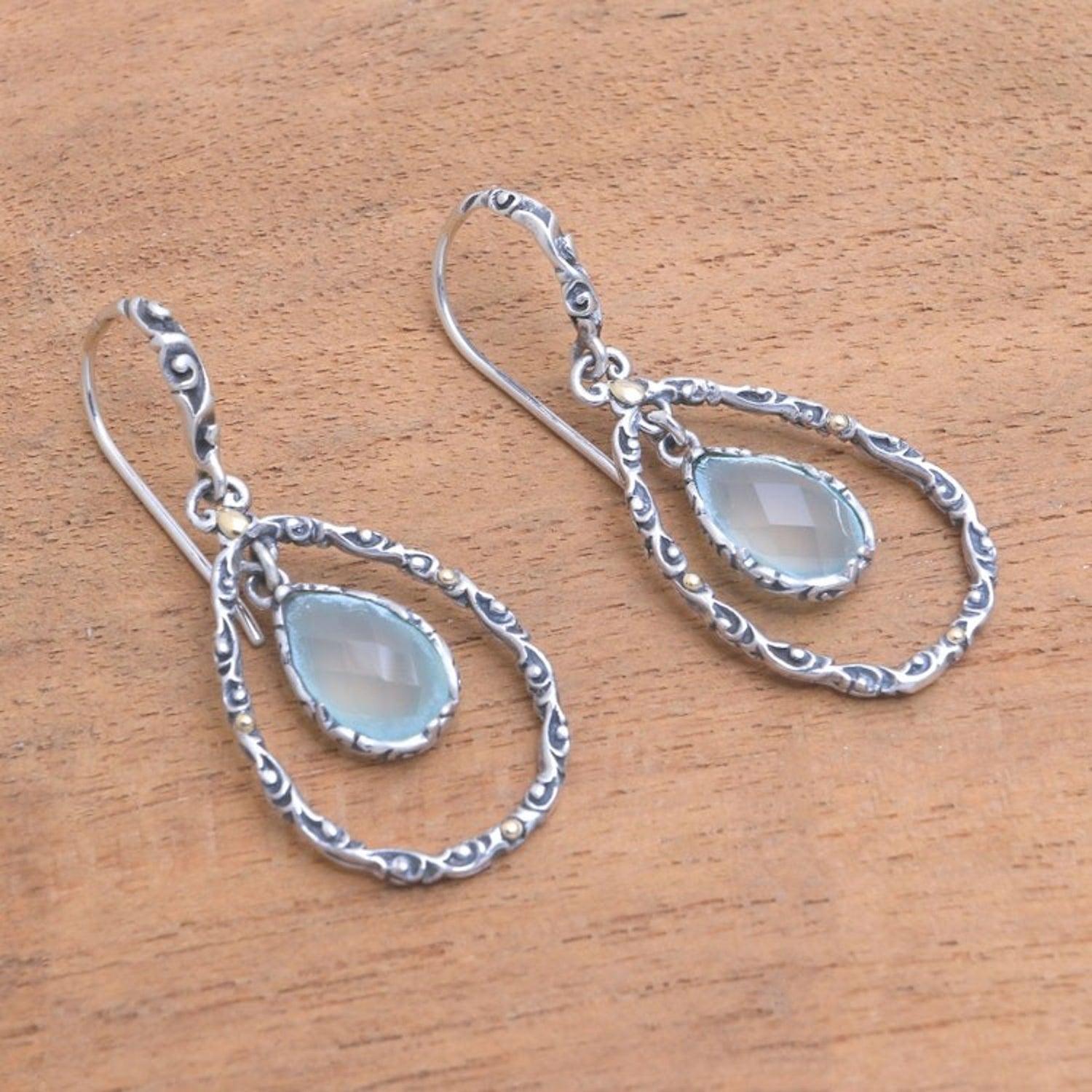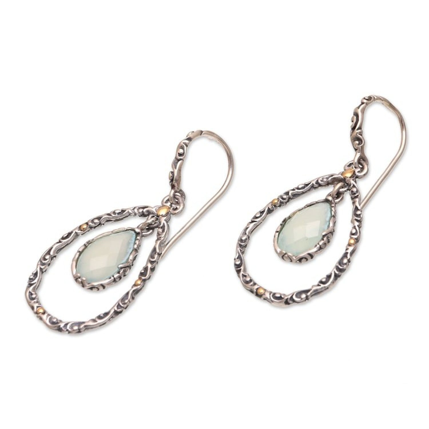These Gold Accented Blue Chalcedony Dangle Earrings from Bali 'Eternity Dew in Blue' by Independent Artisans are a stunning pair of earrings that shimmer brilliantly. Artisan Lenny, with almost two decades of experience, uses sterling silver to create a floral pattern of vines that surround faceted briolette blue chalcedony gems, totaling over eight carats. Each earring is adorned with seven petite 18k gold accents, which add a luxurious allure. The piece reflects Lenny's resilience and her vision of uplifting others through her art and her keen eye for detail.