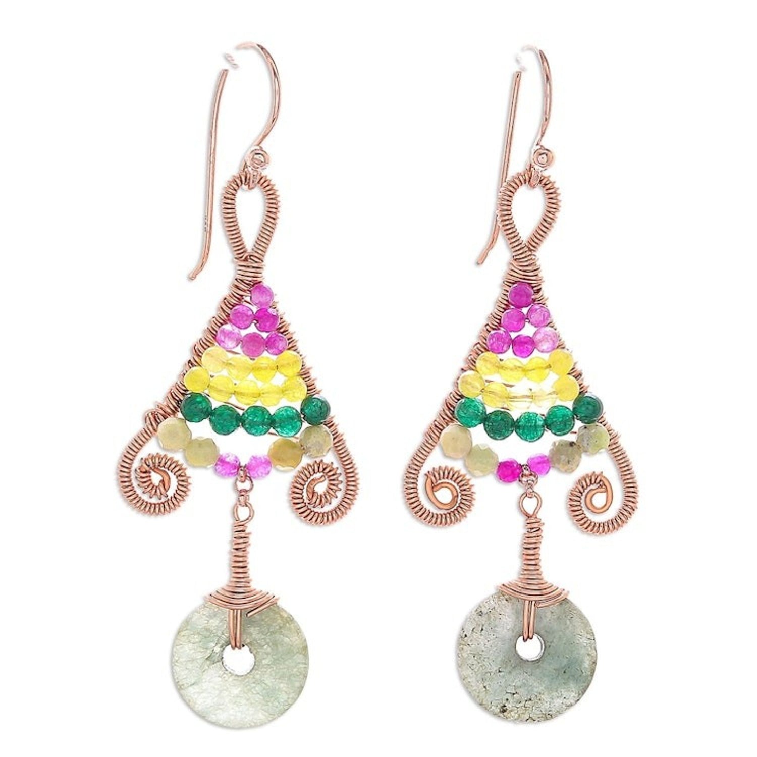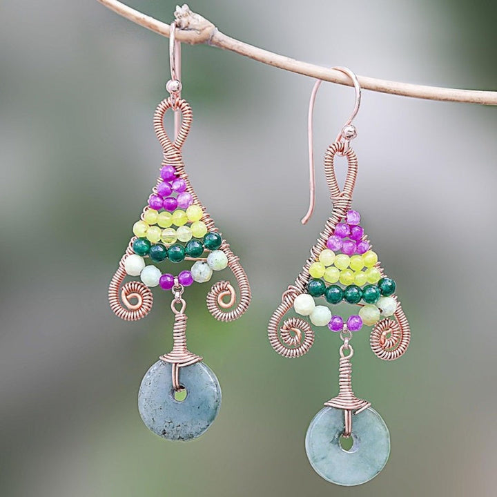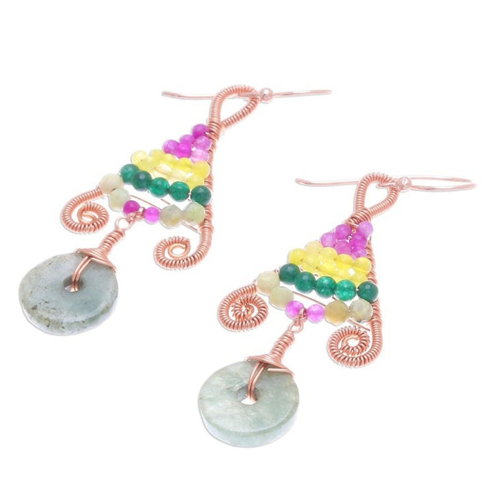 These Gold Accented Multi-Gemstone Dangle Earrings from Thailand 'Bohemian Fascination' by Independent Artisans are a beautiful and free-spirited accessory. Designed by Sareeyakarn (Fai), these bohemian earrings are hand-crafted from copper wire and display a beaded rainbow of quartz and prehnite. A circle of natural jade dangles below, and the piece is accented with petite chain and hooks of 14k rose gold-plated sterling silver. The piece reflects Fai's love for nature's colors and textures, blending these influences with contemporary aesthetics to create a unique and meaningful design.