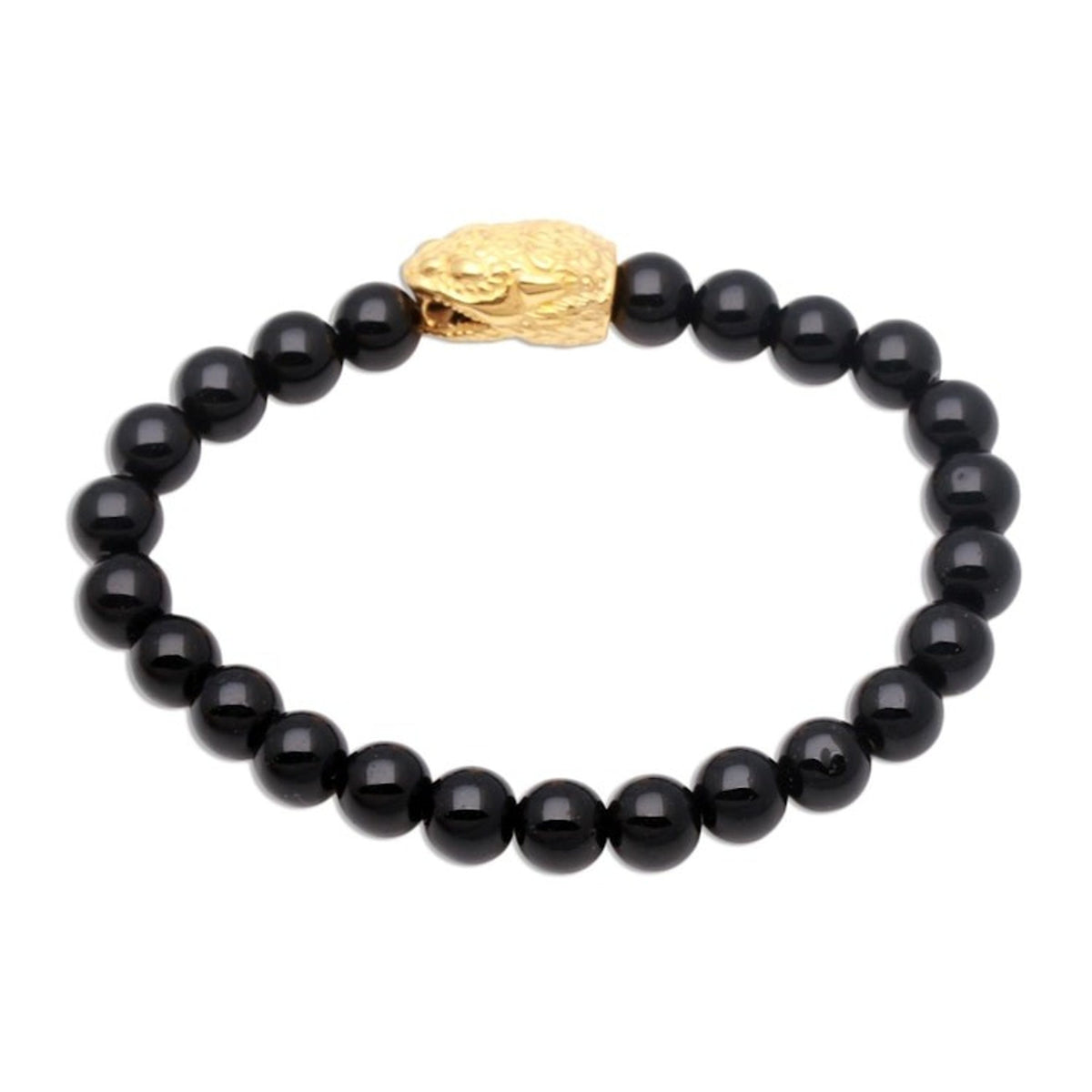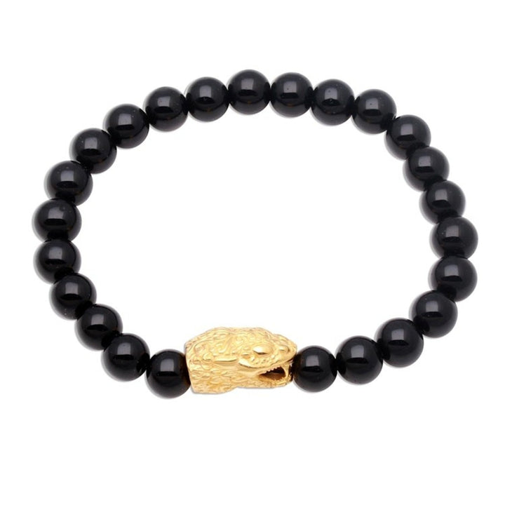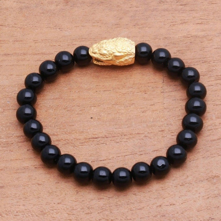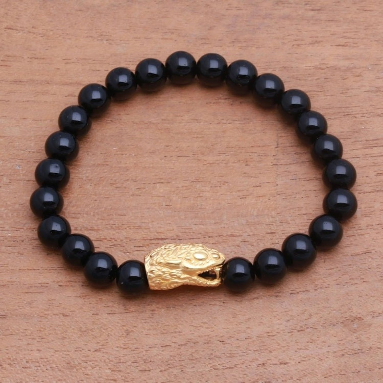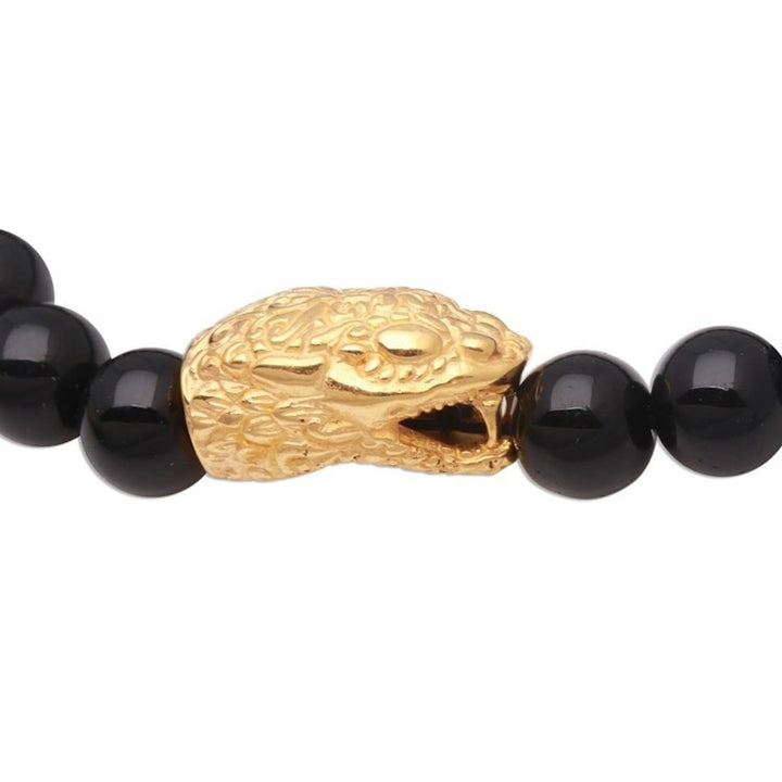 Gold Accented Snake-Themed Onyx Beaded Stretch Bracelet 'Fierce Snake'