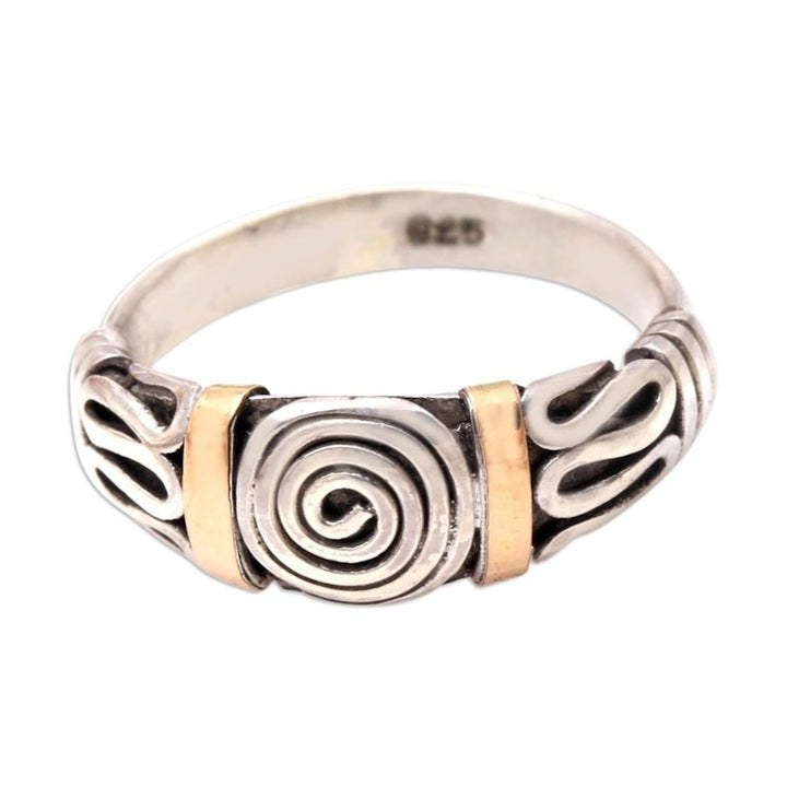 This Gold-Accented Spiral-Motif Cocktail Ring 'Ancient Motif' by Independent Artisans is a luxe and mesmerizing accessory. Designed by Balinese artisan Kenari, this sterling silver ring is centered with a large Balinese spiral motif. The precious metal is engraved with undulating designs that pop with oxidized details, and the spiral motif is flanked by 18k gold-plated sterling silver accents that add a beautiful shimmer. The piece embodies Kenari's dedication and precision, balancing her family's legacy with her personal vision to ensure Balinese silver artistry continues to flourish.