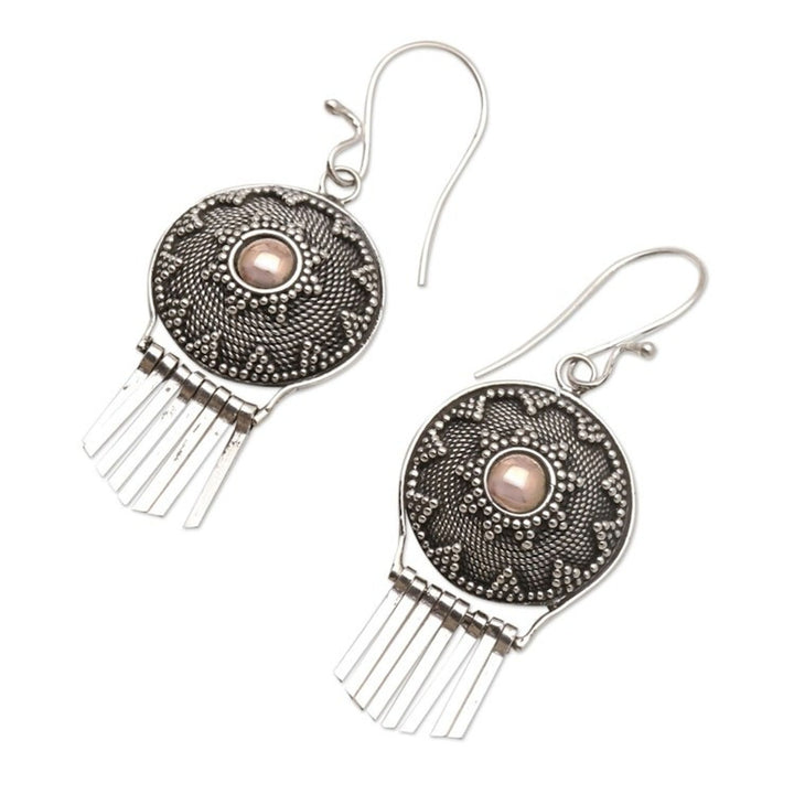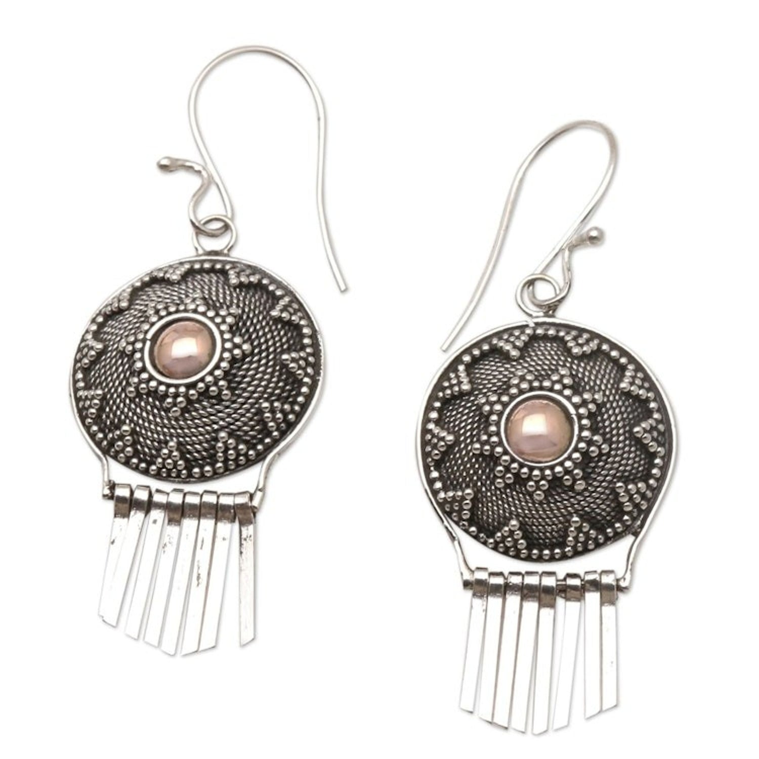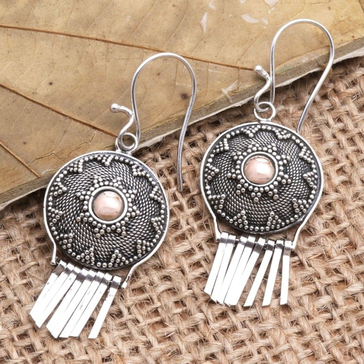 These Gold-Accented Sterling Silver Dangle Earrings 'Balinese Musical' by Independent Artisans are an exquisite and charming accessory. Designed by Balinese artisan Nyoman Sukartini, these dangle earrings feature a sterling silver coin centered with a smooth 18k gold-plated sterling silver circle. The silver is embellished with an intricate dot motif, and polished sterling silver tassels dangle elegantly from the coin. The piece reflects Nyoman's heritage and creativity, offering wearers a connection to Bali's artistry and a way to share her culture with the world.