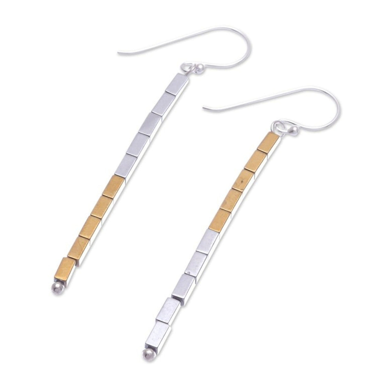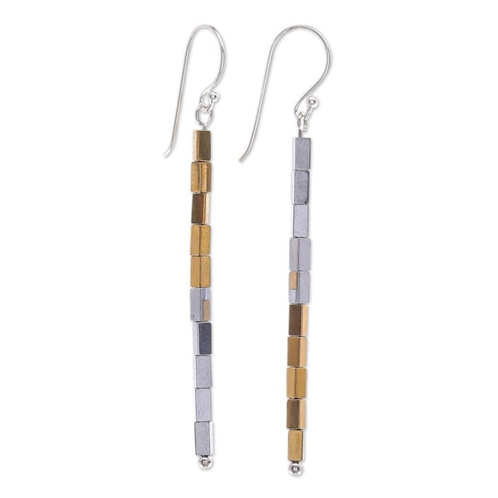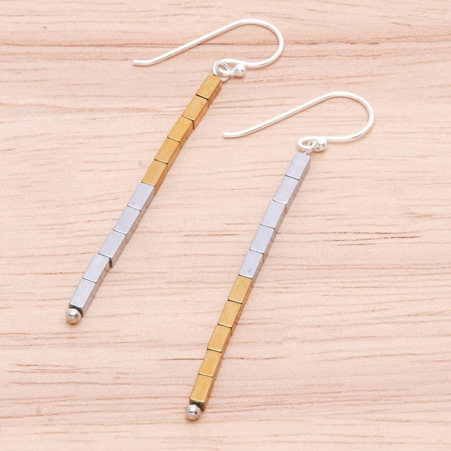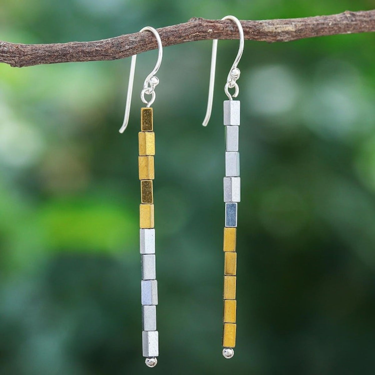 These Gold-Coated Sterling Silver Hematite Dangle Earrings 'Sun and Stars' by Independent Artisans are a beautiful pair that solves the choice between silver and gold. Designed by Thai artisan Srimuang, these earrings are crafted from gold- and sterling silver-coated hematite beads, creating a warm-cool contrast. Half silver and half gold, the earrings are perfect for days when you want the best of both worlds. The piece reflects Srimuang's love for simplicity and her ability to create fresh and individual jewelry that others cherish.