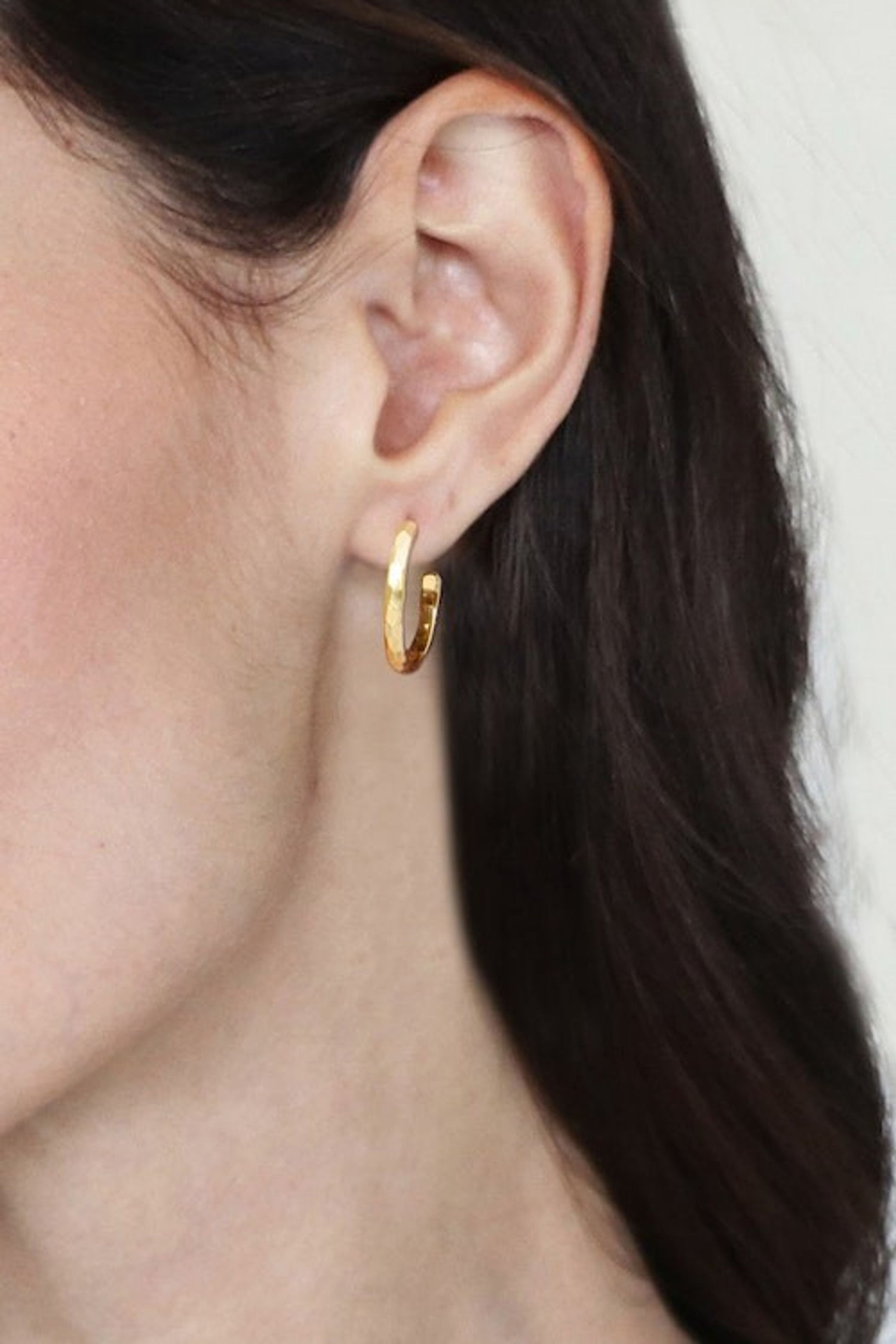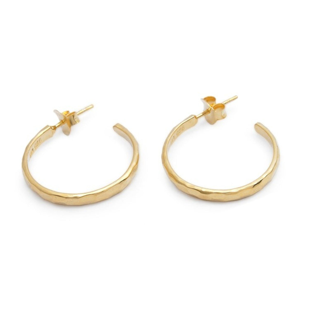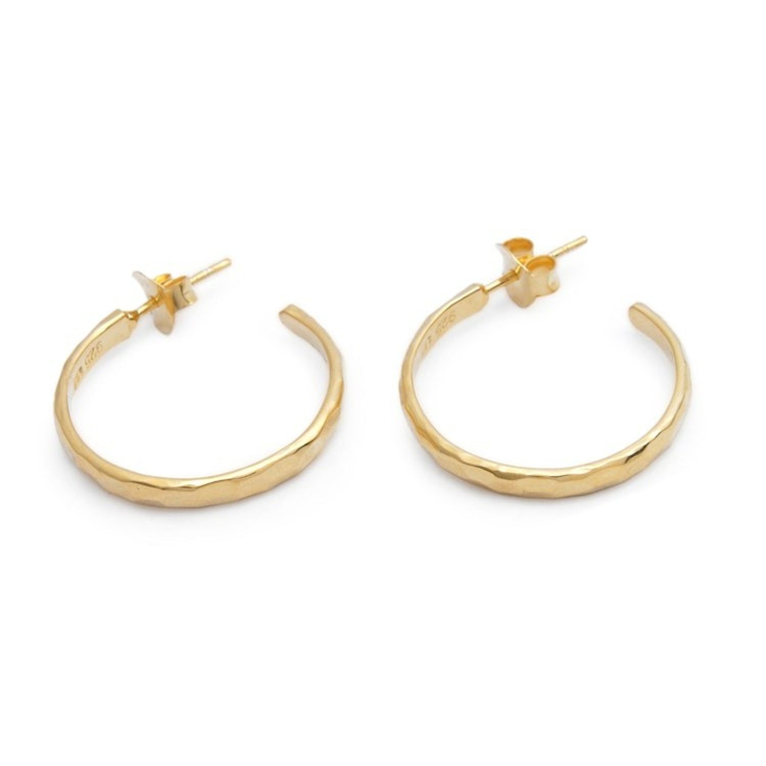 Crafted in Indonesia from 18k gold-plated .925 sterling silver, these post earrings have a hammered finish. They measure 0.9 inches high by 0.1 inches wide.