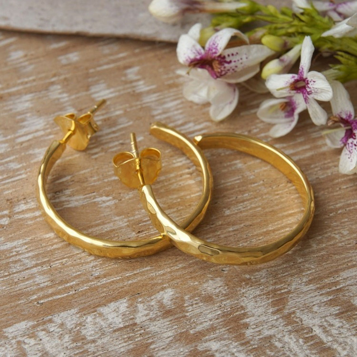 These Gold Plated 925 Slim Half Hoop Silver Earrings from Bali 'Slim Radiant Shine' by Independent Artisans are a classic and elegant accessory. Designed by Balinese artisan Nyoman Ariawan, these slender half-hoops are hand-crafted and feature hammered textures that enhance their radiant glow. The artisan works in sterling silver bathed in 18k gold. The piece reflects Nyoman's dedication to quality and his belief that jewelry can be both beautiful and transformative.