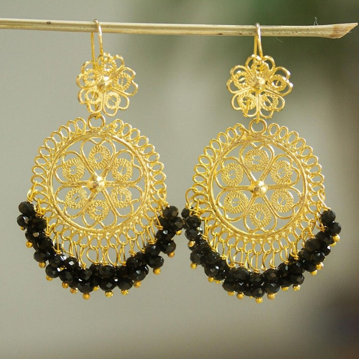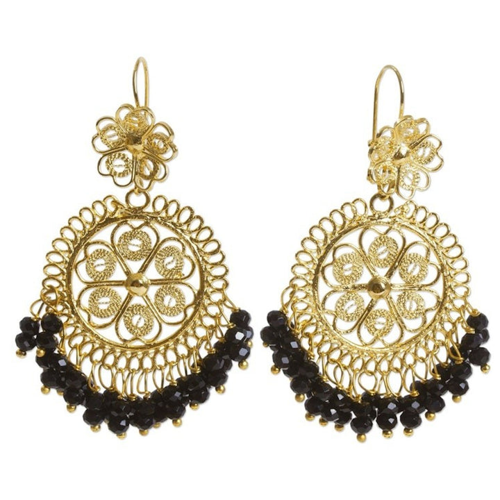 These Gold Plated Chandelier Earrings with Black Crystal 'Valley Flower in Black' by Independent Artisans are a pretty and elegant accessory. Designed by Mexican artisan Donají Salgado, these filigree chandelier earrings are crafted from 10k gold-plated copper wire. They are accented with jet-black crystal beads that swing freely from the bottom. The piece is marked by Donají's devotion to handcrafting pieces that embody love, passion, and heritage, and her commitment to preserving her family's craft.