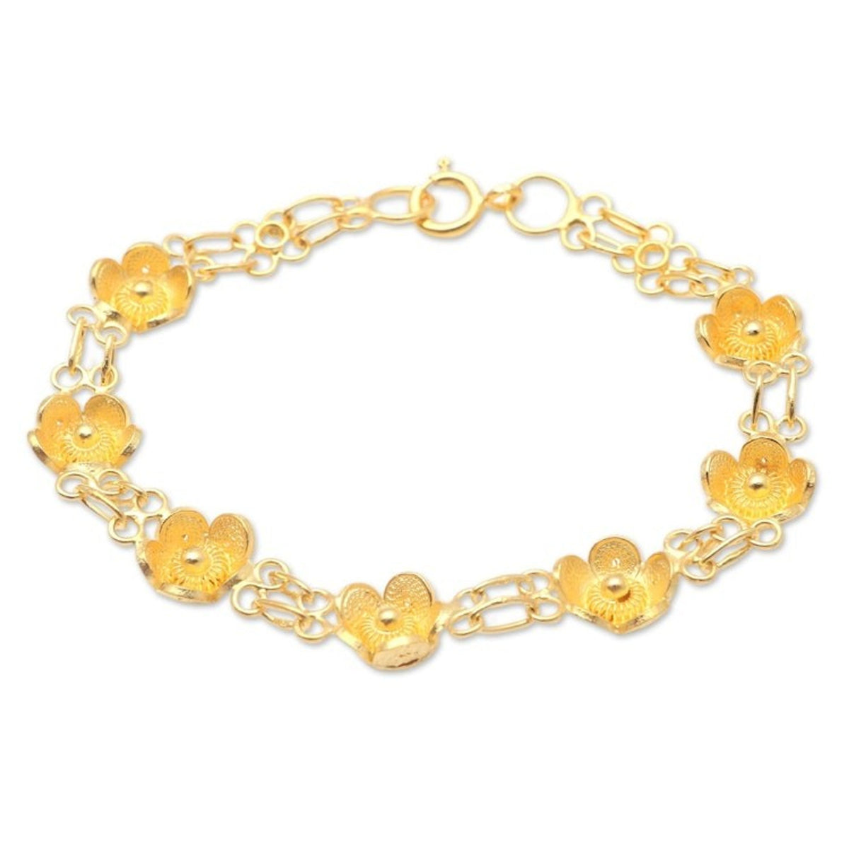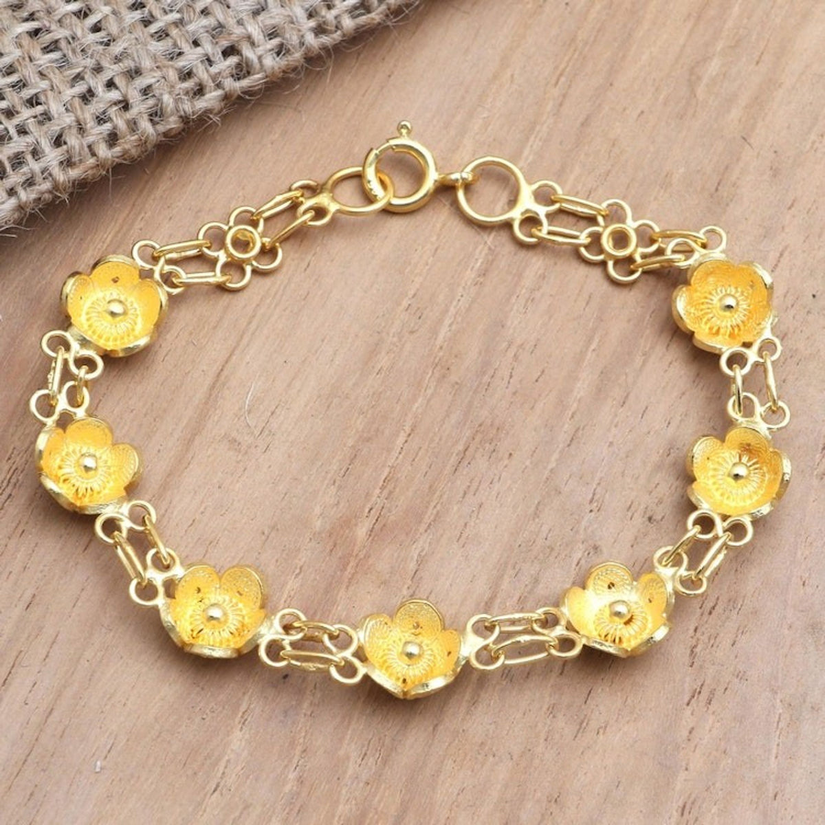 This Gold-Plated Filigree Floral Bracelet 'Magnolia Flower' by Independent Artisans is a beautiful and elegant accessory. Designed by Balinese artisan Yuniati, this bracelet will wrap your wrist in bright gold. The artisan crafts the bracelet from 18k gold-plated sterling silver filigree wires, which she uses to create a series of ornamental flowers that shine in the sun. The piece is a testament to Yuniati's dedication, cultural pride, and creative passion, as she carries forward her ancestors' legacy.
