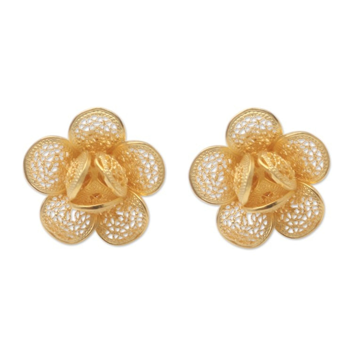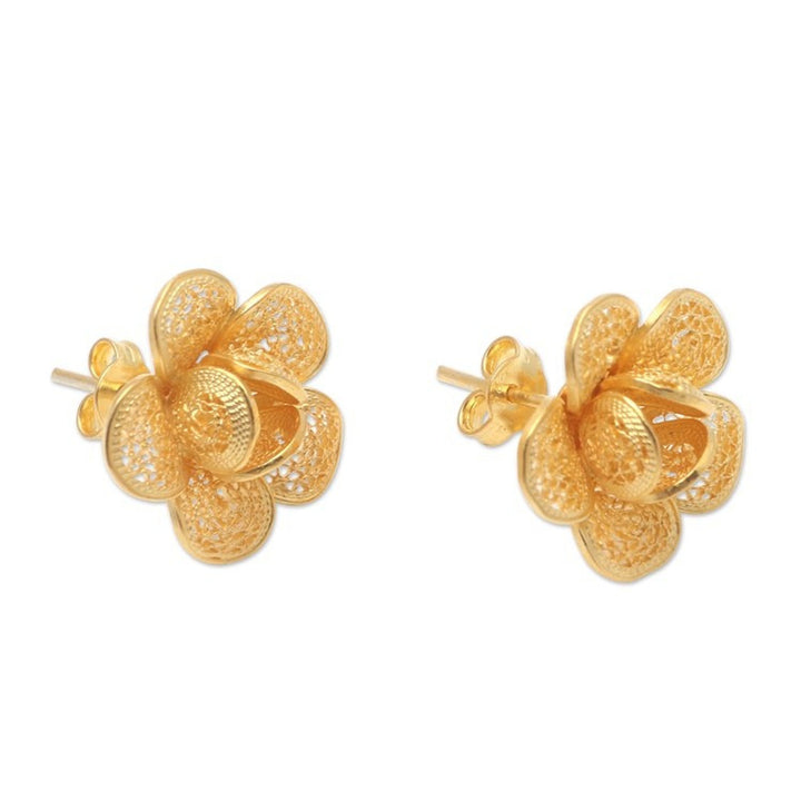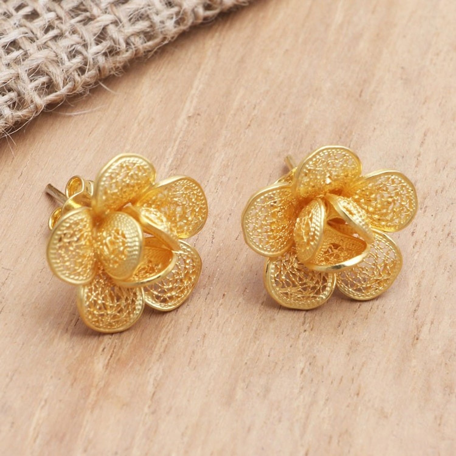 These Gold-Plated Floral Button Earrings 'Frangipani Light' by Independent Artisans are a darling accessory that captures the warm glow of gold. Designed by Balinese artisan Yuniati, these flower-shaped button earrings are crafted from 18k gold-plated sterling silver. The artisan uses fine wires to create ornamental filigree work that adds a decorative touch. The piece reflects Yuniati's love for nature's beauty and her island's heritage, as she creates unique expressions of Balinese art.