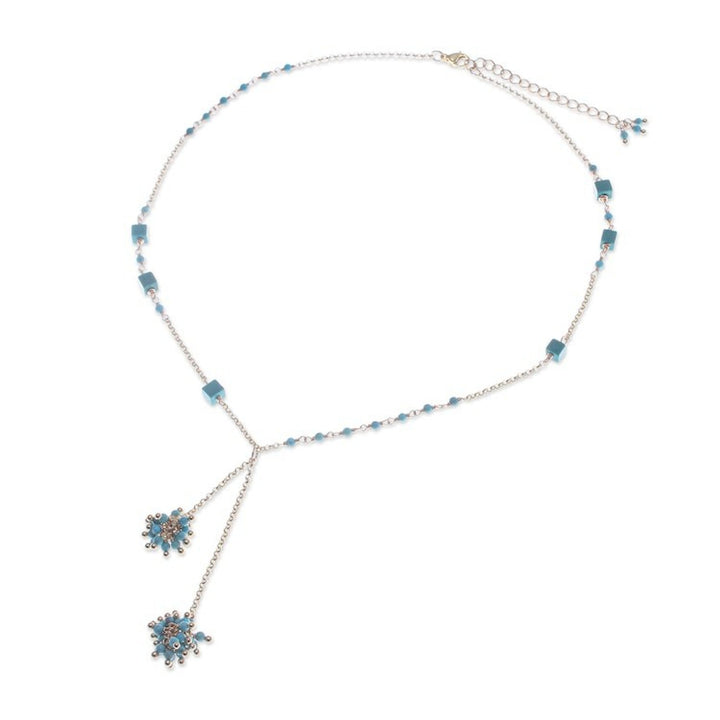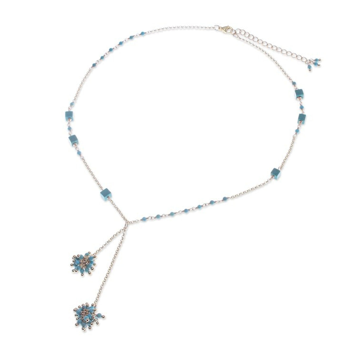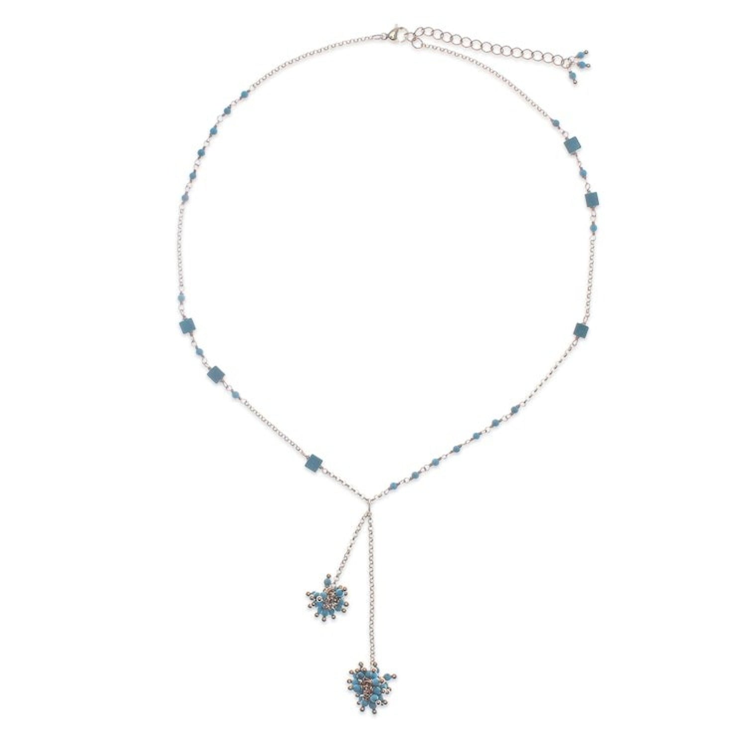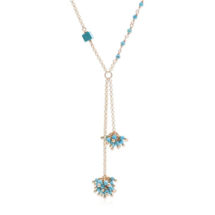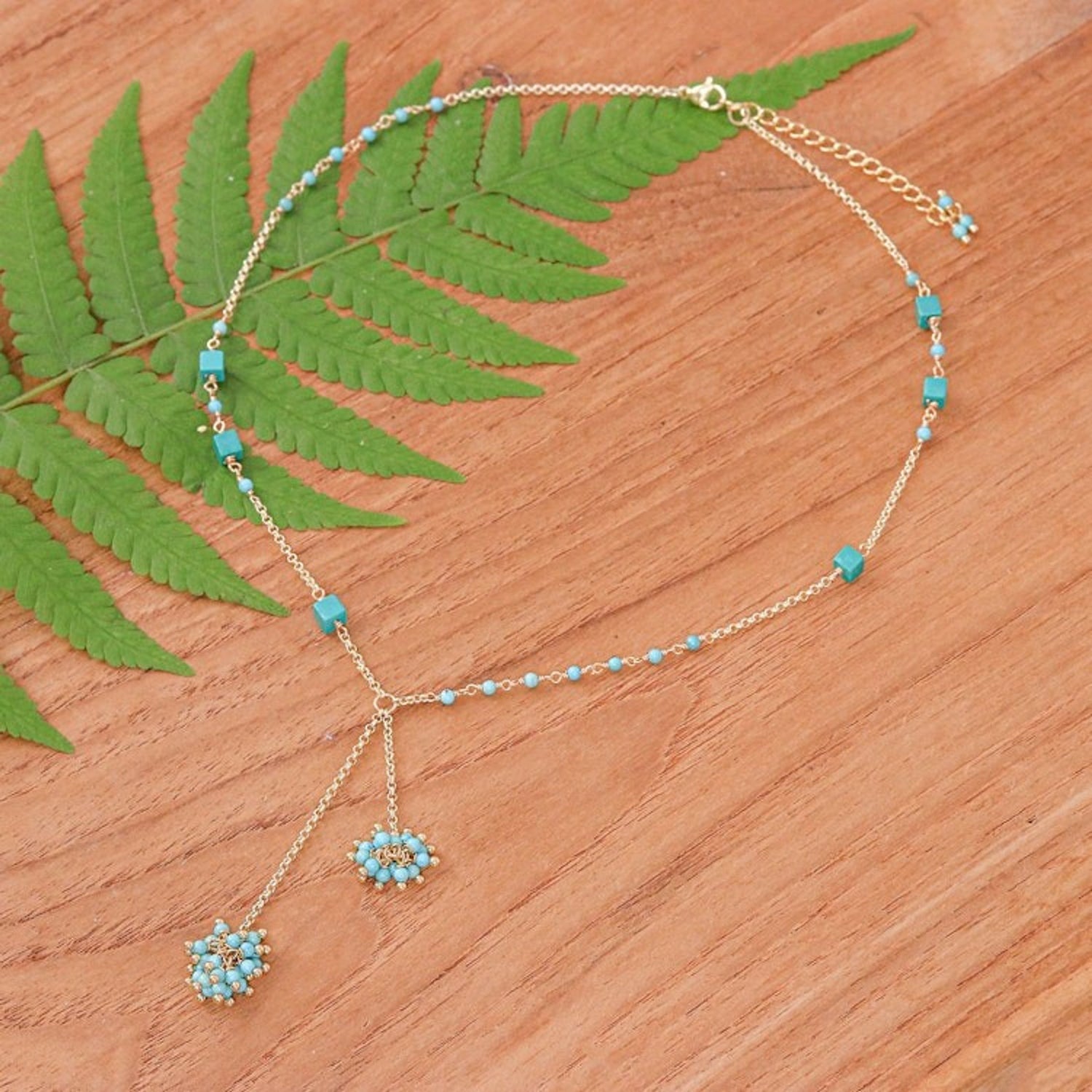 This Gold-Plated Howlite Lariat Necklace with Cluster Pendants 'Pompom Cheer' by Independent Artisans is a versatile and bold accessory. Designed by Thai artisan Sareeyakarn, this lariat necklace commands attention with two playful clusters of turquoise howlite beads that pop like a summer sky. The beads play against lustrous 18k gold-plated brass, and the necklace's adjustable length allows for versatile styling. The piece is a testament to Sareeyakarn's ability to blend natural influences with contemporary aesthetics, creating a remarkable accessory where bold style and versatility coexist.