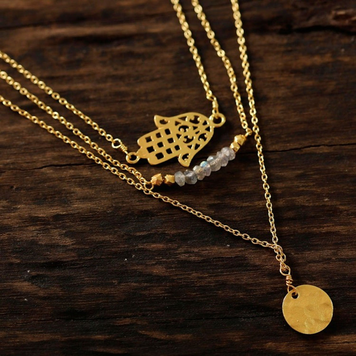 This Gold-Plated Labradorite Hamsa Pendant Necklace ‘Hamsa Protection’ by Independent Artisans carries deep symbolism, pairing beauty with spiritual meaning. The hamsa, a traditional emblem of protection and blessings, is reimagined in shimmering gold and natural labradorite beads, said to ward off negative energy and inspire strength. The design layers multiple pendants, including a hammered circular charm and a beaded element, creating a necklace that feels rich with symbolism yet easy to style. Its aesthetic is both contemporary and steeped in tradition, embodying a sense of safeguarding and serenity for its wearer.
