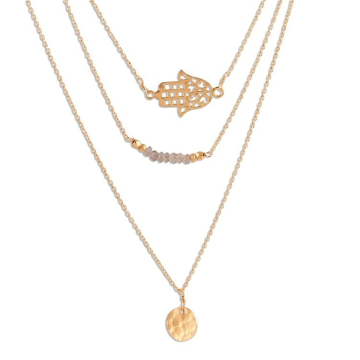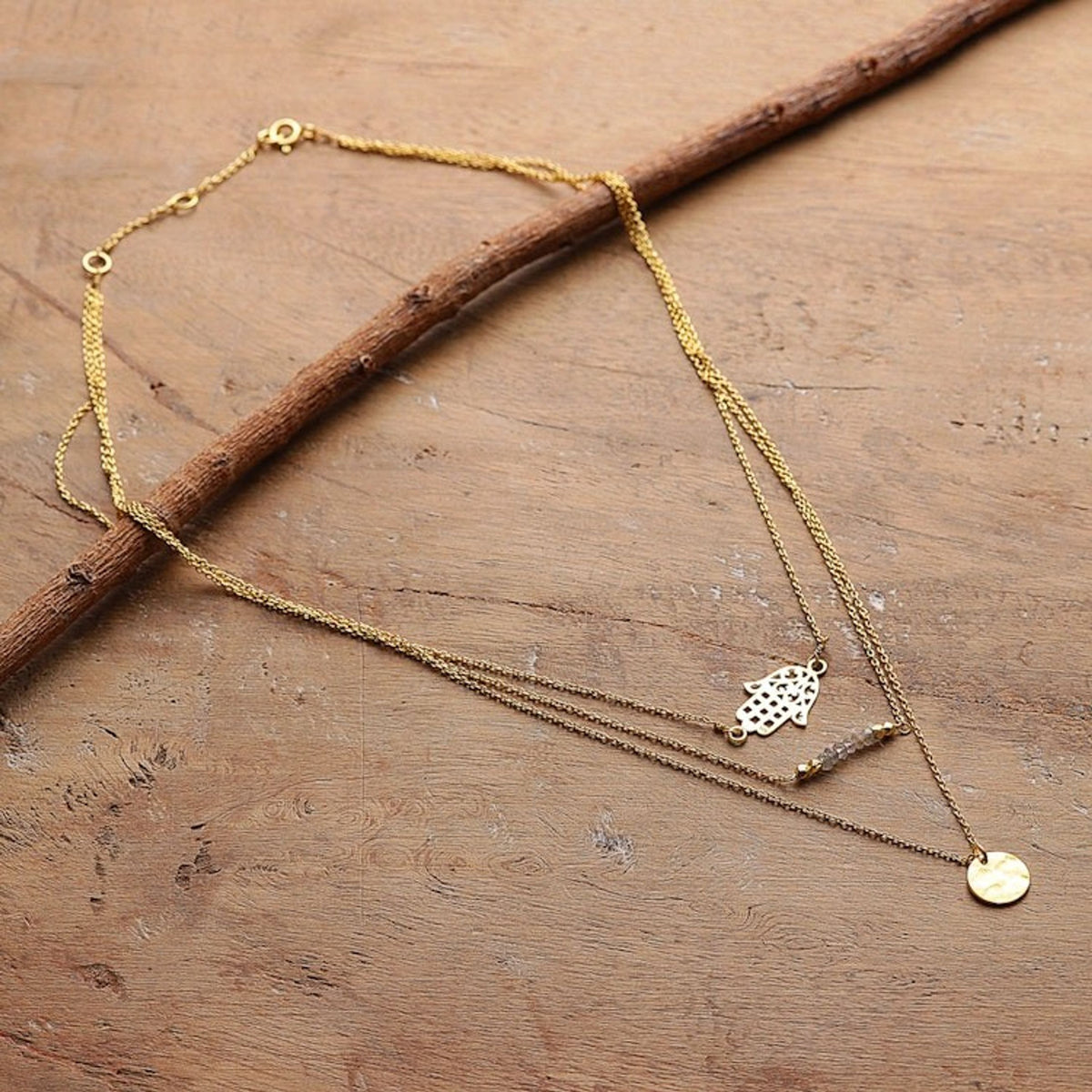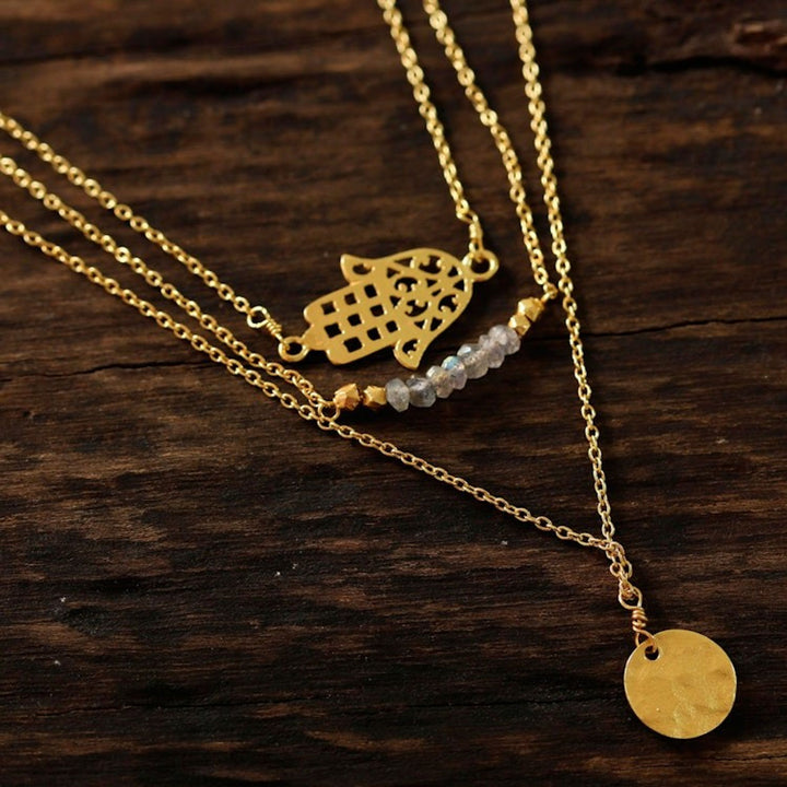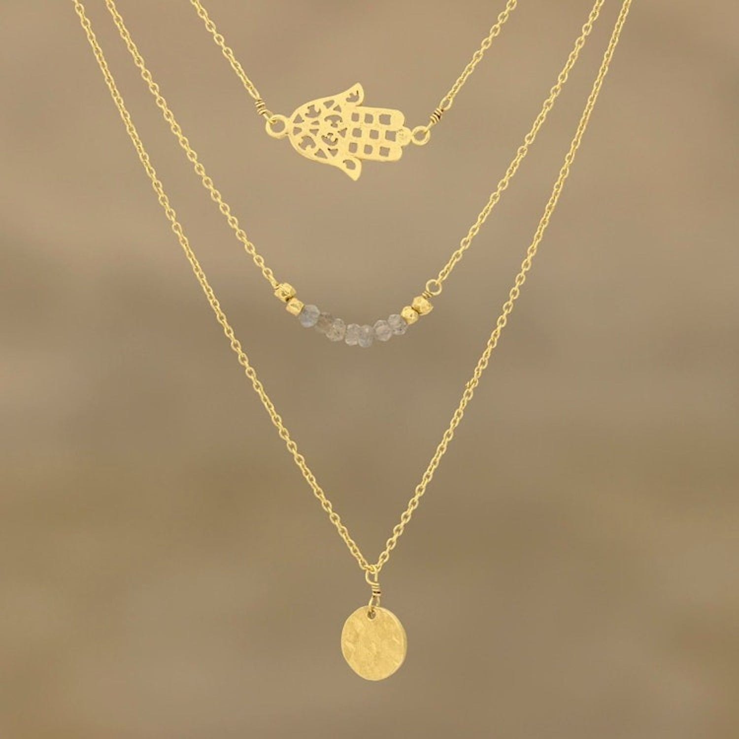 Crafted in 22k gold-plated 925 sterling silver with natural labradorite. Necklace measures 16.3–18 inches in length, 0.1 inches wide; chain width 1 mm. Hamsa pendant: 0.8 x 1 x 0.8 inches. Beaded pendant: 0.5 x 1.2 inches. Circular pendant: 0.6 x 0.4 inches. Weight 0.20 oz. Cable chain with spring ring clasp. Combination finish. Natural stone color may vary. Made in India.