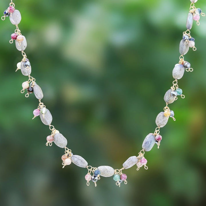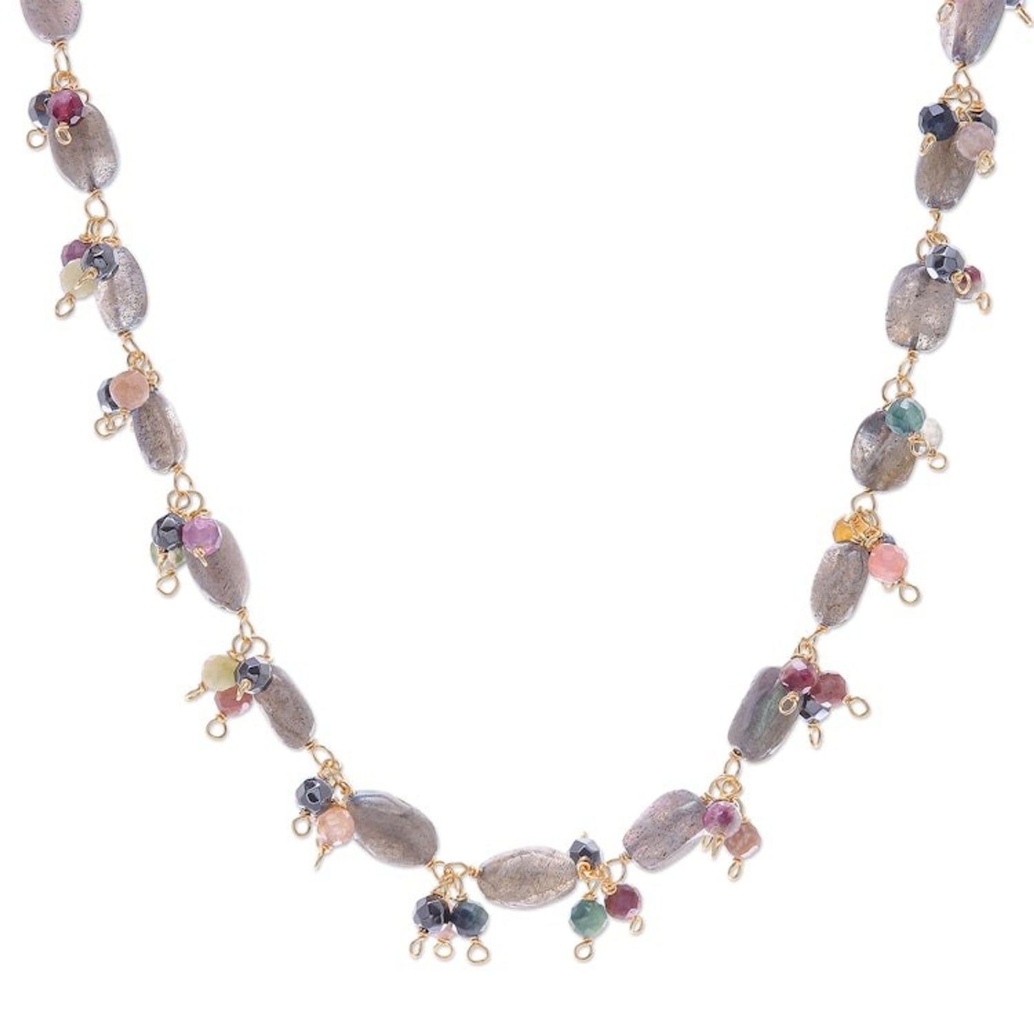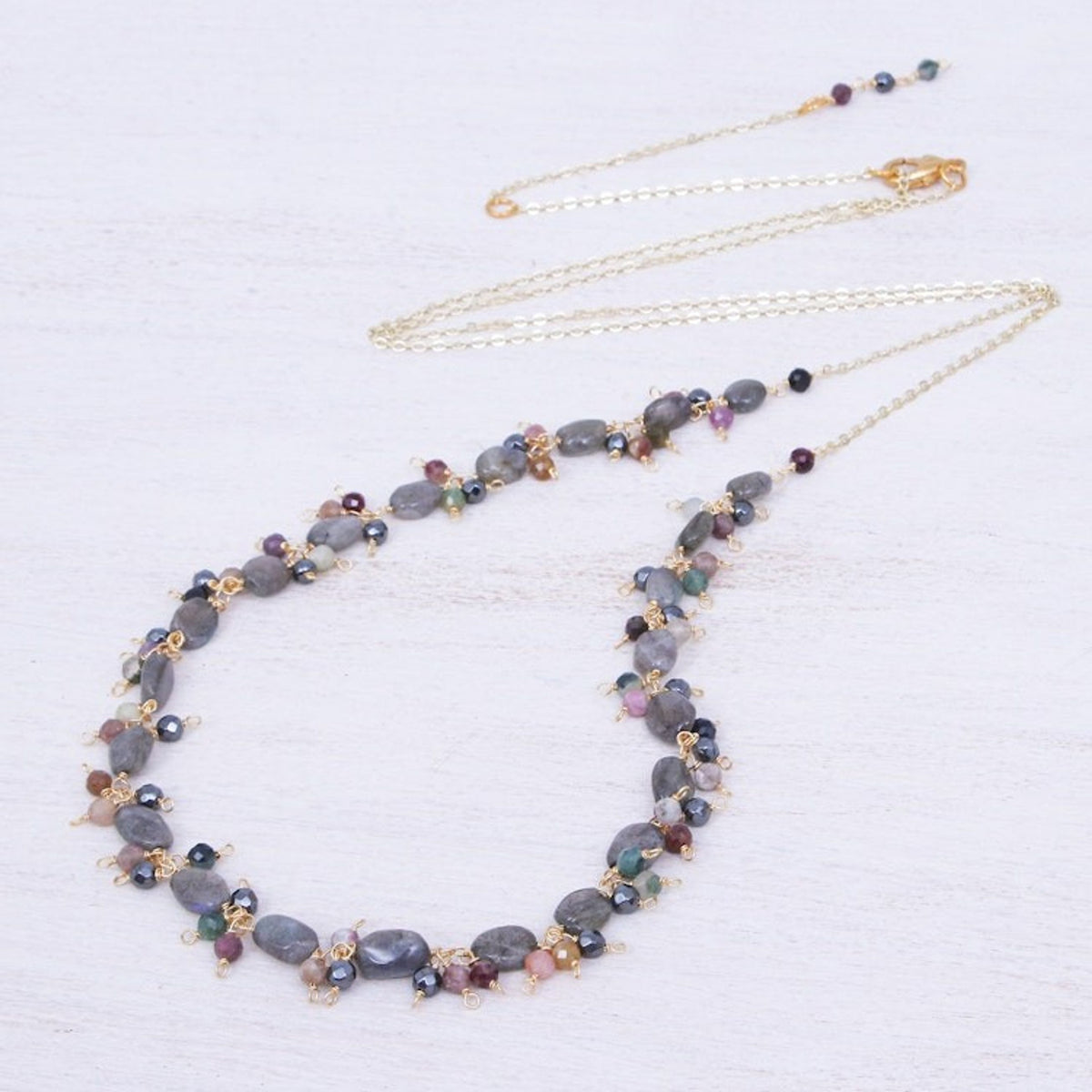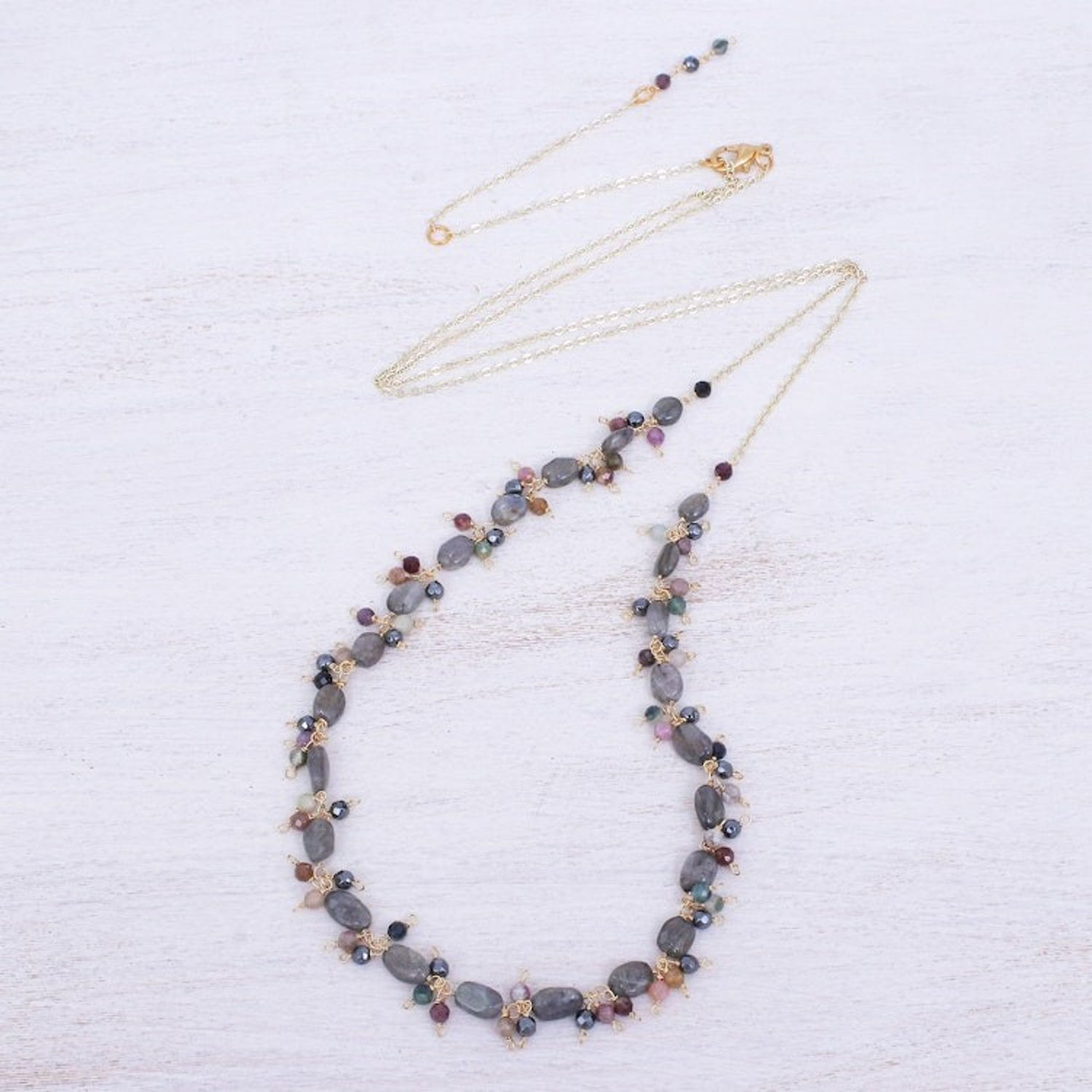 Handcrafted in 14k gold-plated 925 sterling silver with labradorite, tourmaline, and hematite beads. Necklace length 38 inches; width 2 mm. Extender length 5.5 inches with bead accents. Weight 0.86 oz. Cable chain with gold-plated brass lobster clasp. High polish finish. Made in Thailand.