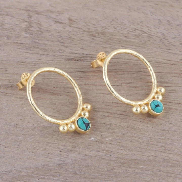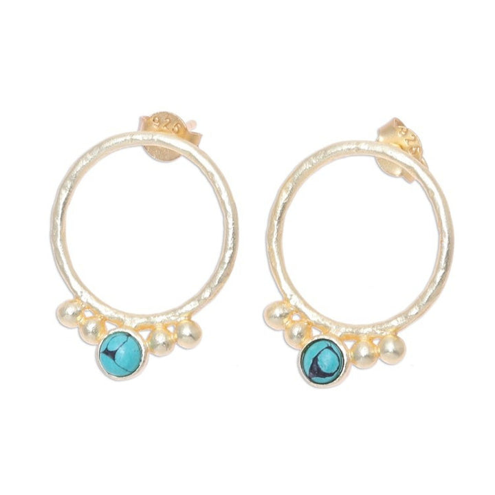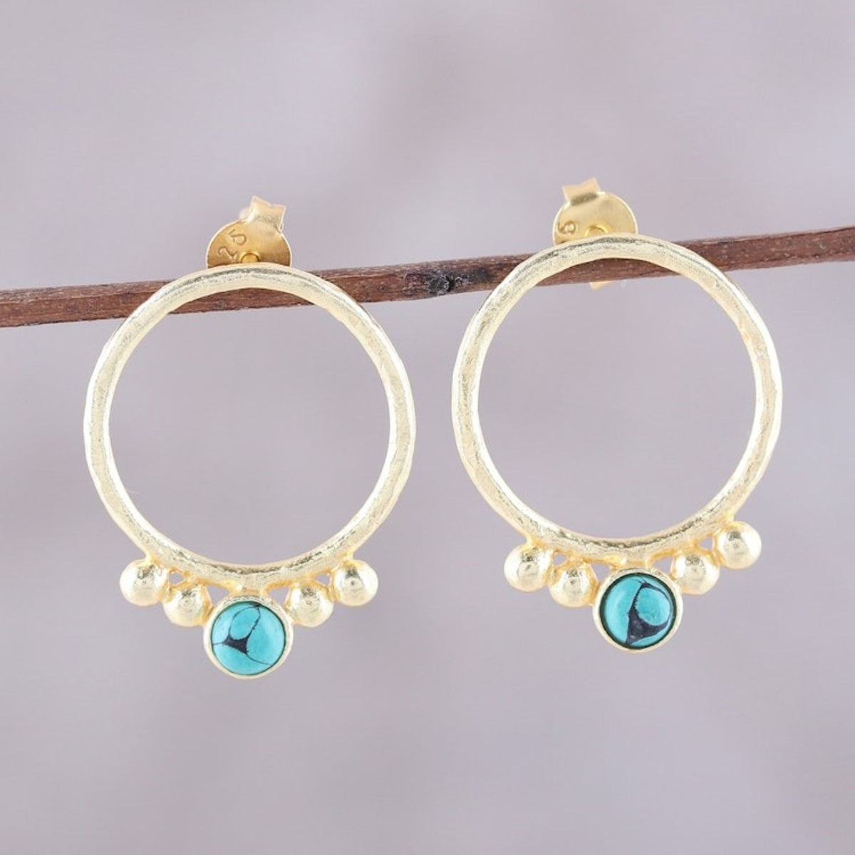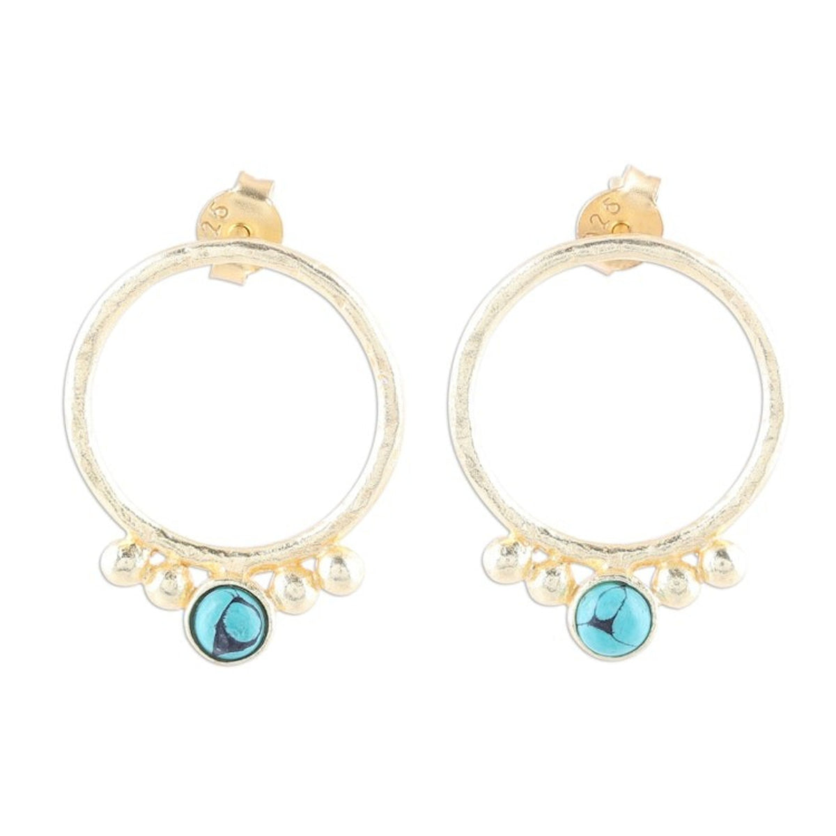 These Gold Plated Sterling Silver and Calcite Drop Earrings 'Golden Hoops' by Vivek Nathany are a majestic pair of drop earrings where two gleaming hoops crafted of sterling silver bathed in 22k gold descend from the ears. Petite baubles and a piece of calcite decorate each earring at the bottom. His work is distinguished by delicate detailing.