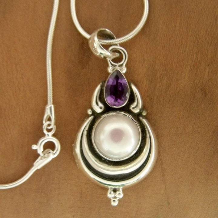 Grand Indian Necklace with Pearl and Amethyst on Silver 'Jaipur Moon'