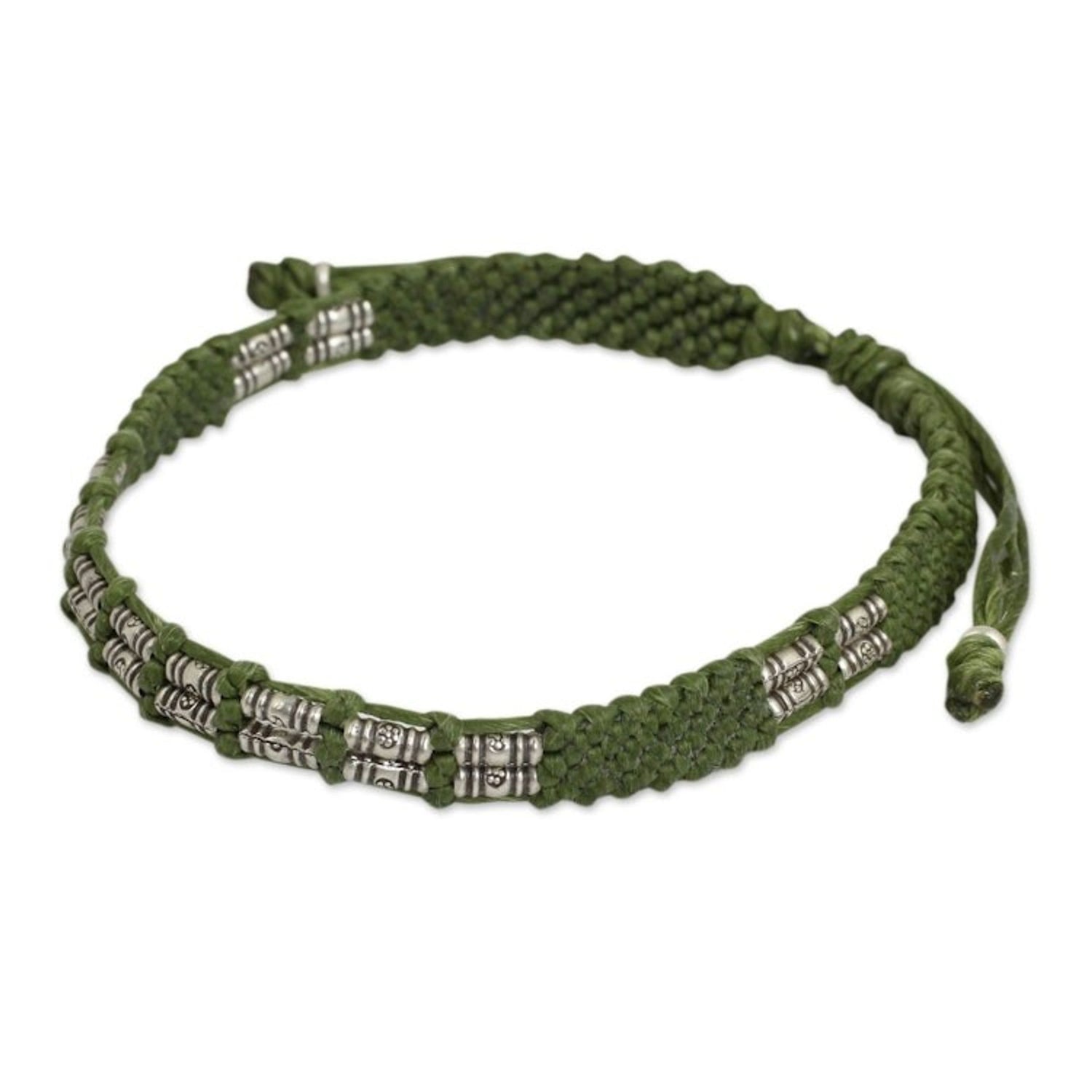 This Green Cord Braided Bracelet Handmade in Thailand 'Affinity in Green' by Napapat is an original bracelet design where two by two, flower-stamped silver beads stick together. The beads are crafted by Karen hill tribe artisans and hand-knotted on olive green cords. The bracelet can be adjusted by sliding the knots. She blends ethnic Thai influences with modern durability.