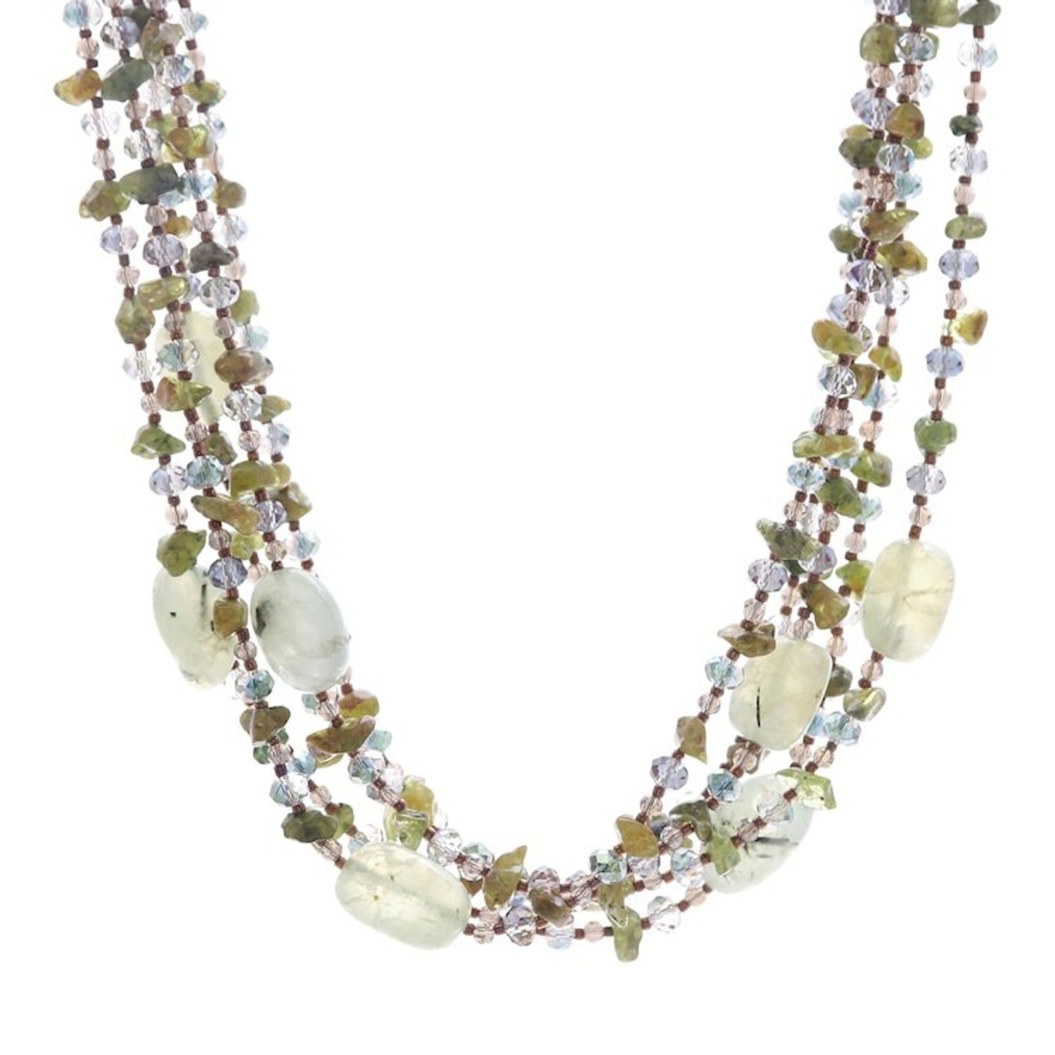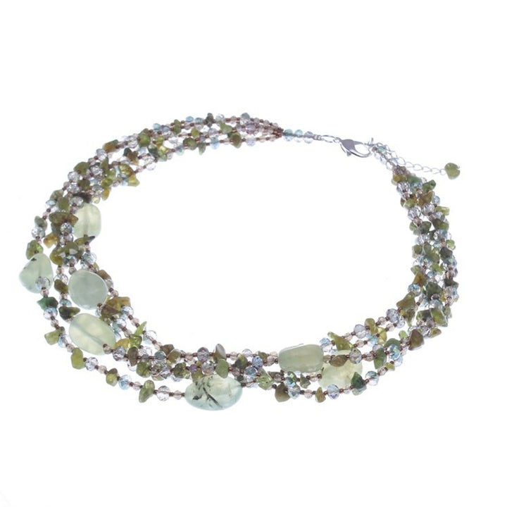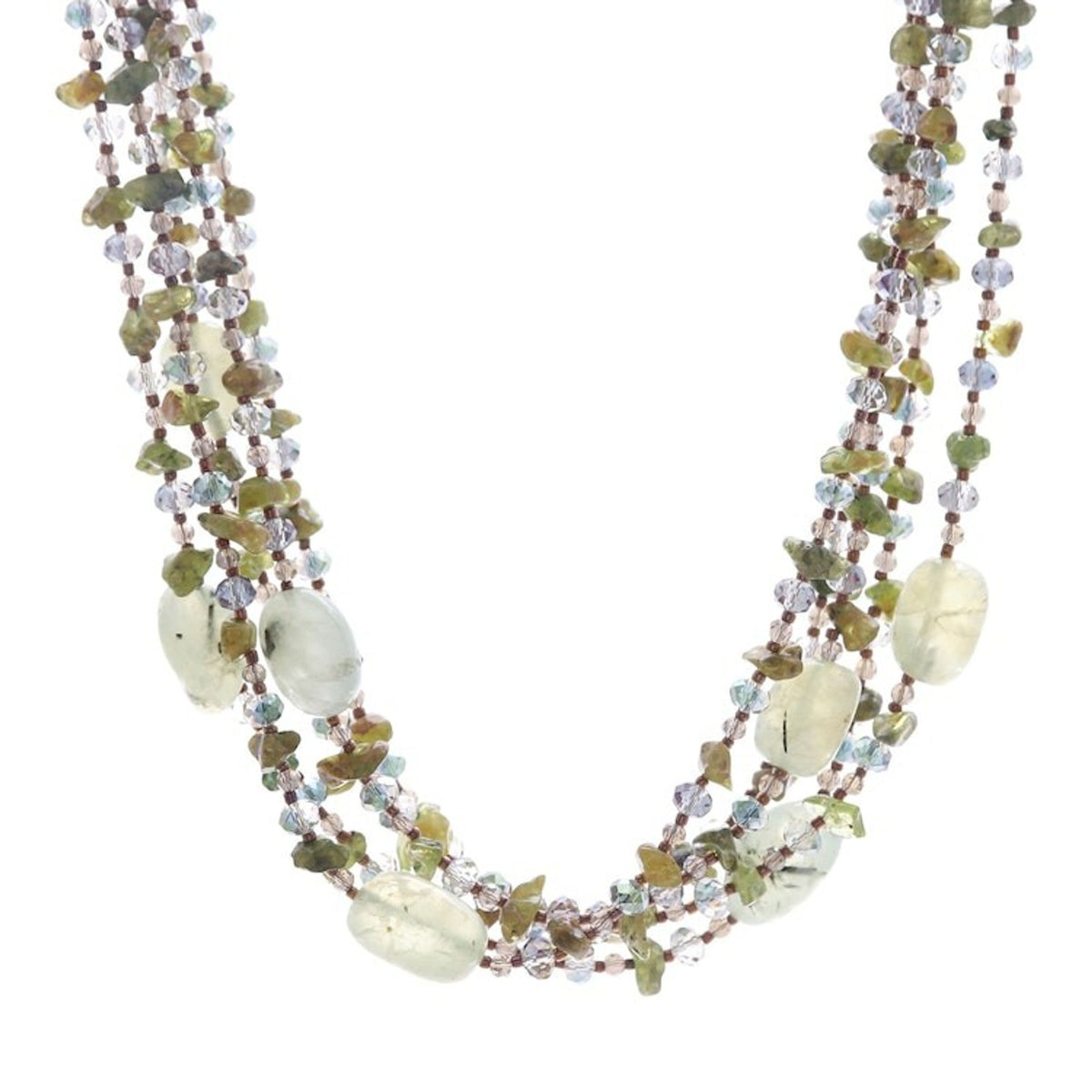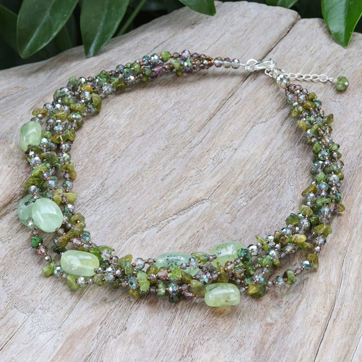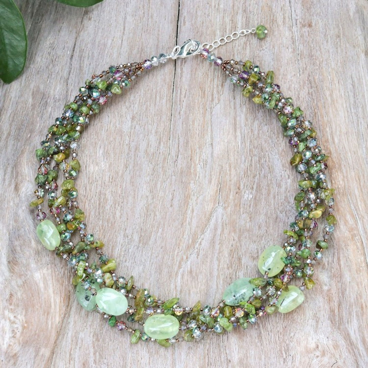 Handcrafted in prehnite, peridot, glass beads, and silver-plated brass fixtures, this necklace weighs 0.18 lbs. The necklace measures 15 inches L x 1.6 inches W, with a 1.6-inch extender and a lobster claw clasp. The hand-crafted item's color, size, and/or motif may vary slightly, and the natural stone's color and variegation will vary.