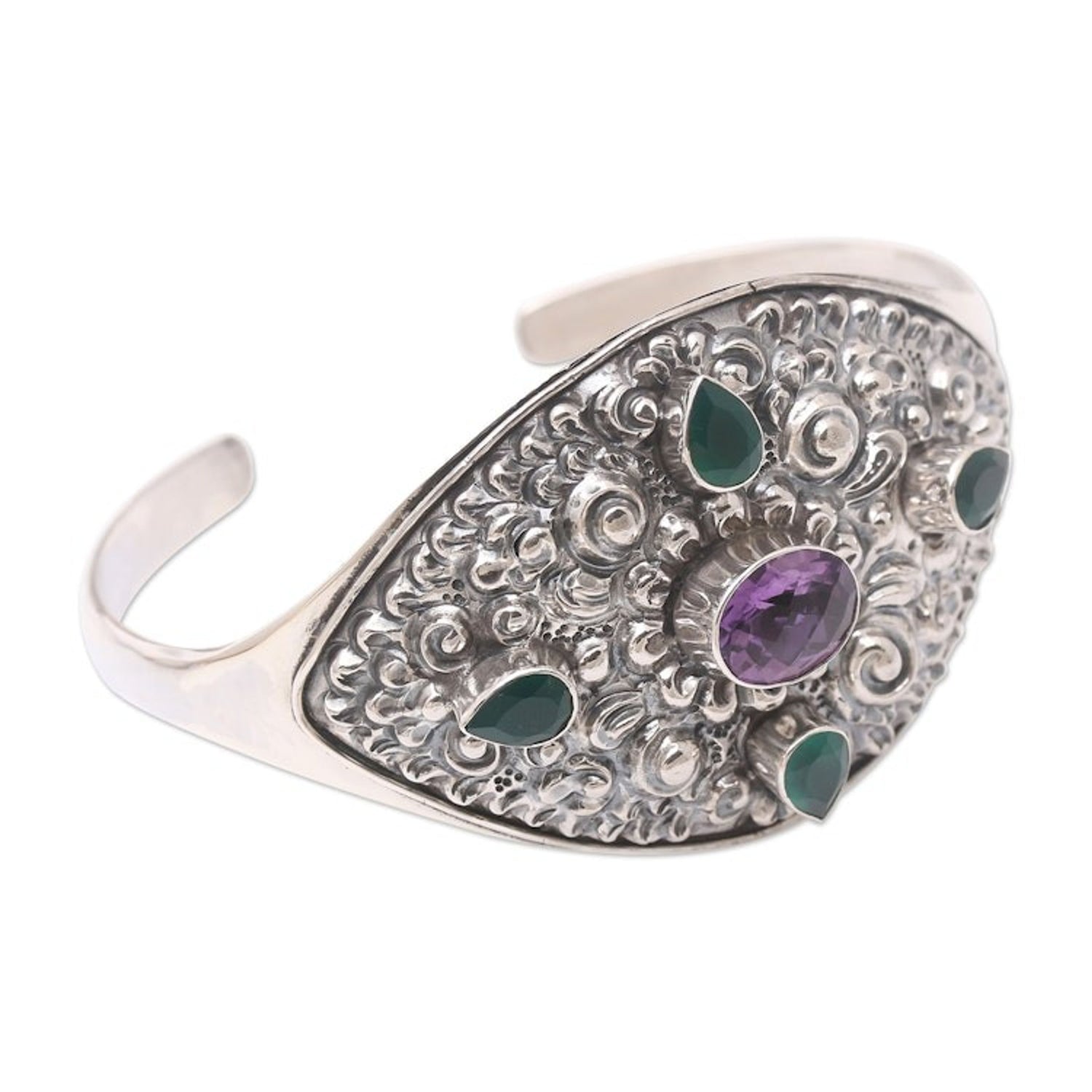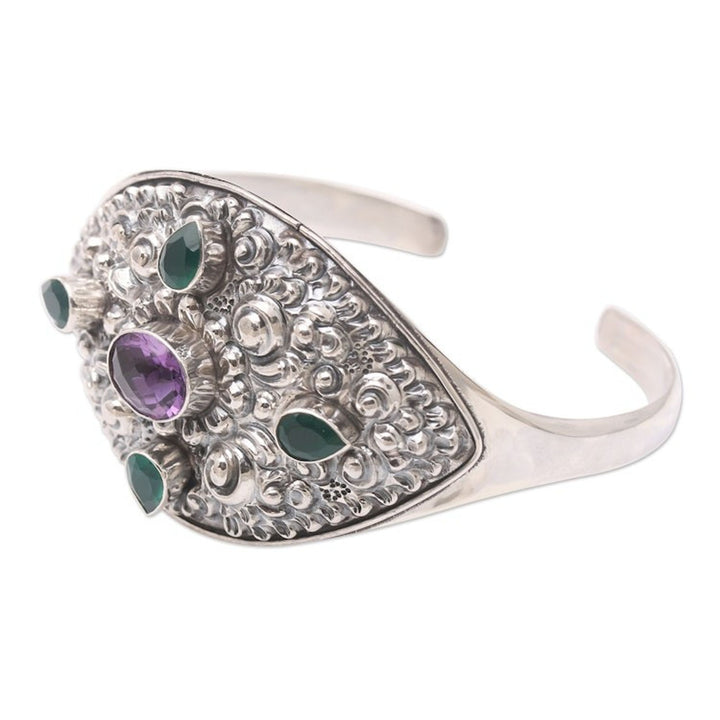 This Green Quartz and Amethyst Cuff Bracelet from Bali 'Elephant Cave in Forest' by Dewi Putera is a stunning cuff bracelet crafted using tatahan, an ancient Indonesian silversmithing technique. The large pendant is encrusted with faceted amethyst and vibrant green quartz stones. Her work celebrates Balinese culture and emphasizes the unique beauty of handmade silver jewelry.