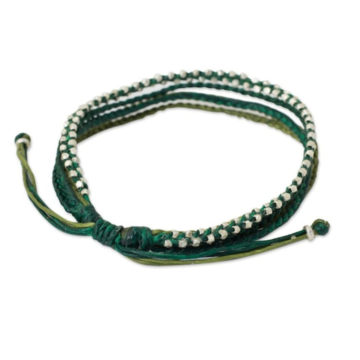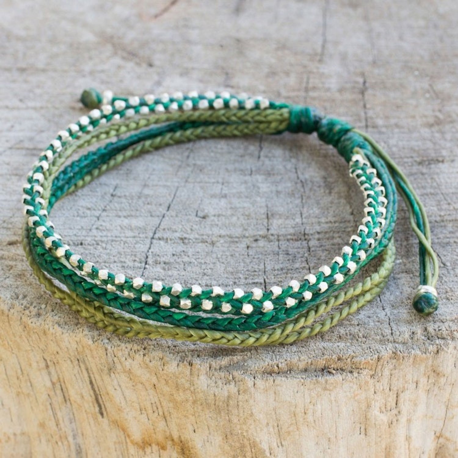 This Hand Crafted Cord Wristband Bracelet with Silver Beads 'Fresh Green' by Napapat is a hand-braided five-strand wristband bracelet with fresh shades of green and luminous silver accents. It is adjustable in length. Each of her creations reflects patience, imagination, and heartfelt artistry.