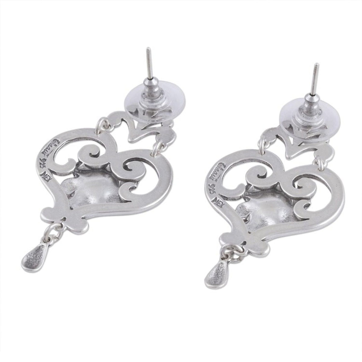 These Hand Crafted Floral Sterling Silver Dangle Earrings 'Daisy Hearts' by Gianluca Anzani are dangle earrings with a glistening design. Crafted of sterling silver in a rustic finish, they feature daisies centering glowing hearts. He focuses on silver jewelry created with the lost-wax process.