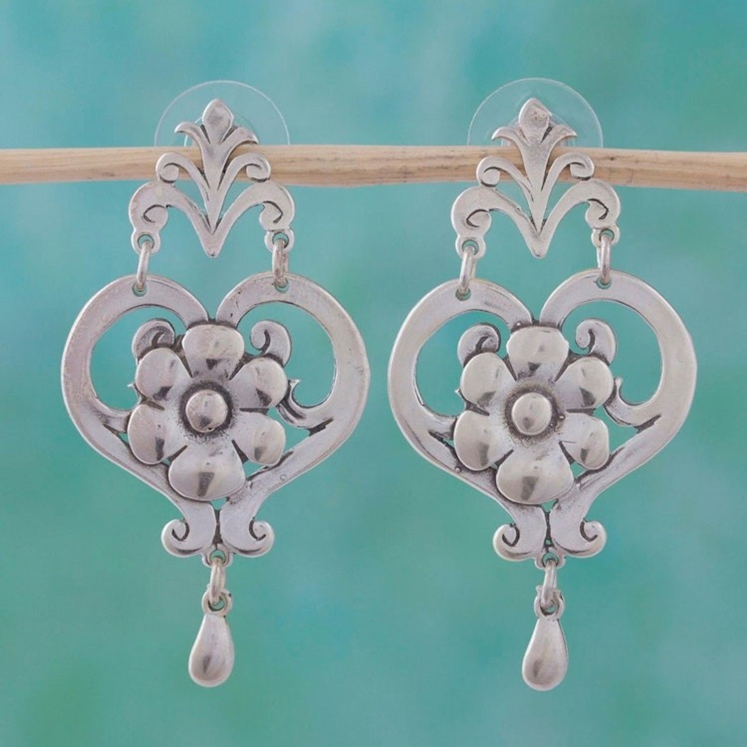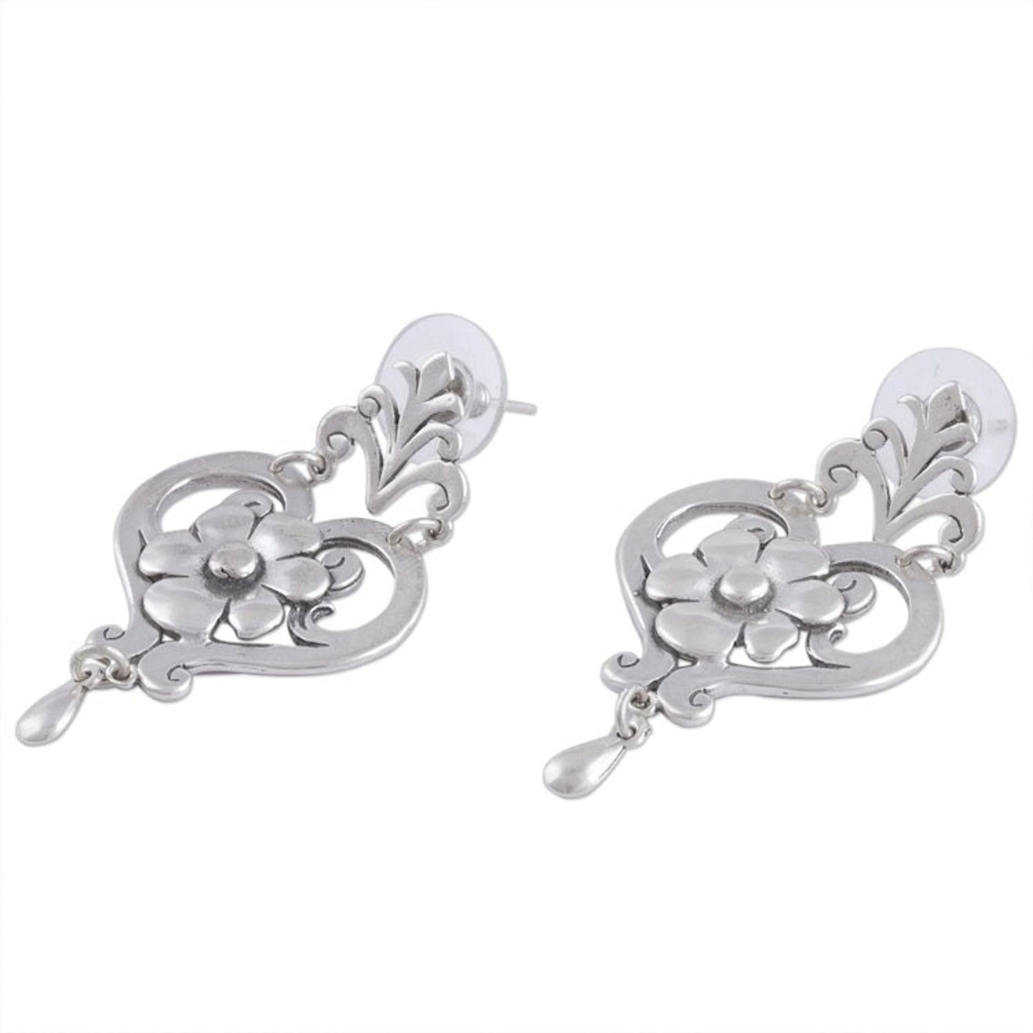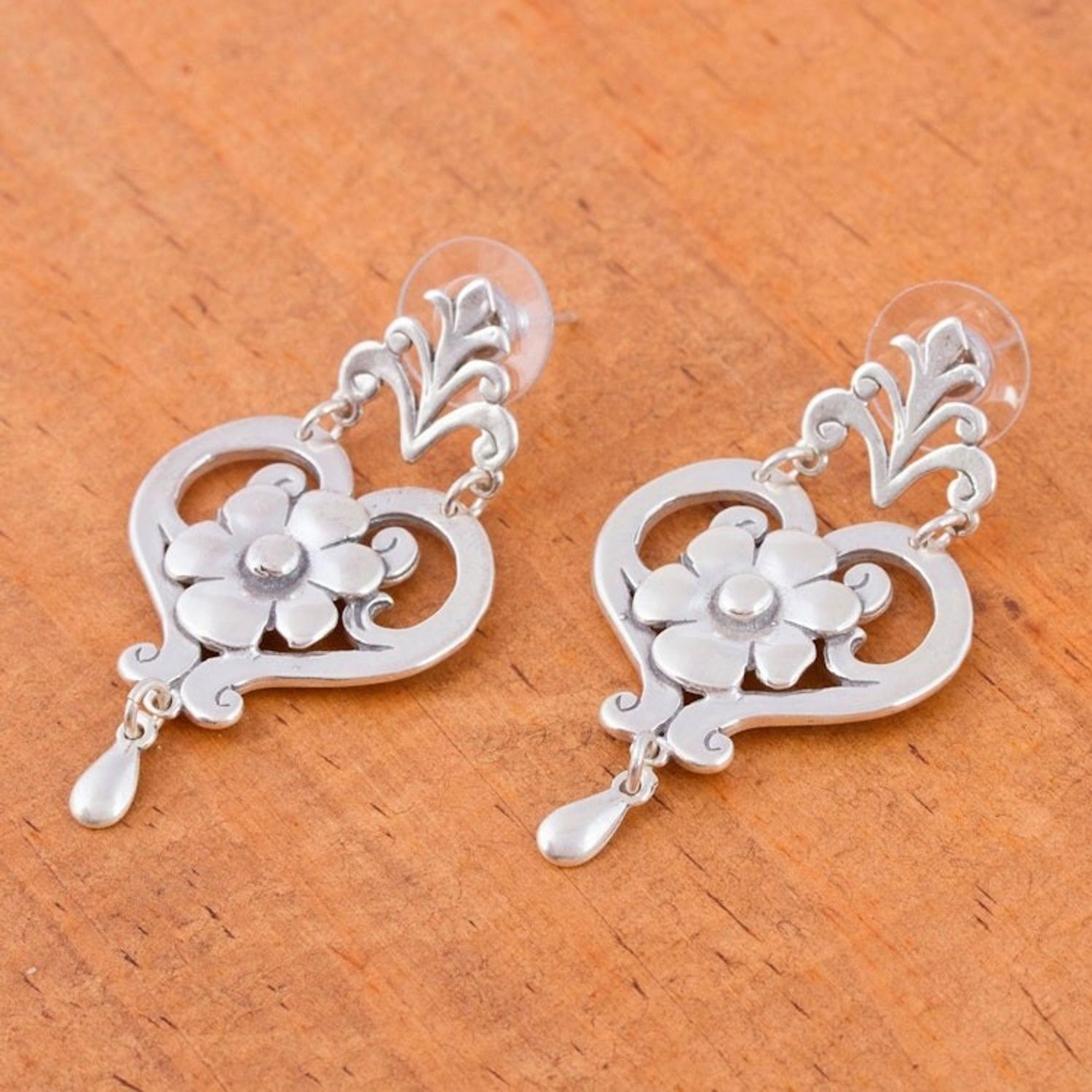 Hand Crafted Floral Sterling Silver Dangle Earrings 'Daisy Hearts'