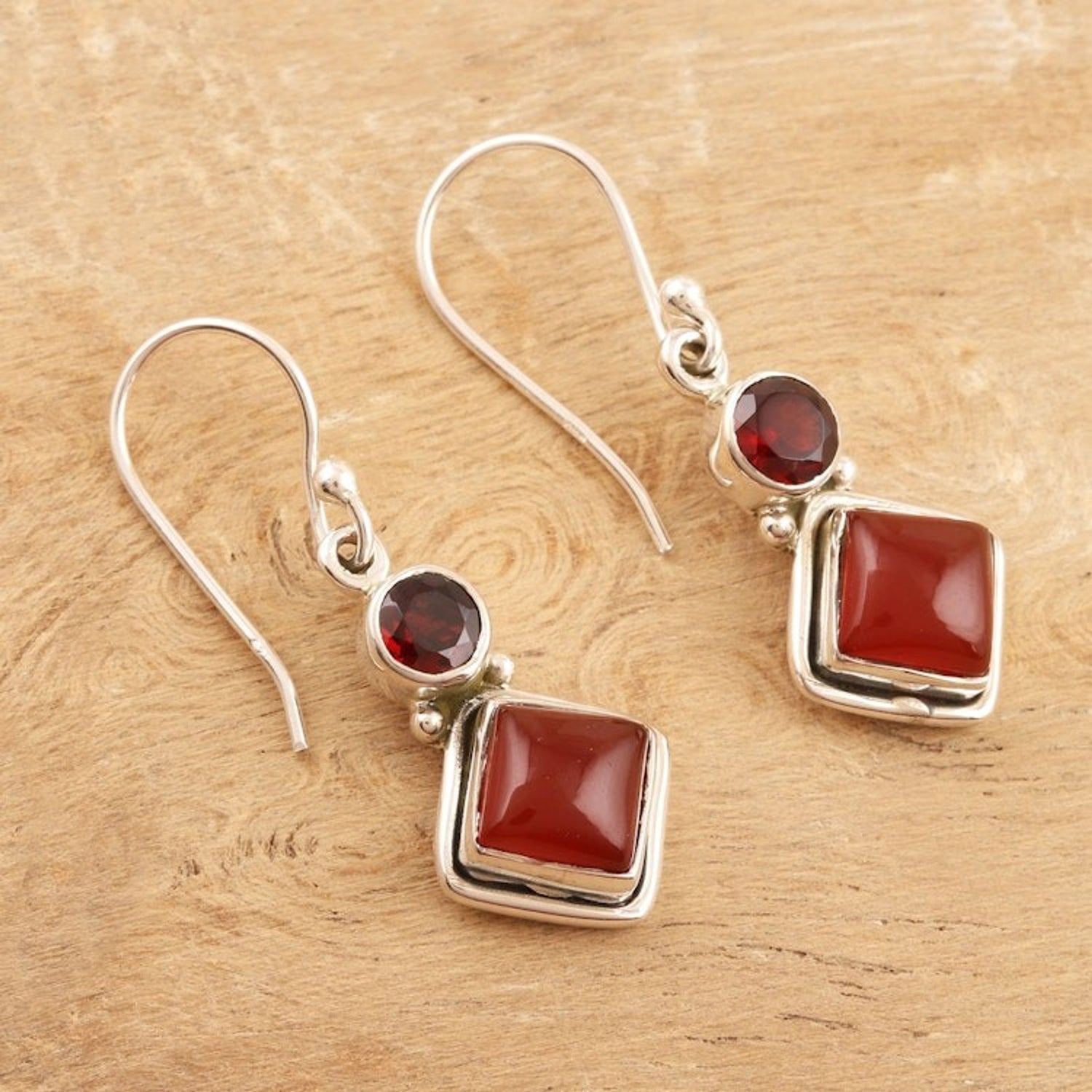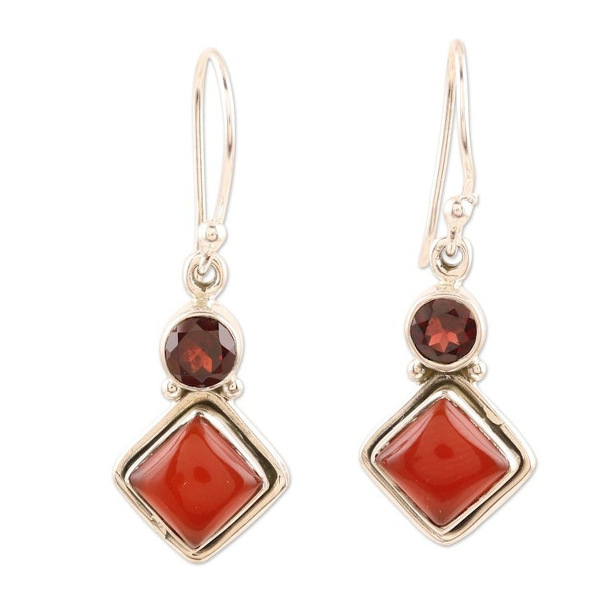 These Hand Crafted Garnet and Carnelian Gemstone Dangle Earrings 'Soaring Kite' by Shanker are lovely dangle earrings where a solitary garnet gemstone sits elegantly on a smooth, square-shaped carnelian gemstone. They feature sterling silver bezel settings and matching wire hooks. His commitment to quality and originality set him apart.