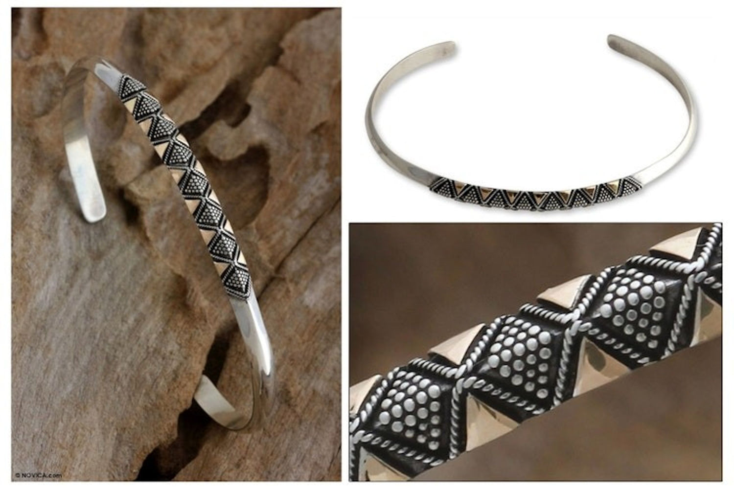 This Hand Crafted Gold Accent and Sterling Silver Cuff Bracelet 'Golden Garden' by Diah Arini is a cuff bracelet with classic motifs in a modern style. It is crafted by hand with sterling silver featuring oxidized contrasts and detailed in 18k gold plate. Her workshop provides livelihoods to relatives and community members.