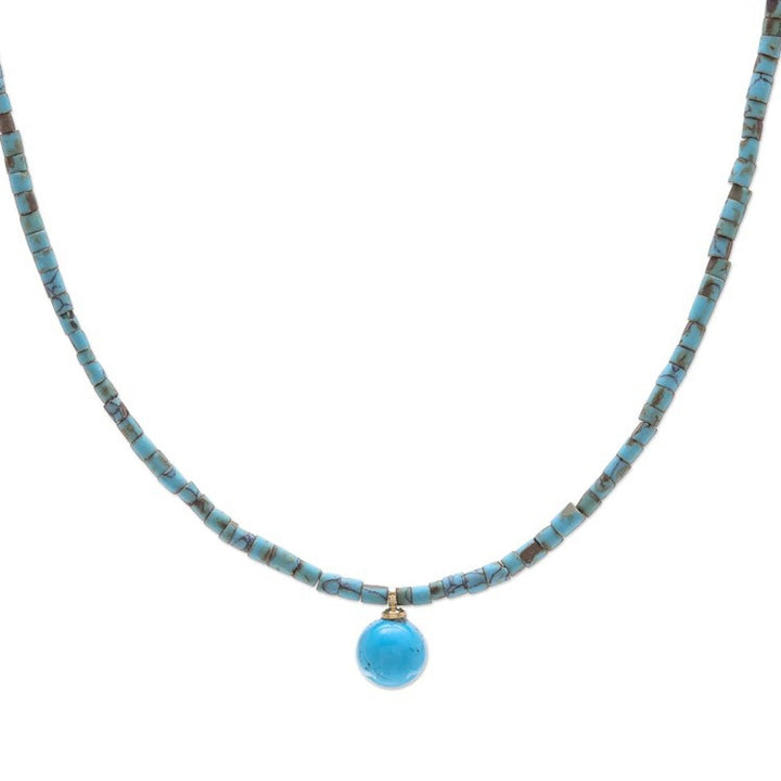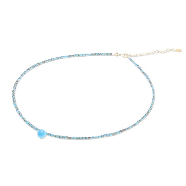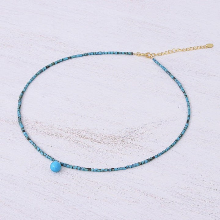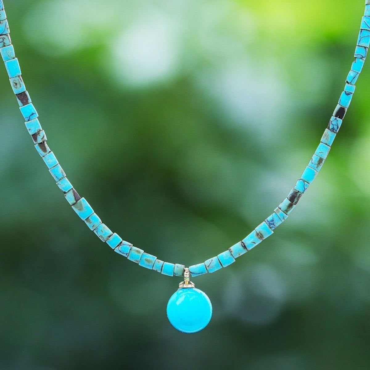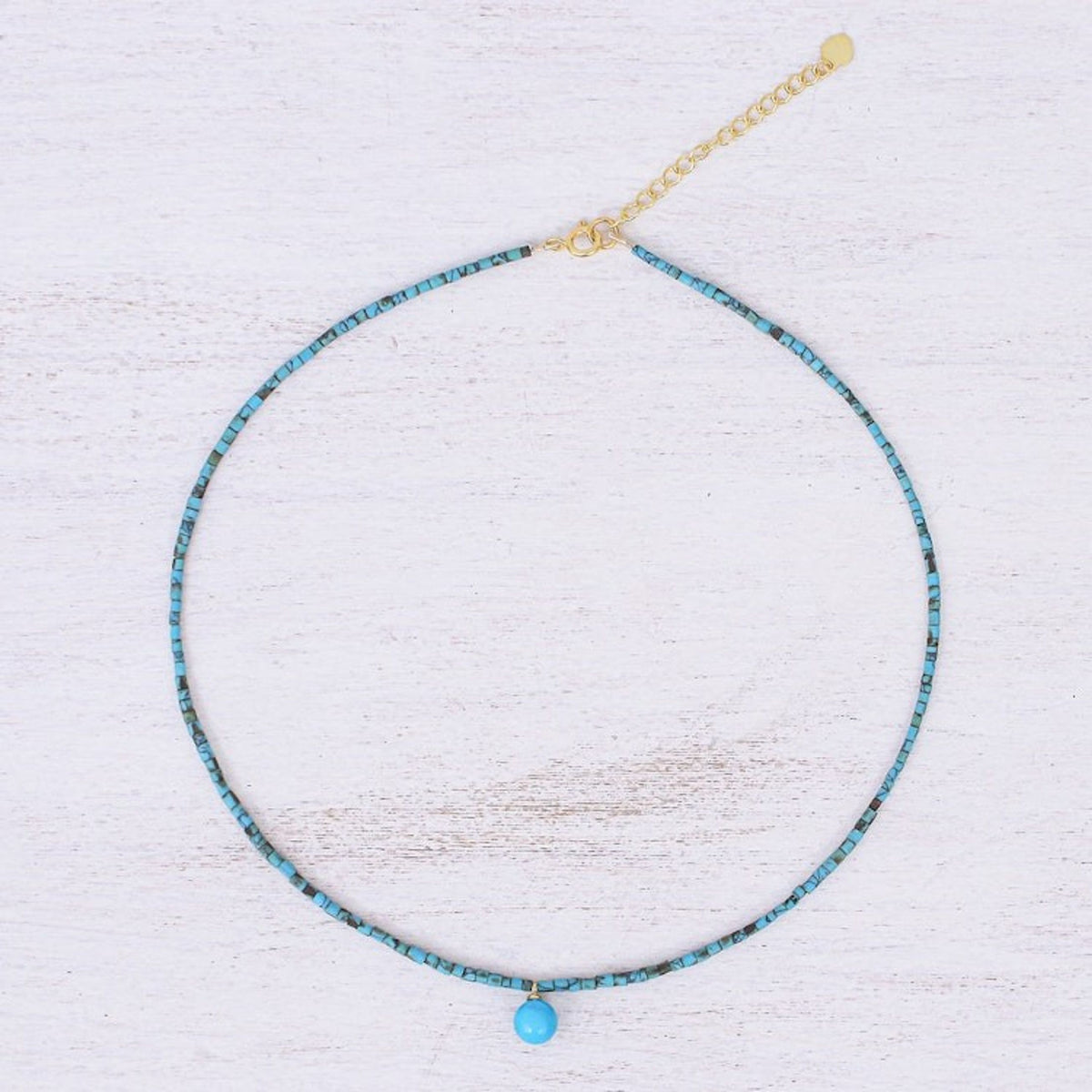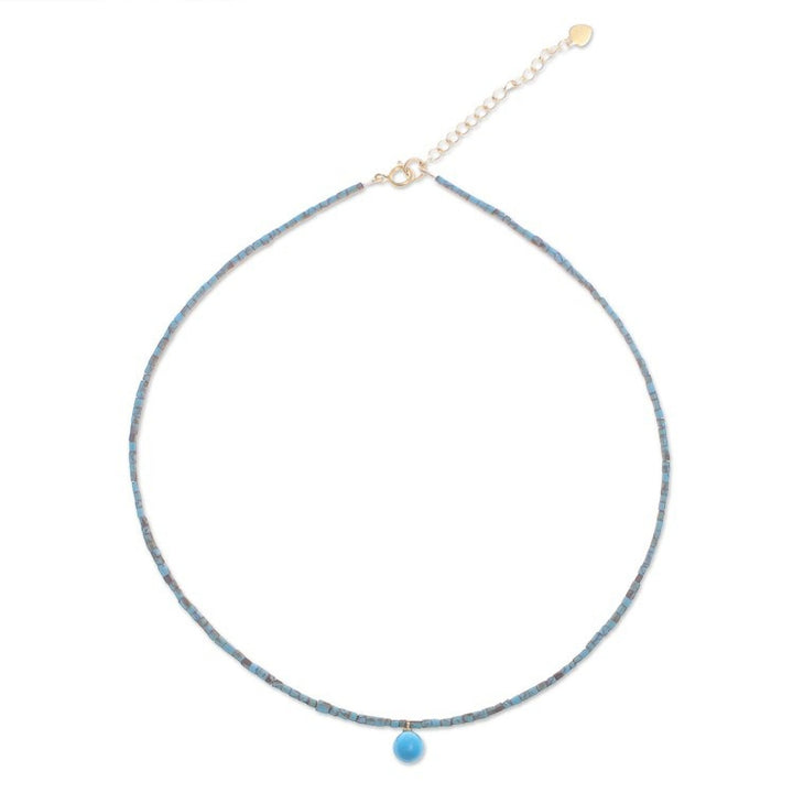 This Hand Crafted Gold-Plated Magnesite Pendant Necklace 'Before Dawn in Turquoise' by Srimuang is a beaded necklace with a lovely magnesite globe that hangs from the center. The artisan creates the necklace from tiny, cylindrical reconstituted turquoise beads and an 18k gold-plated 925 sterling silver spring ring clasp. She is inspired by nature, travel, and Thai traditions.