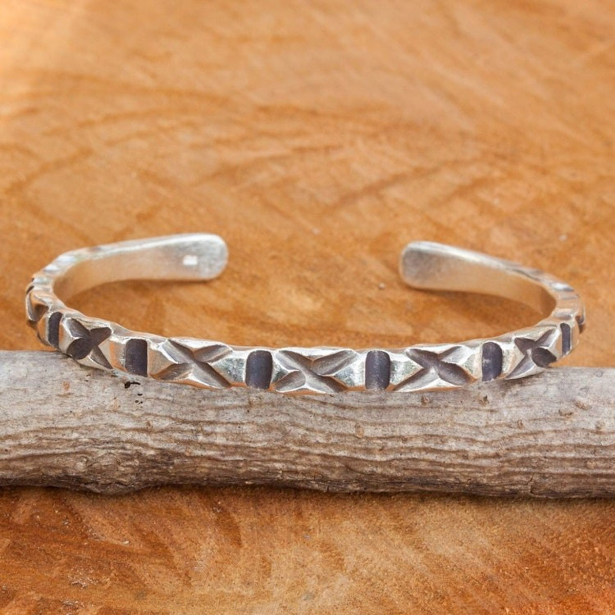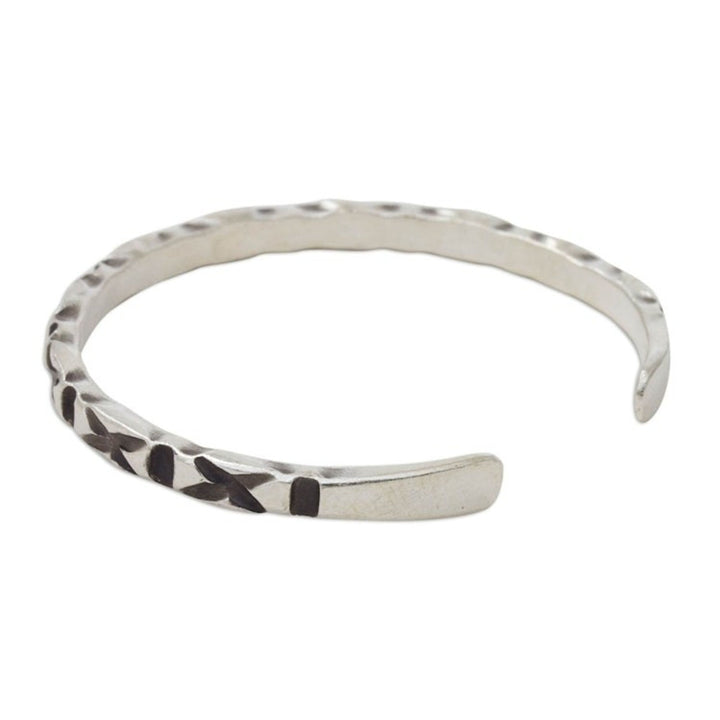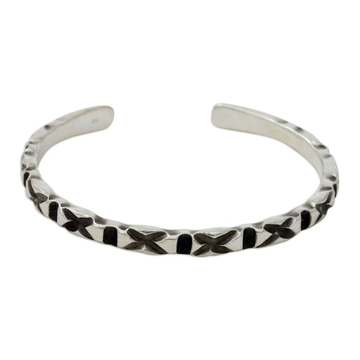 This Hand Crafted Hill Tribe Sterling Silver Cuff Bracelet 'Karen Kisses' by Achara reveals the artistry of Thailand's Karen hill tribe. It is a slender cuff with beautiful 'X' patterns that evoke kisses. The artist works with her husband, Withaya, to uplift and preserve the traditions of the hill tribe artisans.