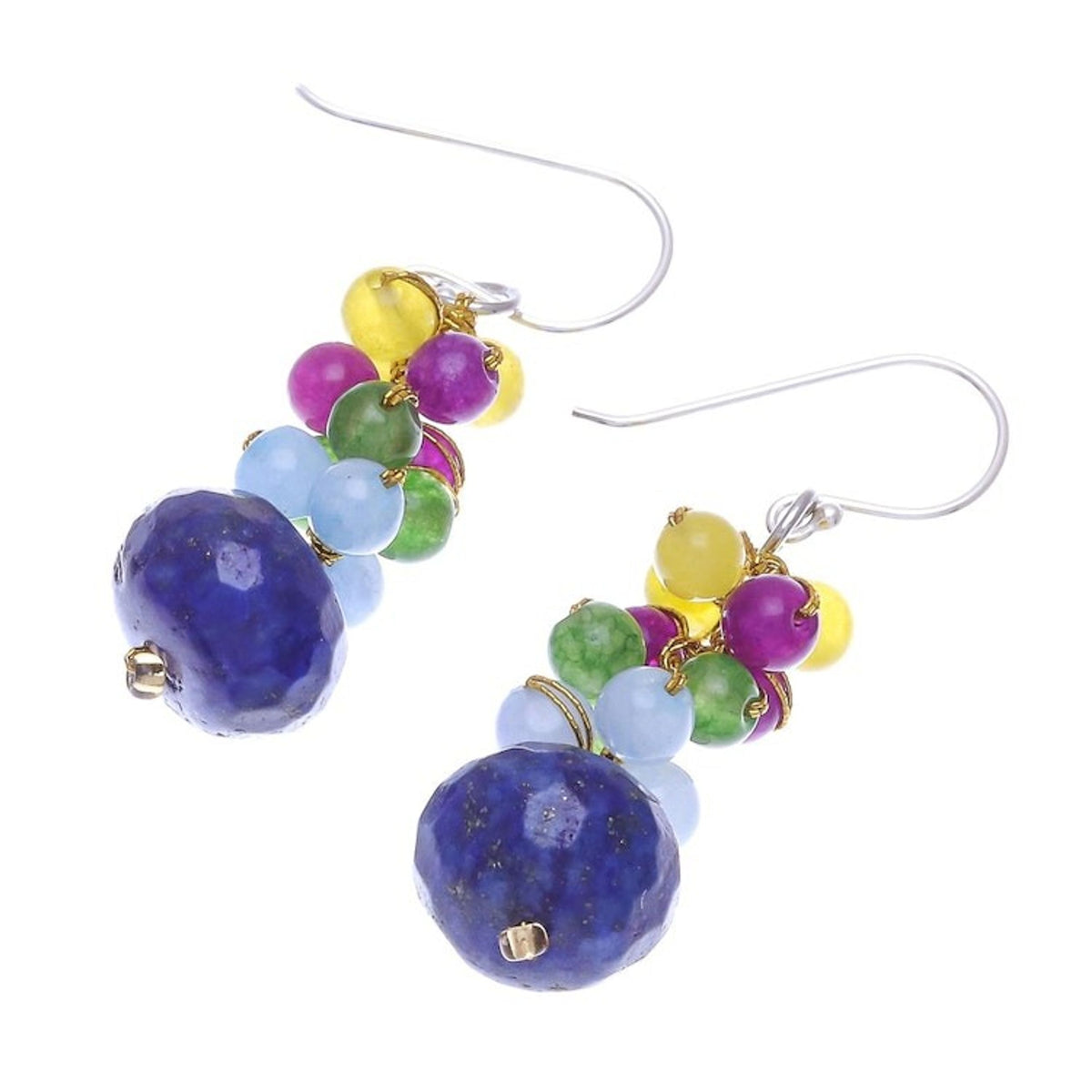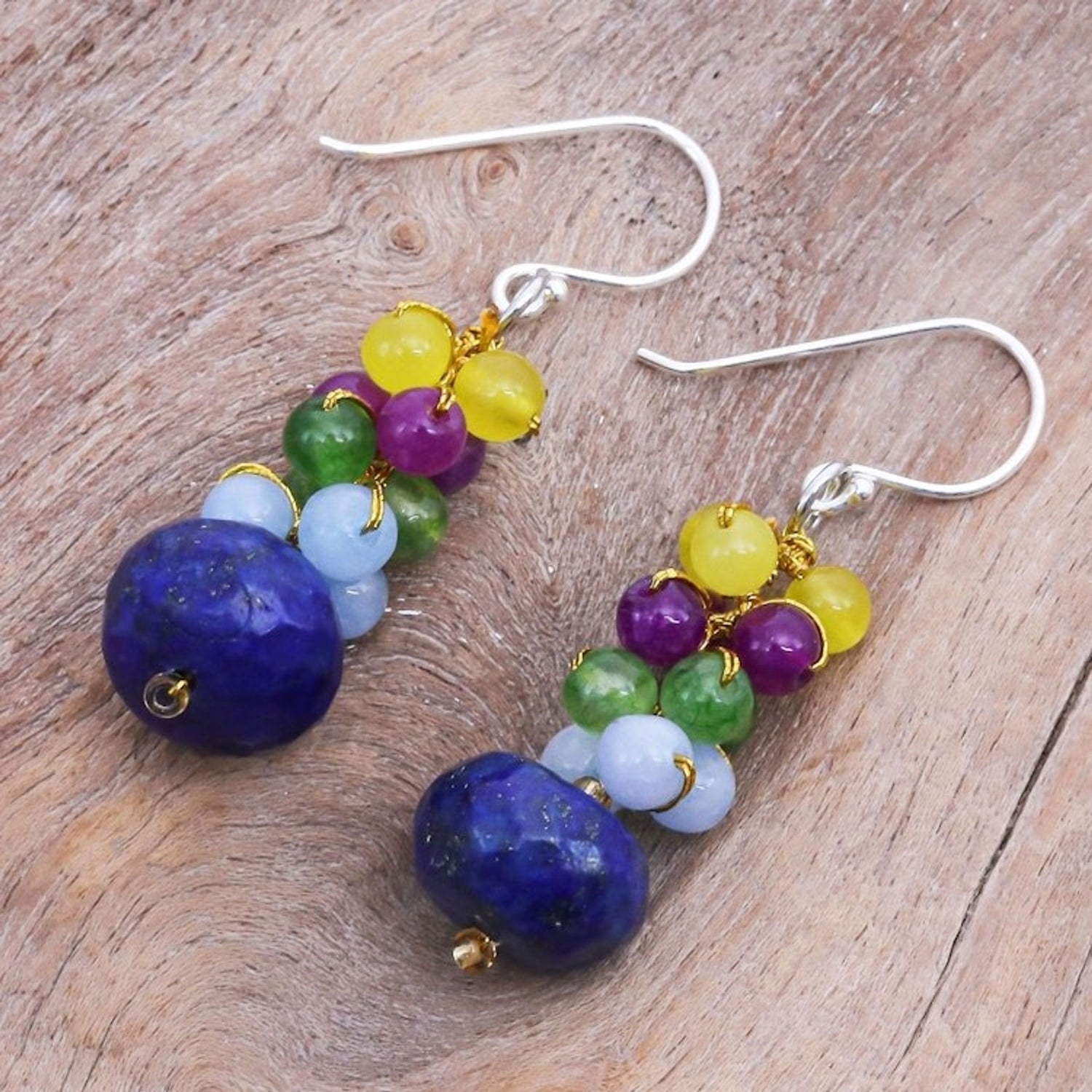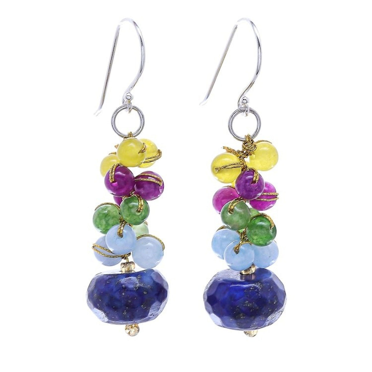 These Hand Crafted Lapis Lazuli and Quartz Dangle Earrings 'Sky Rainbow' by Nareerat are colorful dangle earrings with clusters of dyed quartz beads threaded by hand with gold metallic thread, while a deep blue lapis lazuli gemstone hovers below. Shining sterling silver hooks complete the stunning pair. Her mission is to keep the art of handmade jewelry alive for future generations.