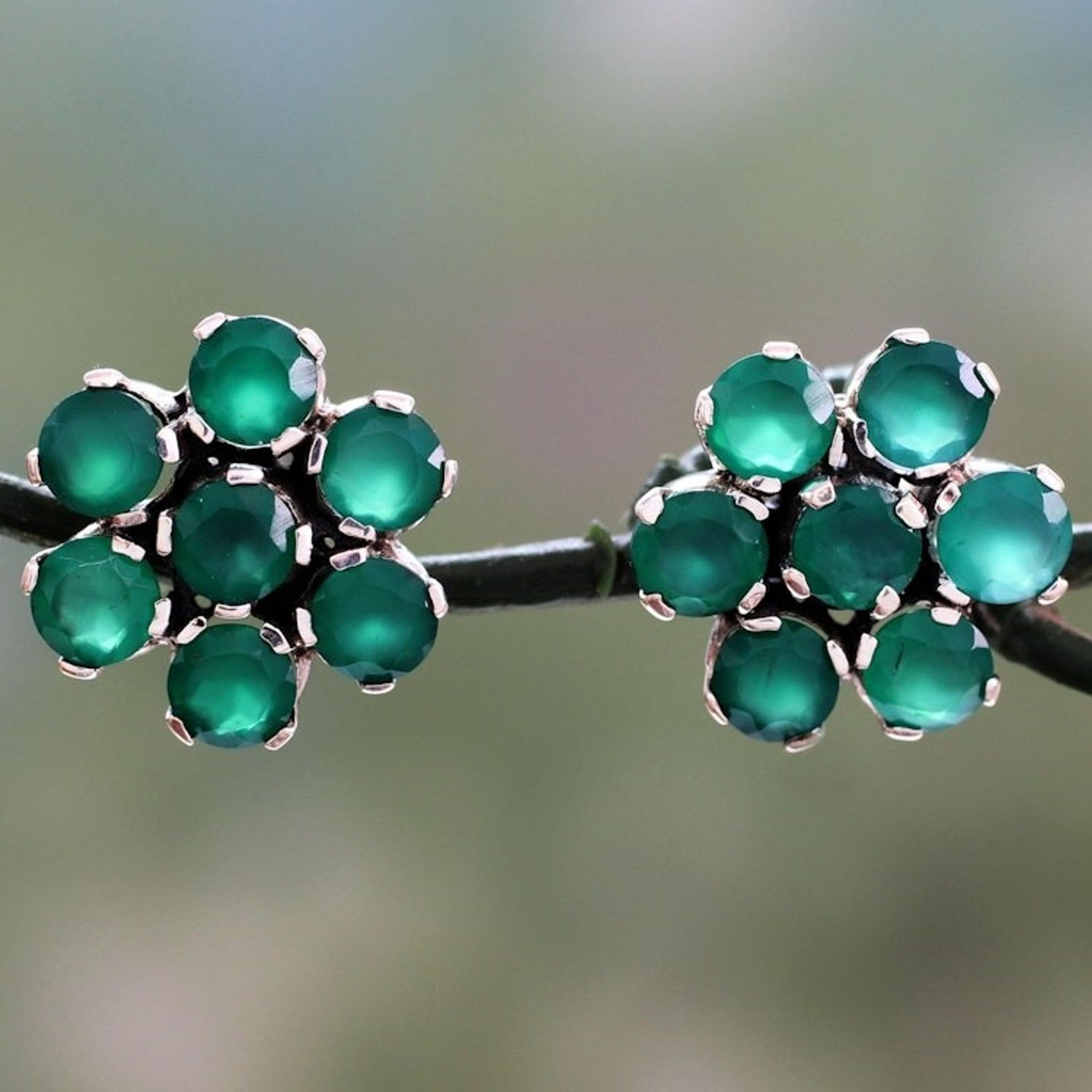 These Hand Crafted Onyx and Sterling Silver Floral Button Earrings 'Green Blossom' by Shanker are a pair of button earrings with seven carats of green onyx that form two dainty little flower blossoms. They are created using sterling silver and dyed onyx. Each piece represents perseverance, tradition, and passion for his craft.